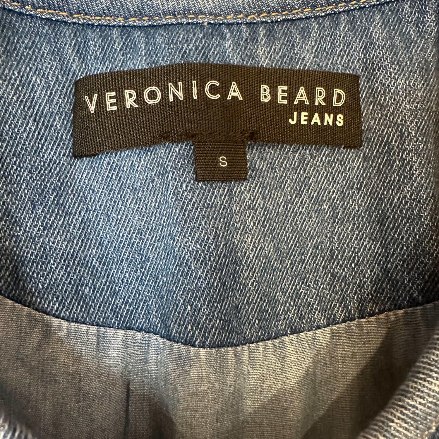 Veronica Beard denim jacket. Collarless. Branded snap button closure at front. Designer size small.
