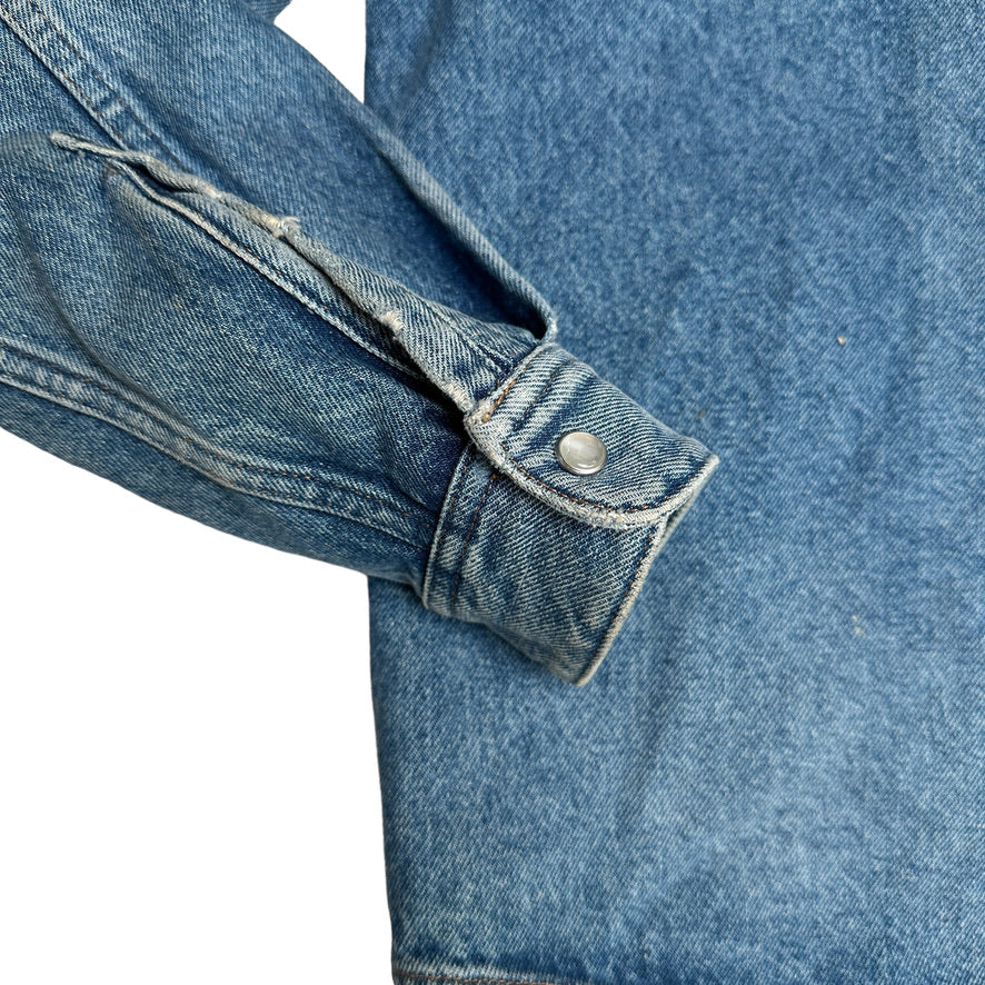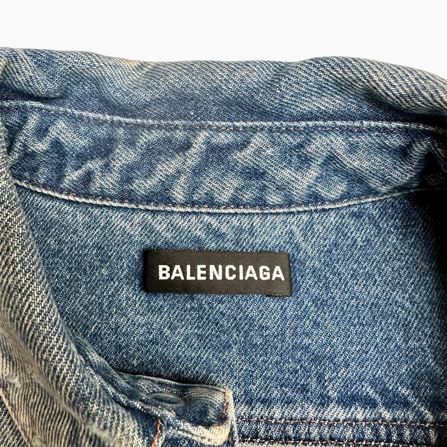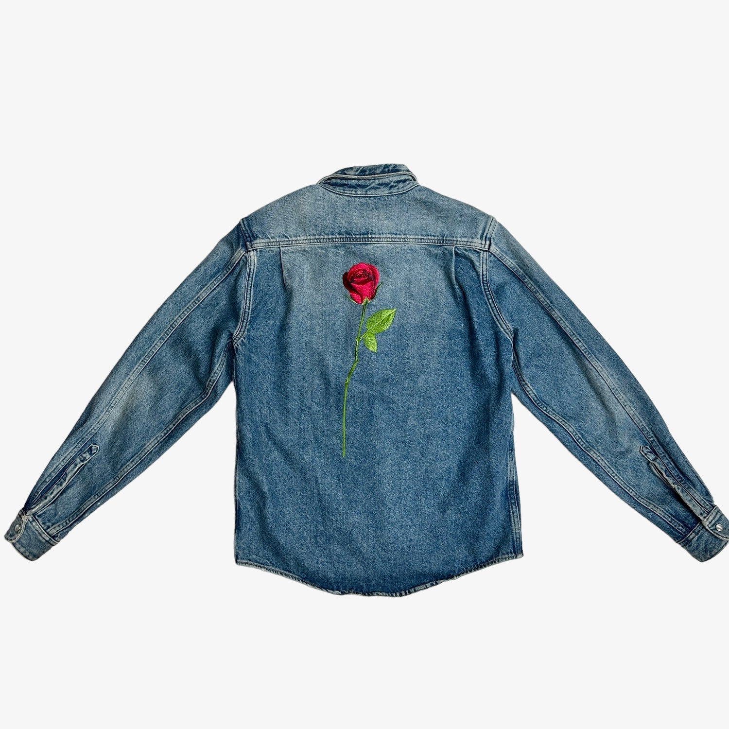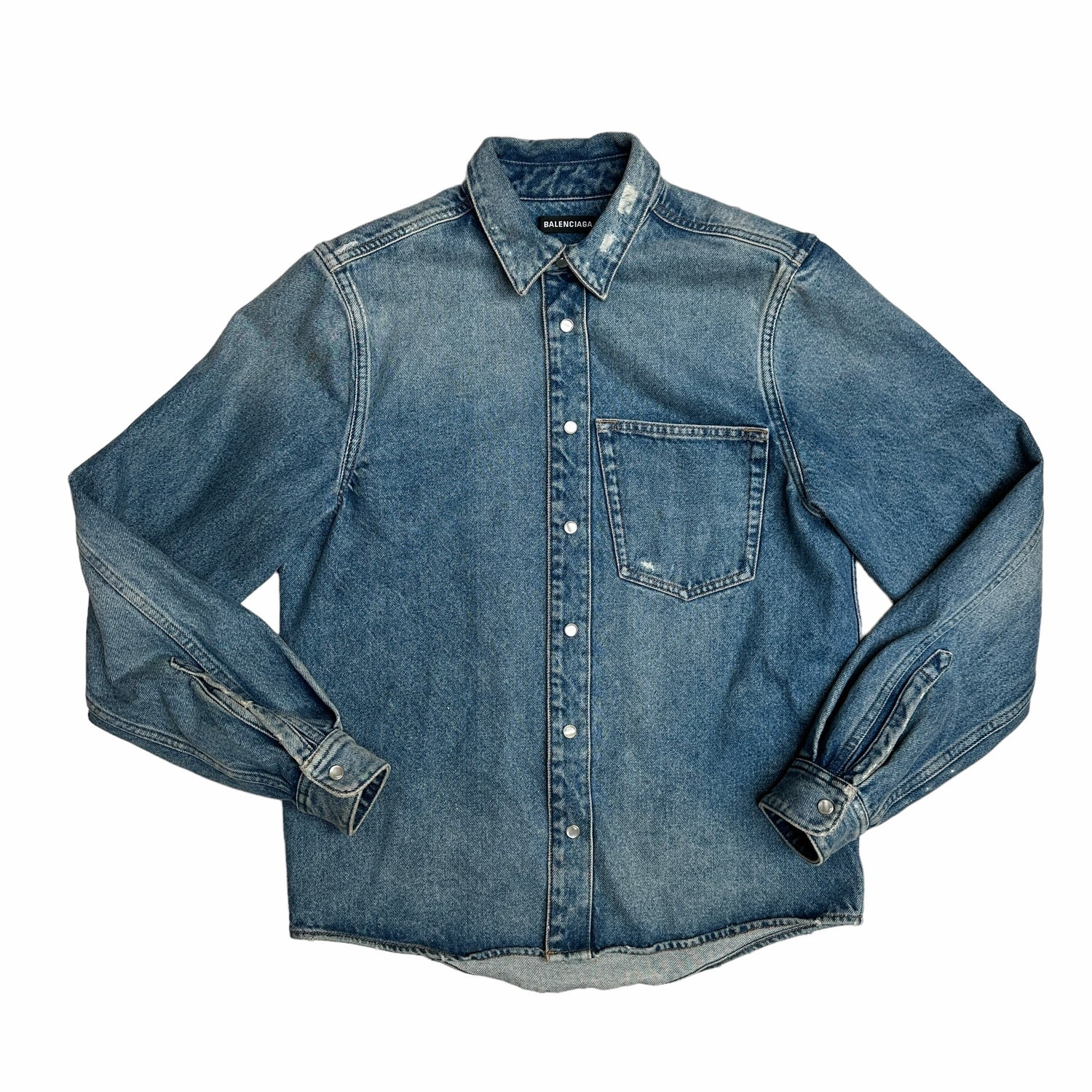 Balenciaga denim shirt. Rose embroidered at back. Pointed collar. Snap buttons closure at front. From the 2018 Collection by Demna Gvasalia. Long sleeves with one-button rounded cuffs. Patch pockets at front. Lightweight. Designer size 38.
