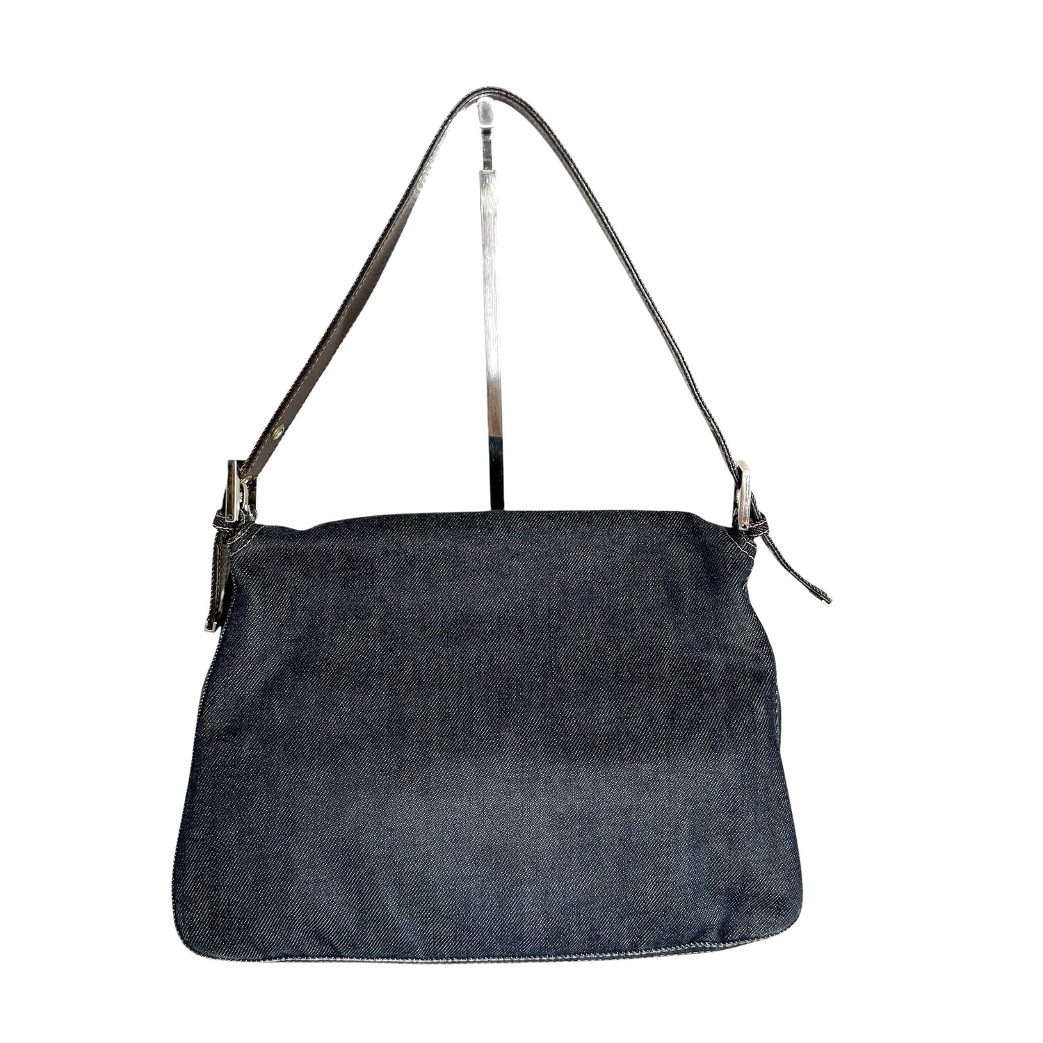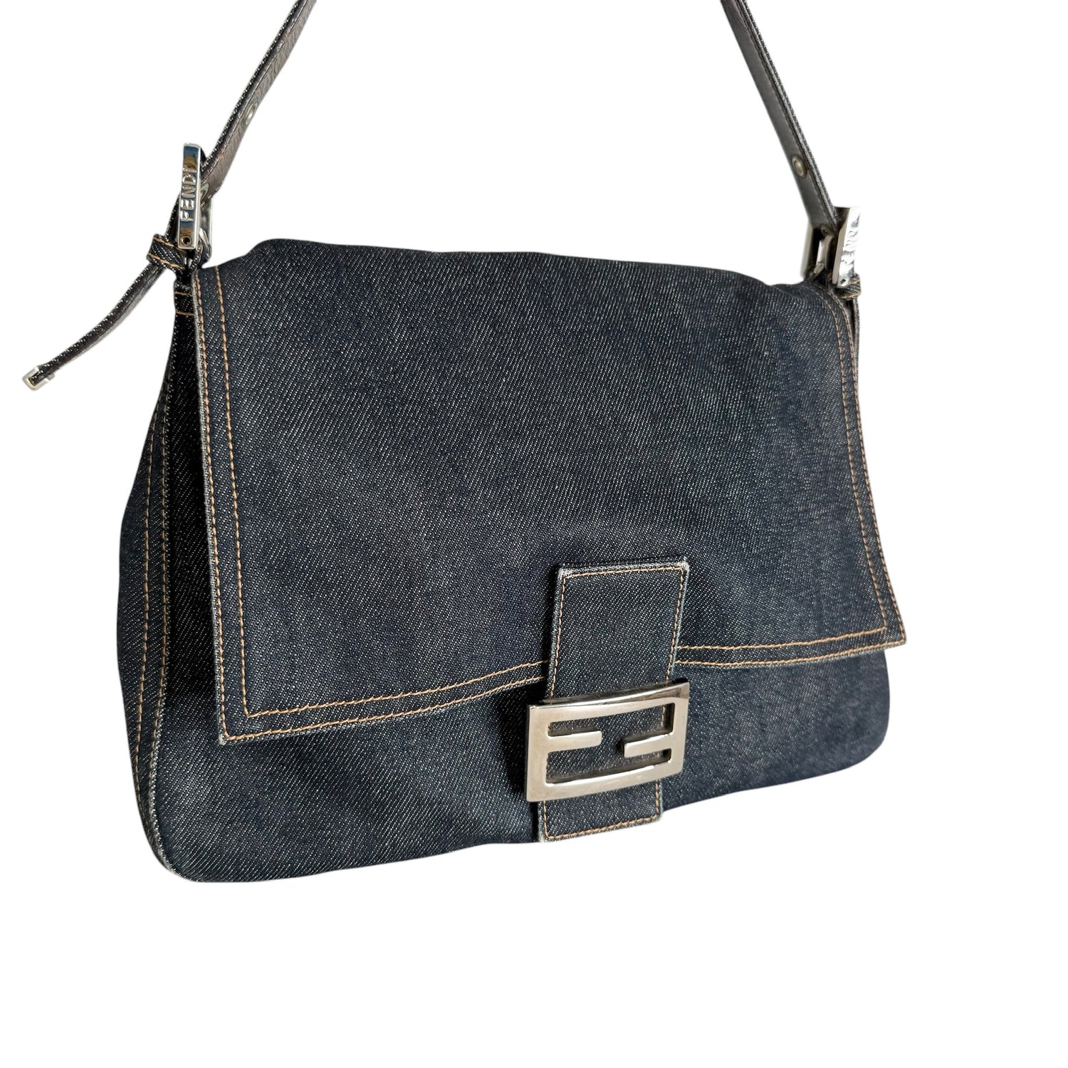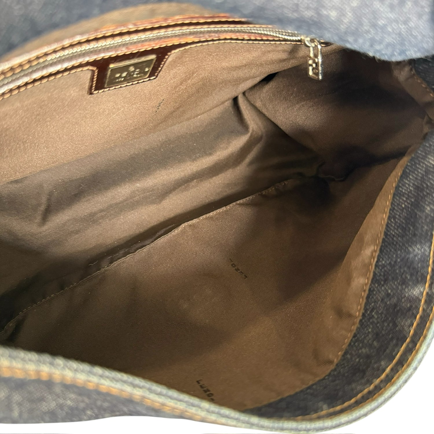 Fendi denim mama baguette bag. Silver tone hardware. Magnetic snap closure at top. Brown canvas lining. One interior pocket.