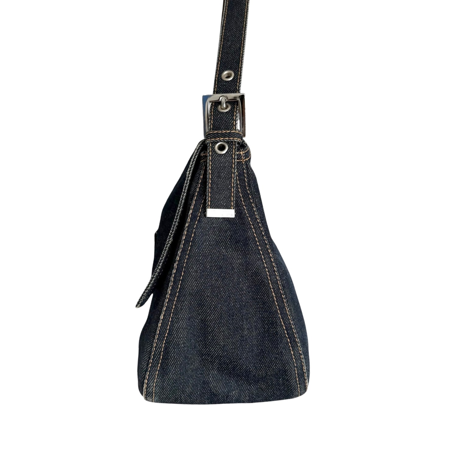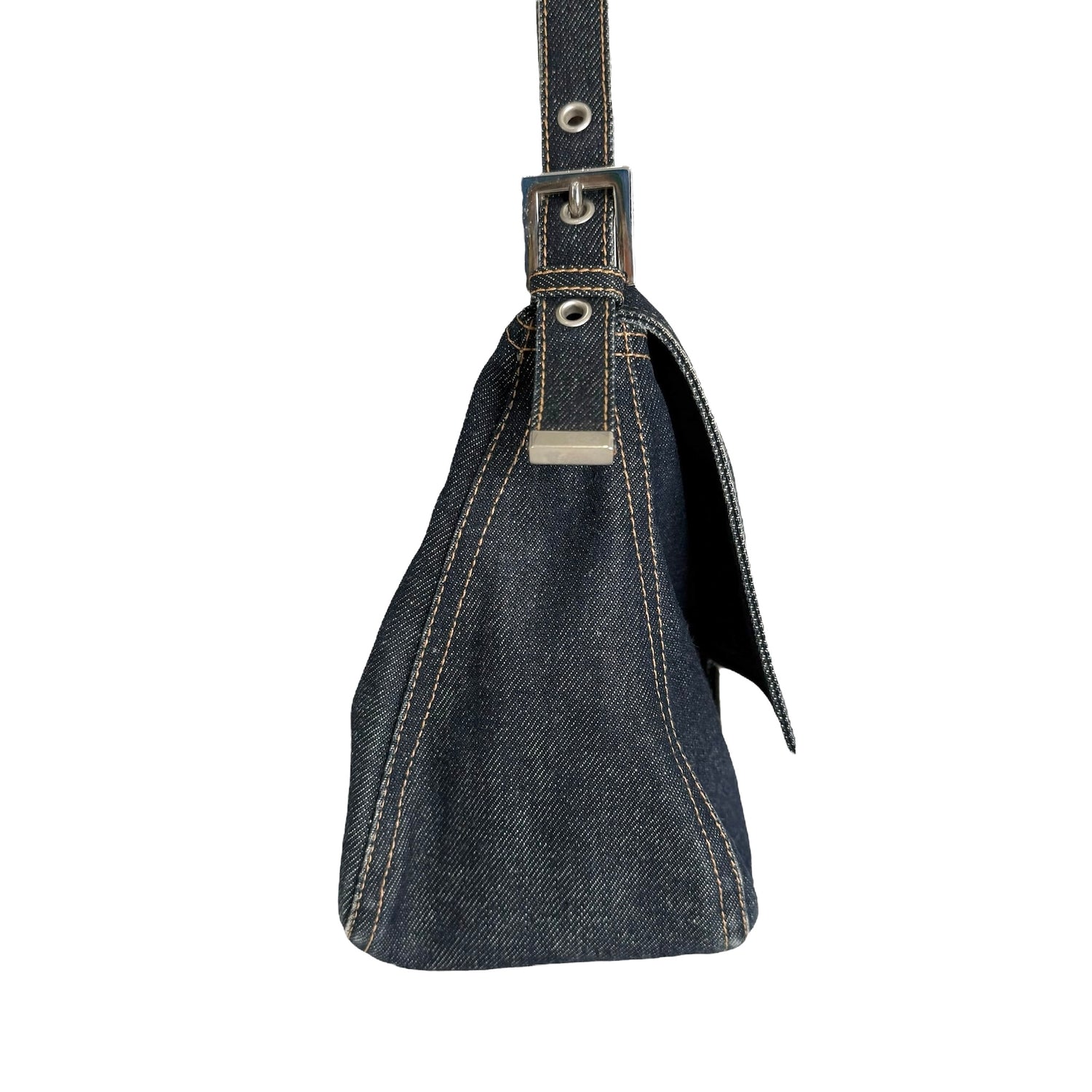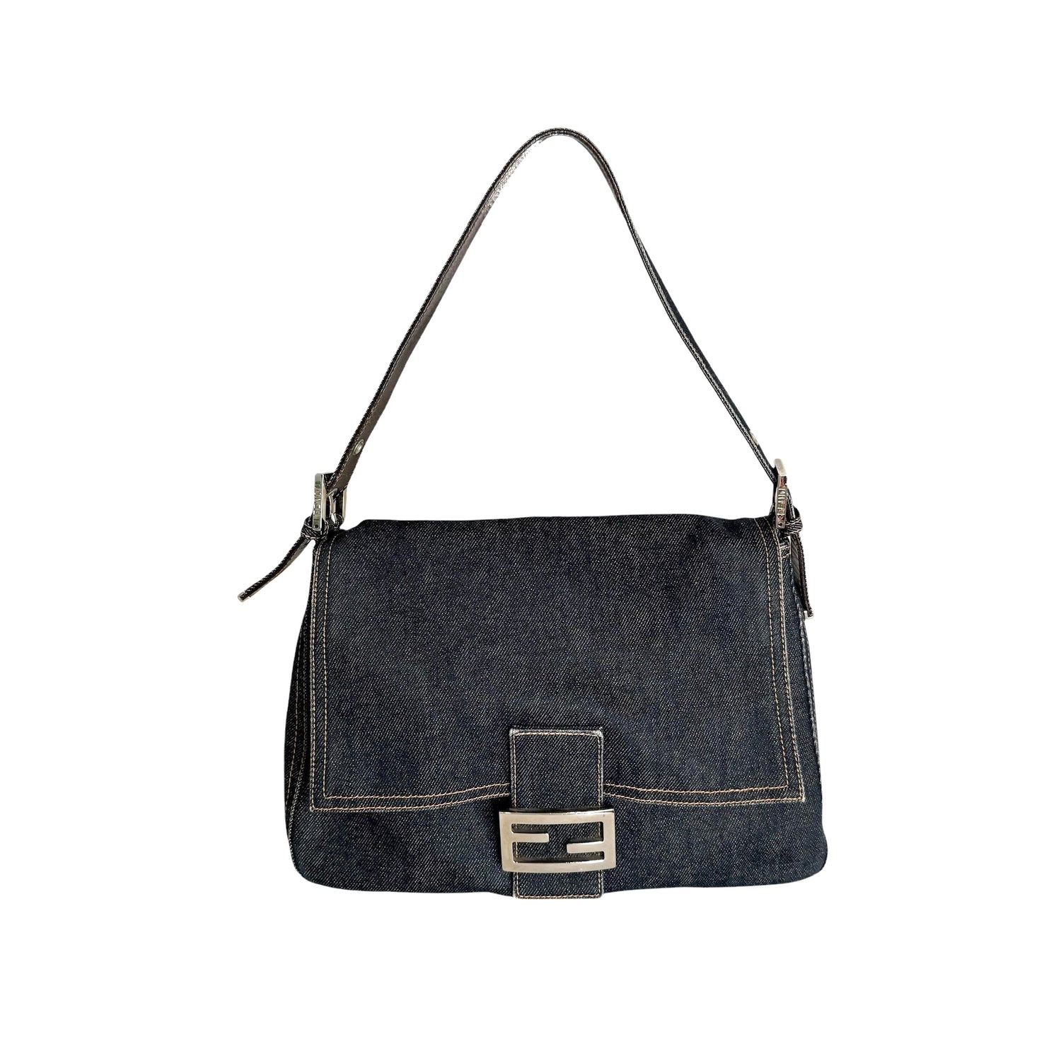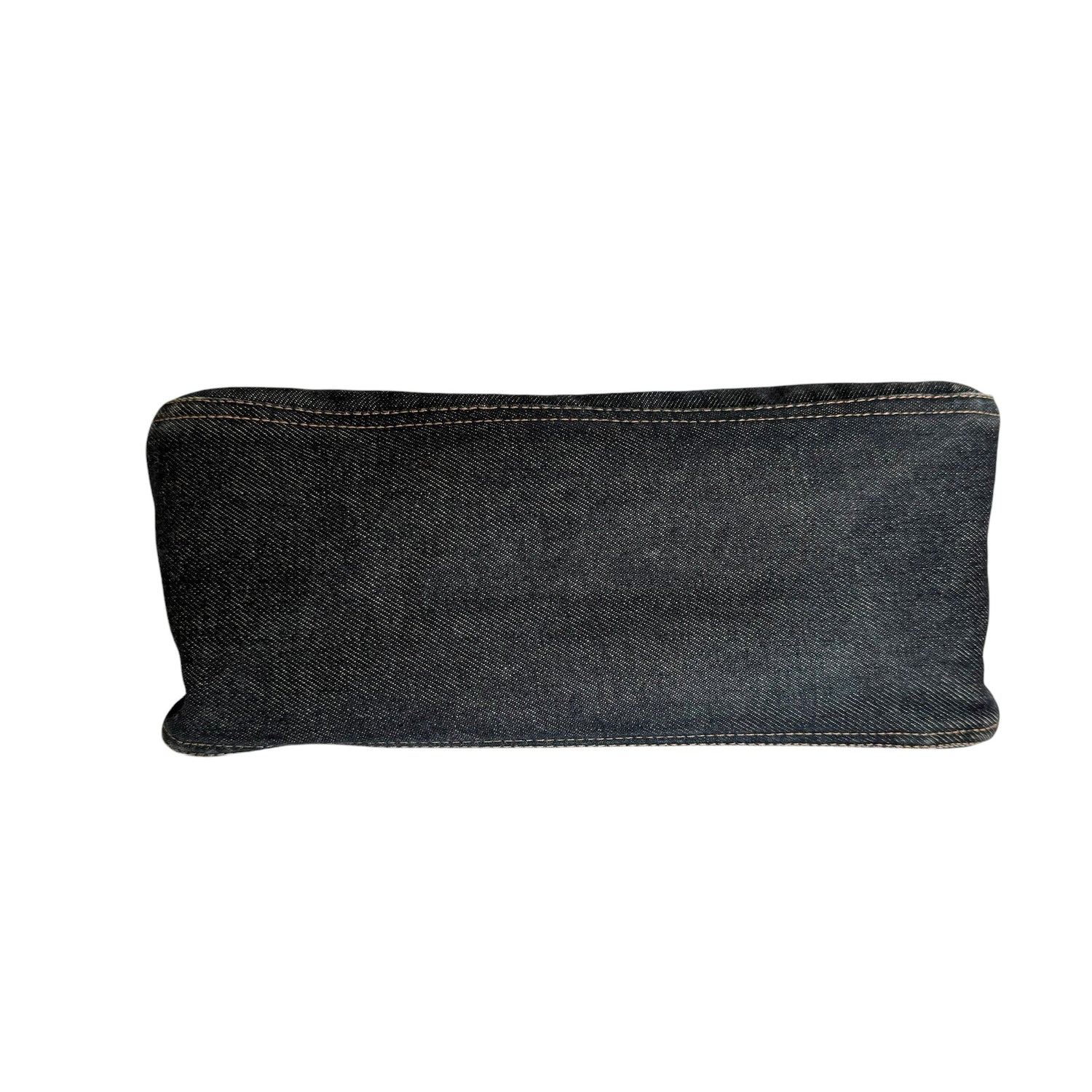Fendi denim mama baguette bag. Silver tone hardware. Magnetic snap closure at top. Brown canvas lining. One interior pocket.