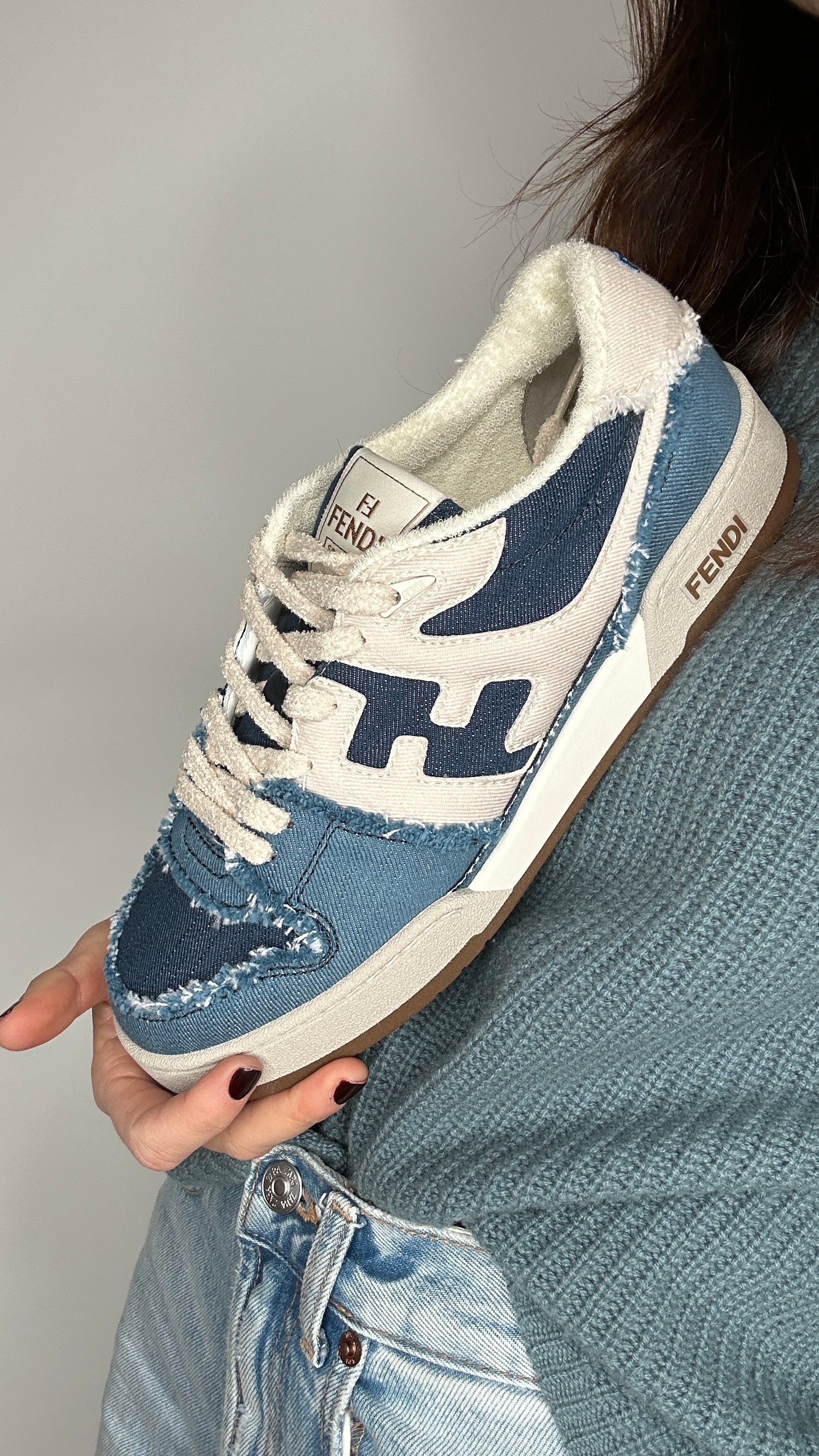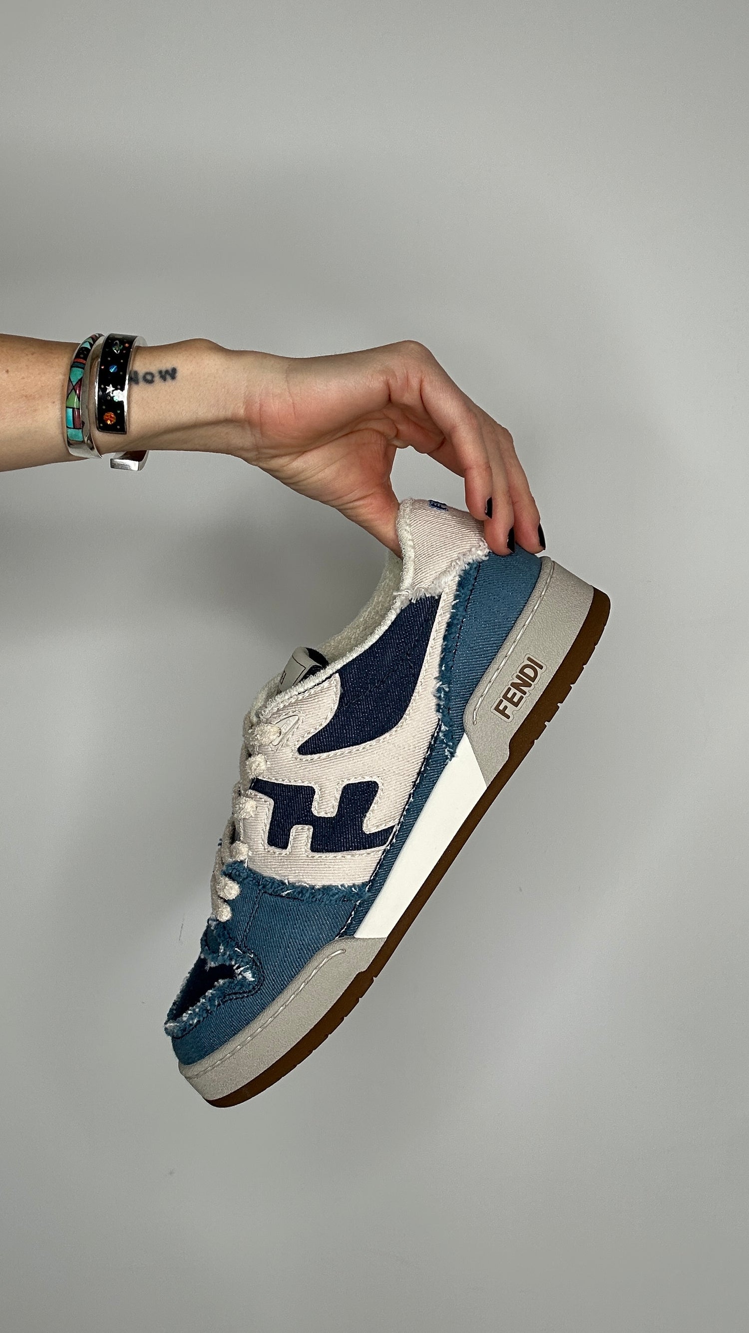 Fendi denim sneakers. Logo at sides. Raw edge details. Blue and cream canvas. Designer size 38.5