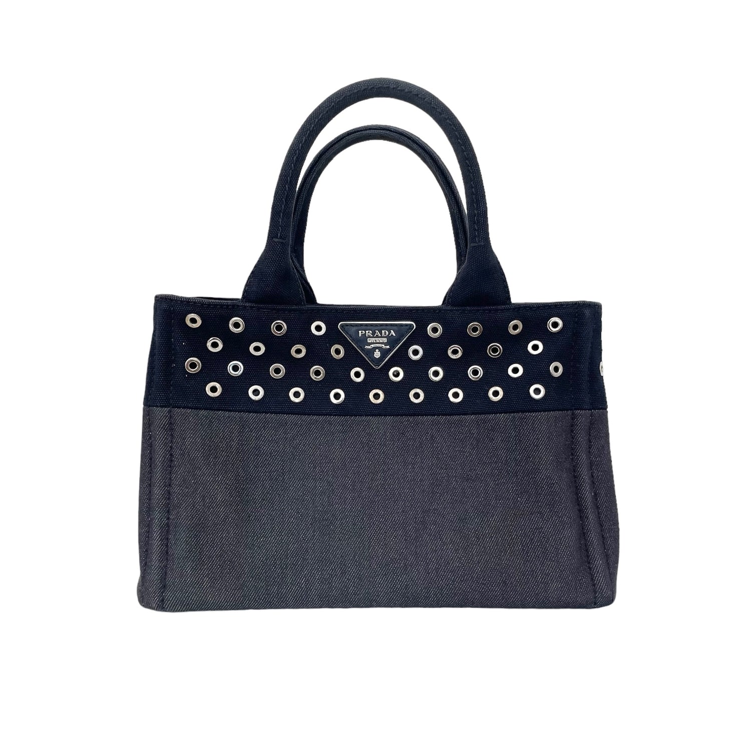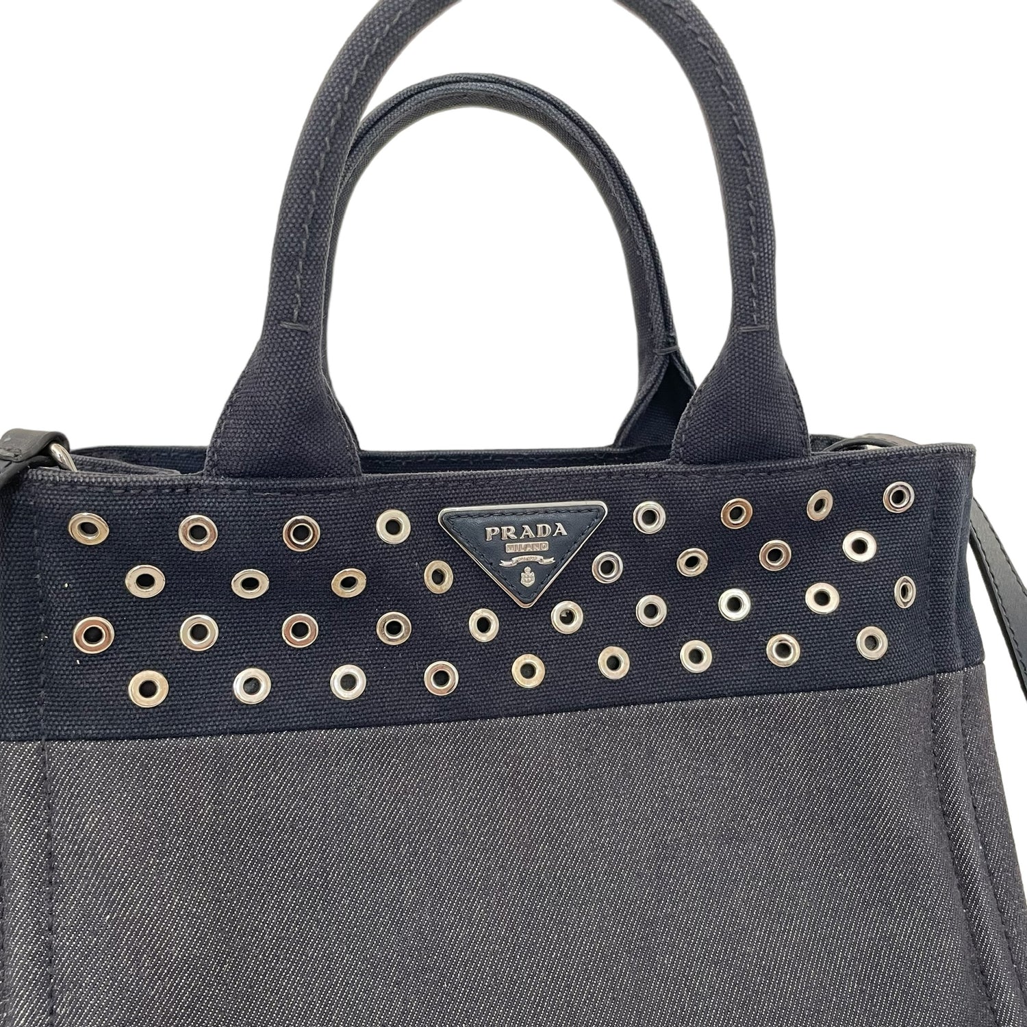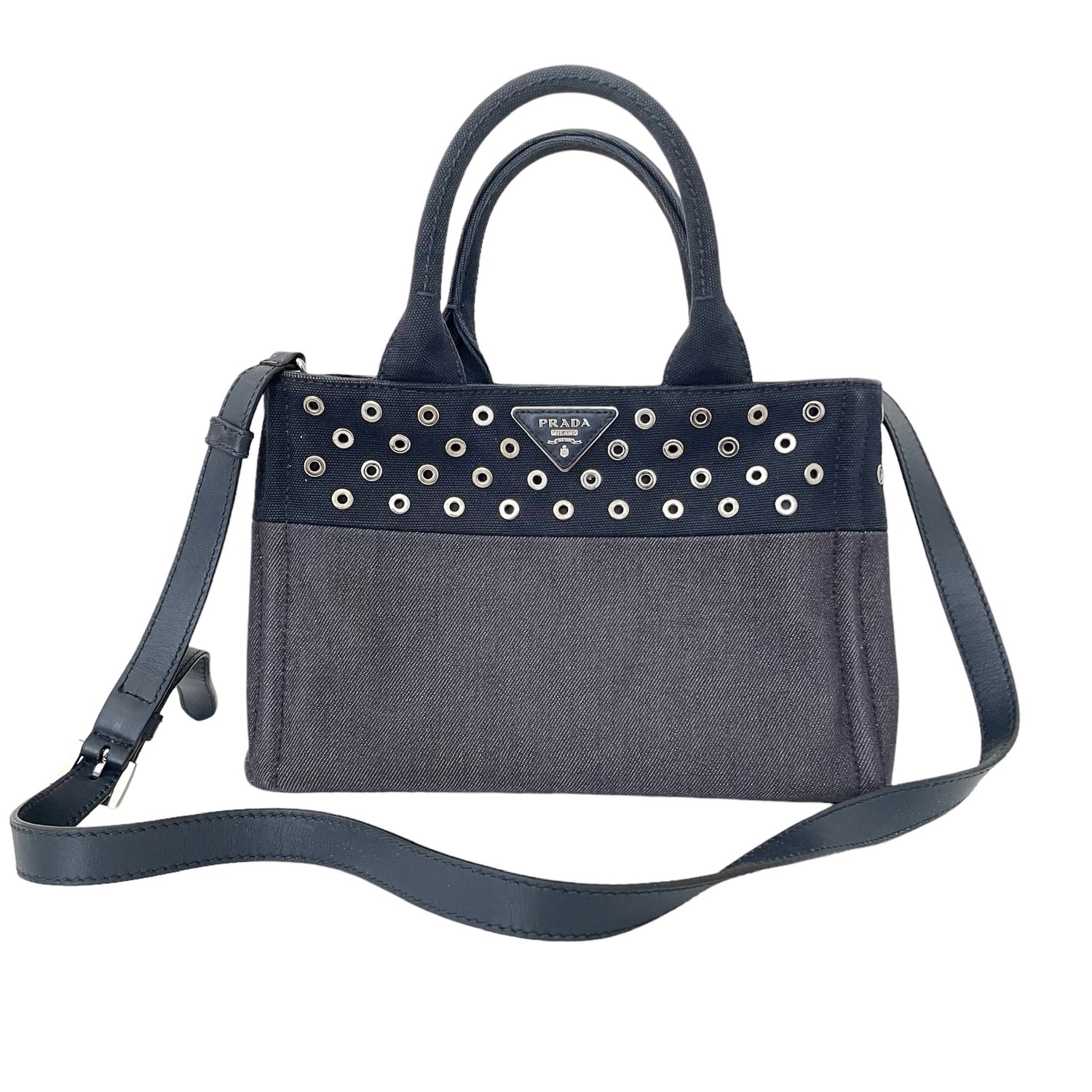 Prada denim tote bag with silver studs and logo at front. Optional crossbody strap. Two zipper pockets inside and two red lambskin leather pouches which are gorgeous and unexpected. Snap closures at sides to make the bag more compact.