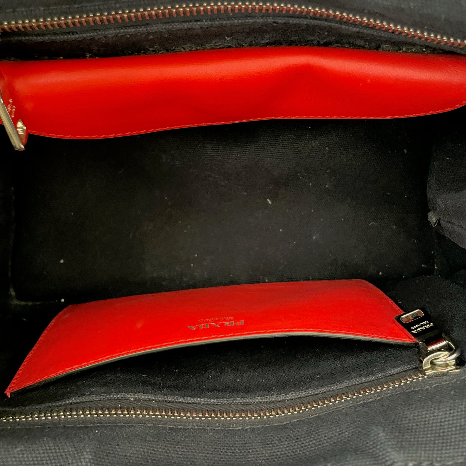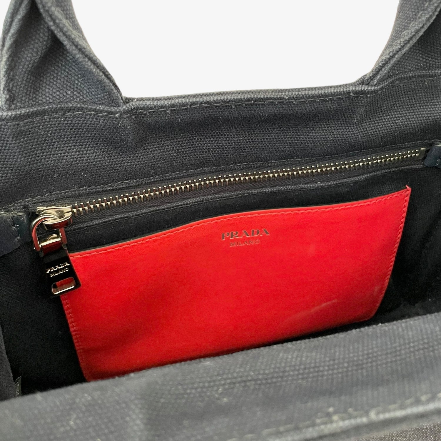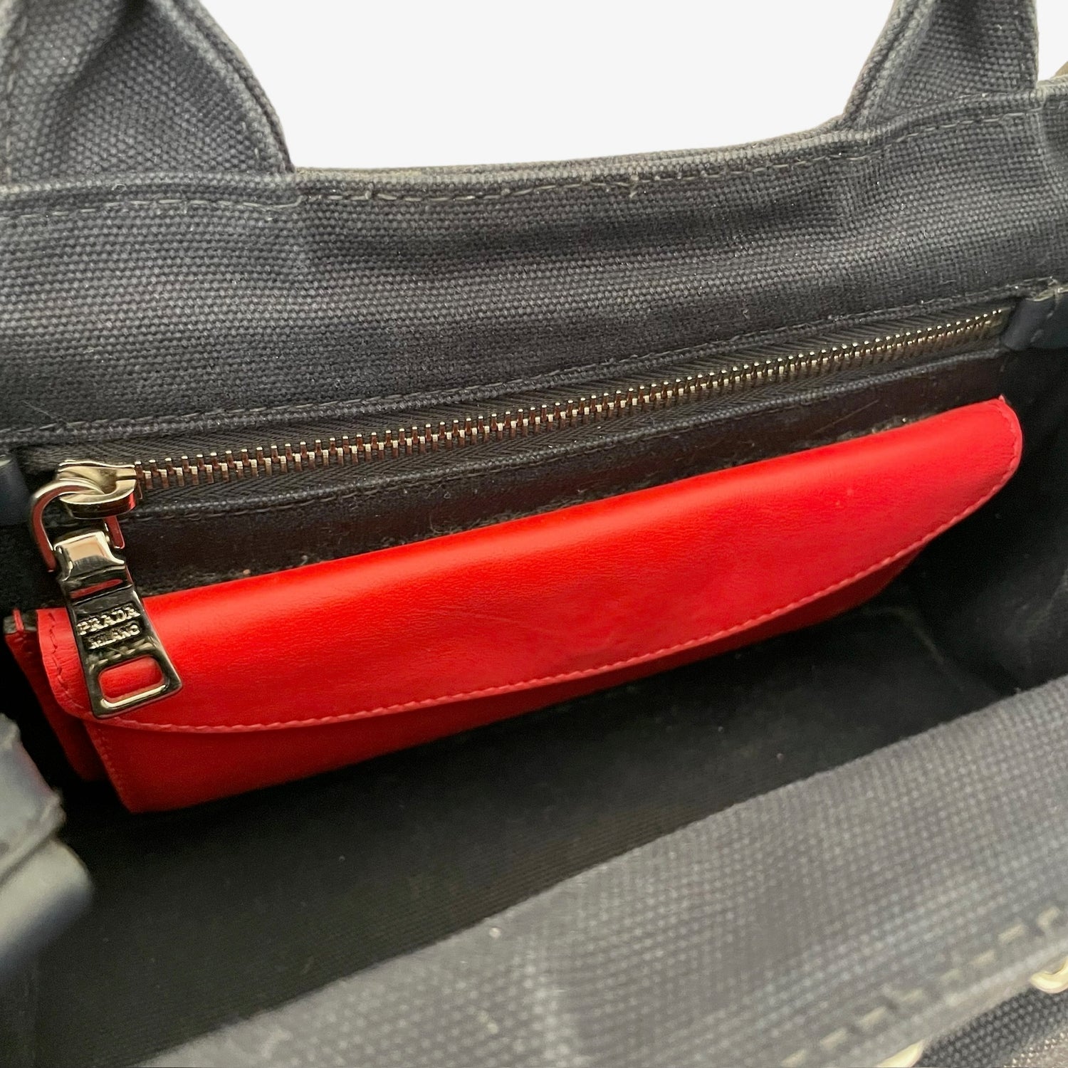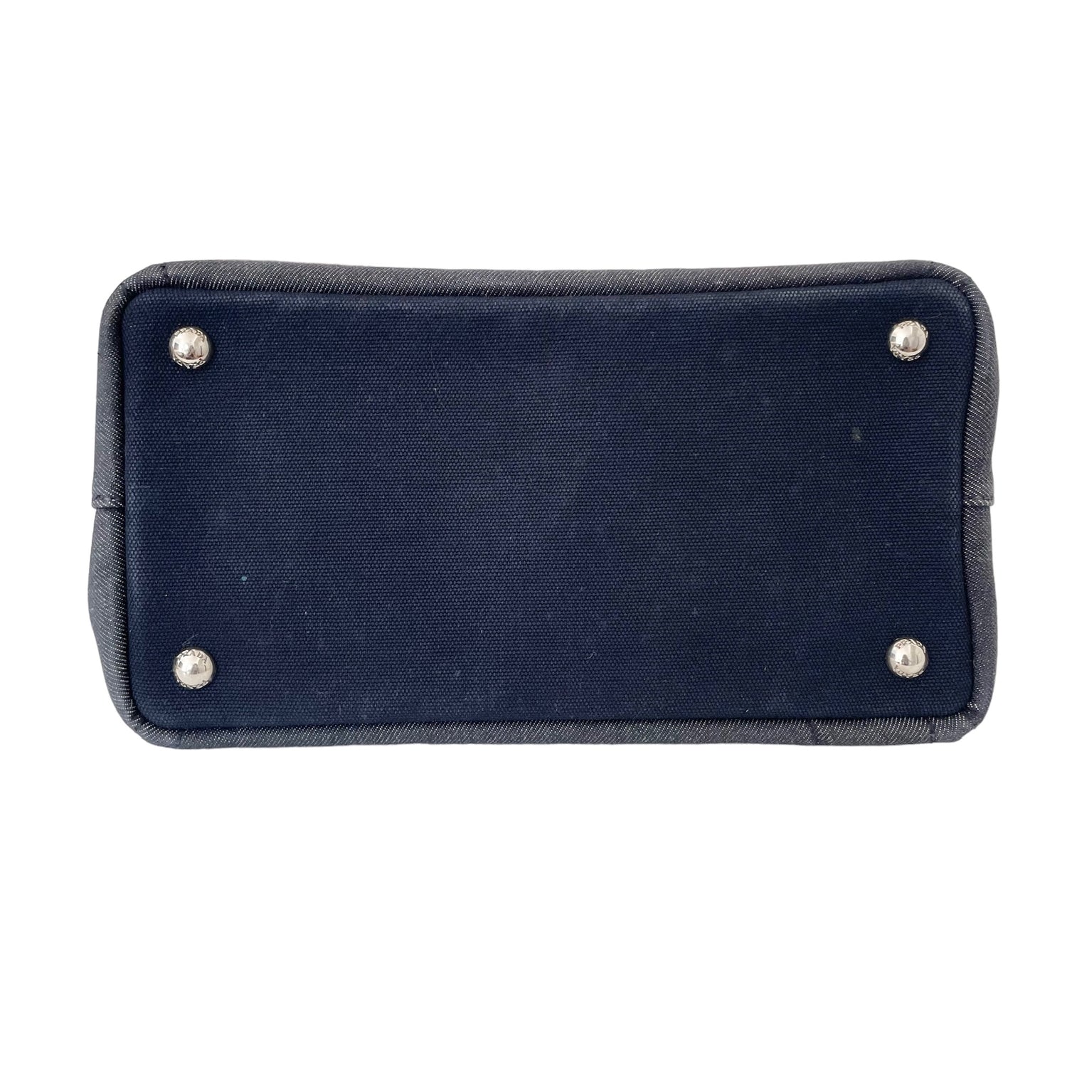 Prada denim tote bag with silver studs and logo at front. Optional crossbody strap. Two zipper pockets inside and two red lambskin leather pouches which are gorgeous and unexpected. Snap closures at sides to make the bag more compact.