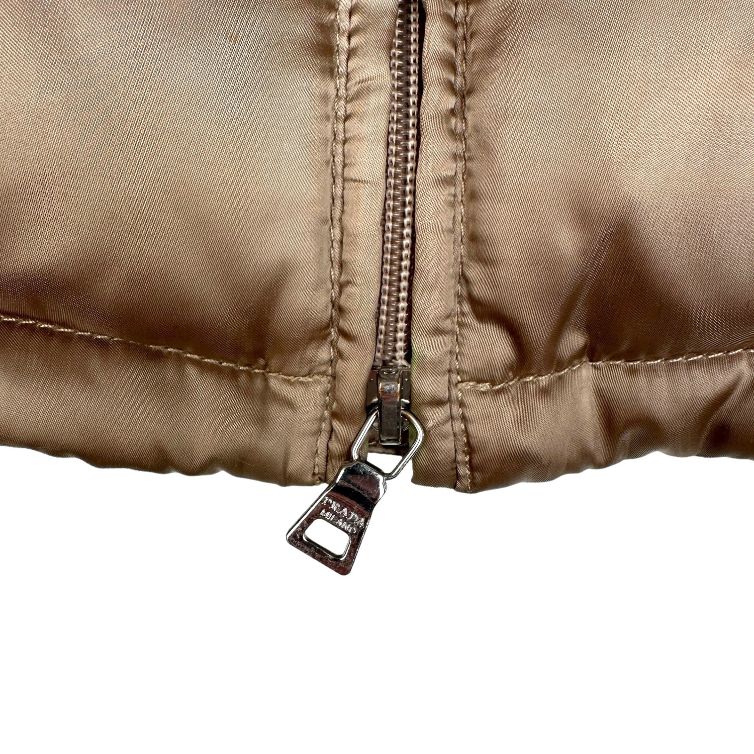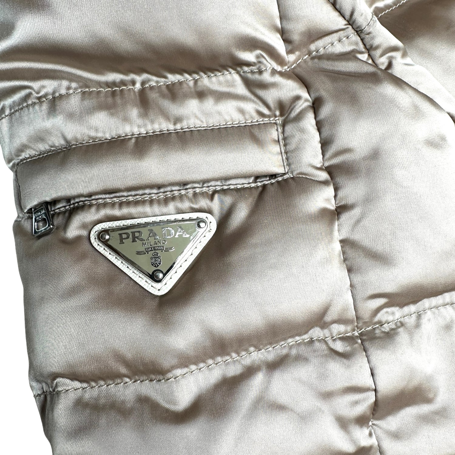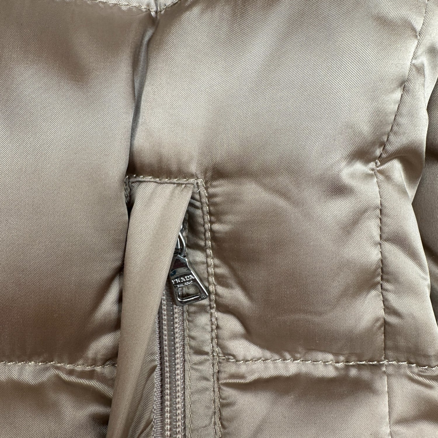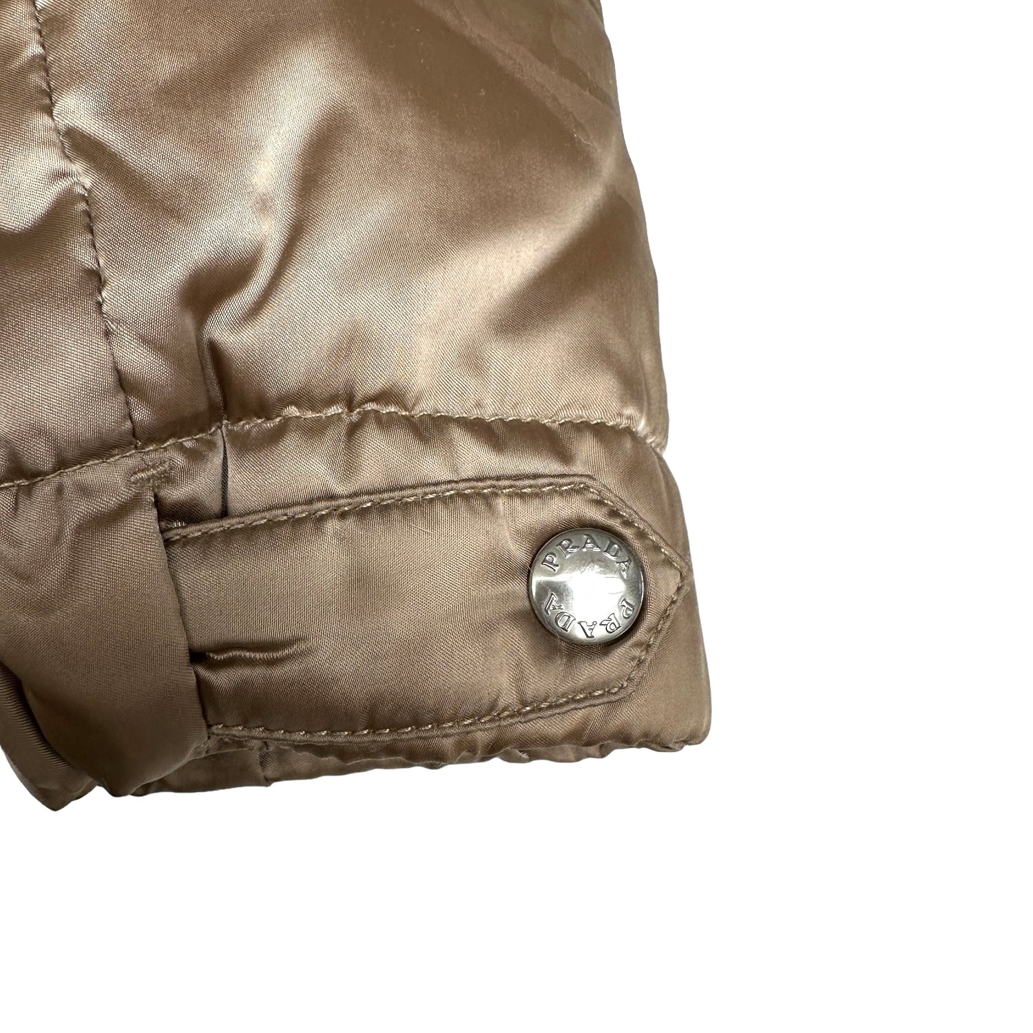 Prada gold puffer jacket with fur trim. Down jacket with zipper closure at front. Two zipper pockets at front. One interior zipper pocket. Silver-tone hardware. Logo plaque at shoulder with shoulder zipper pocket. Designer size 44.