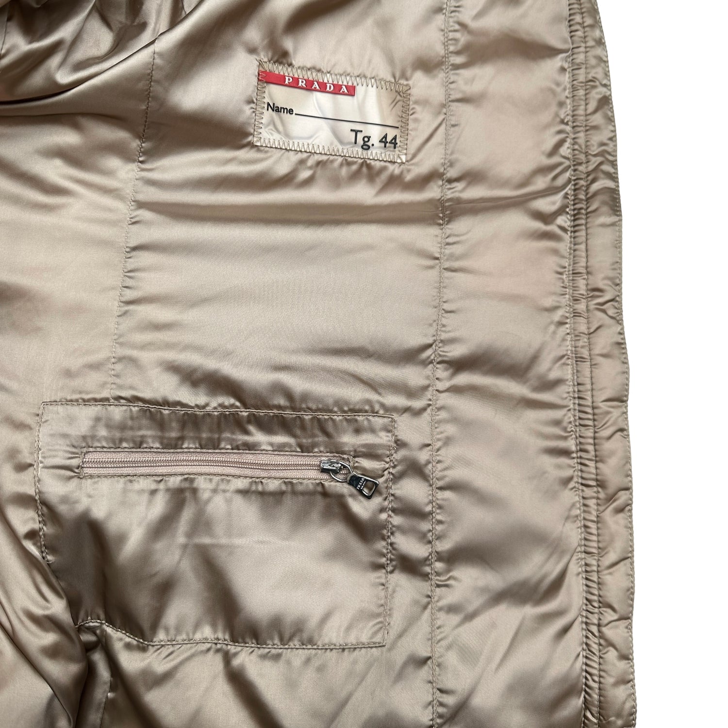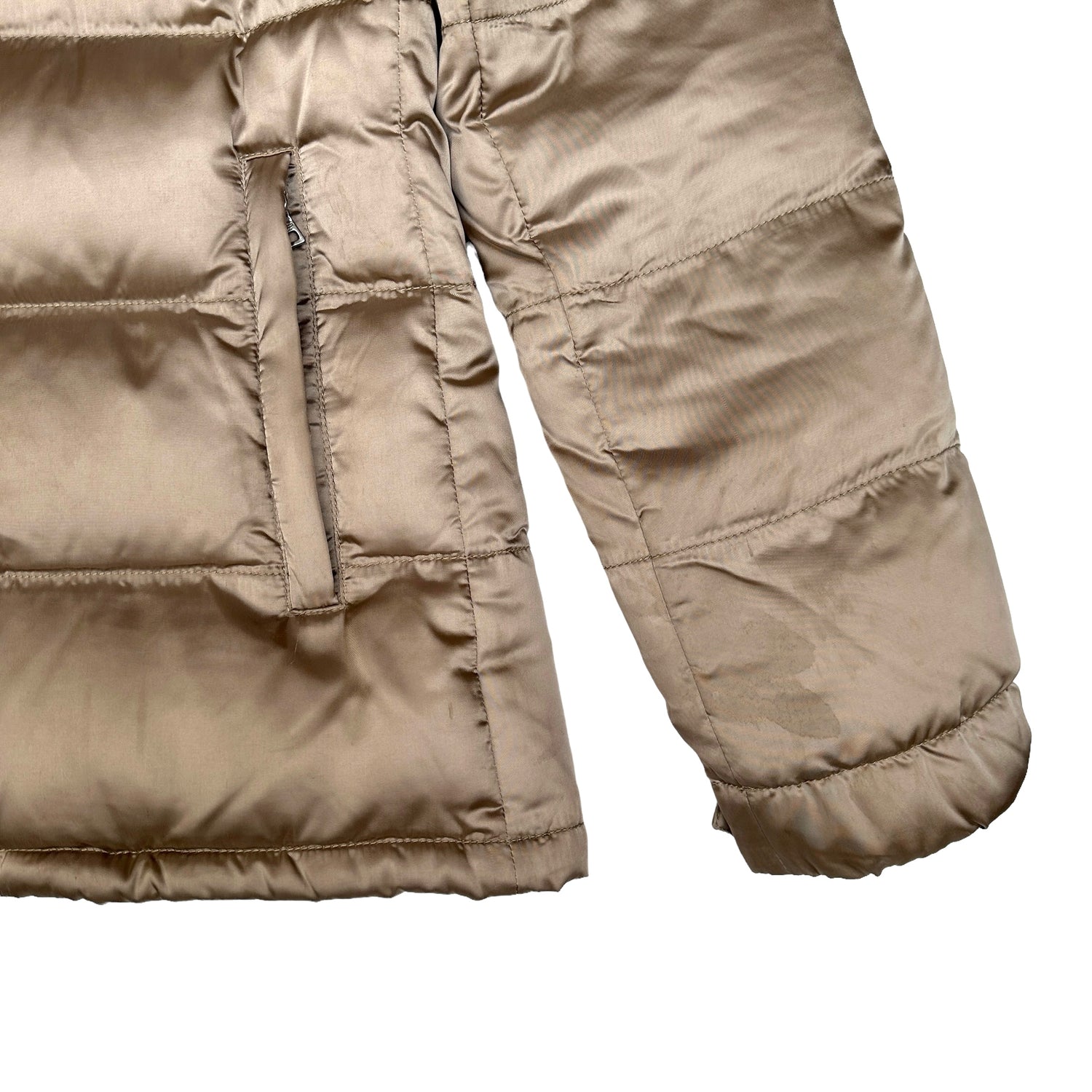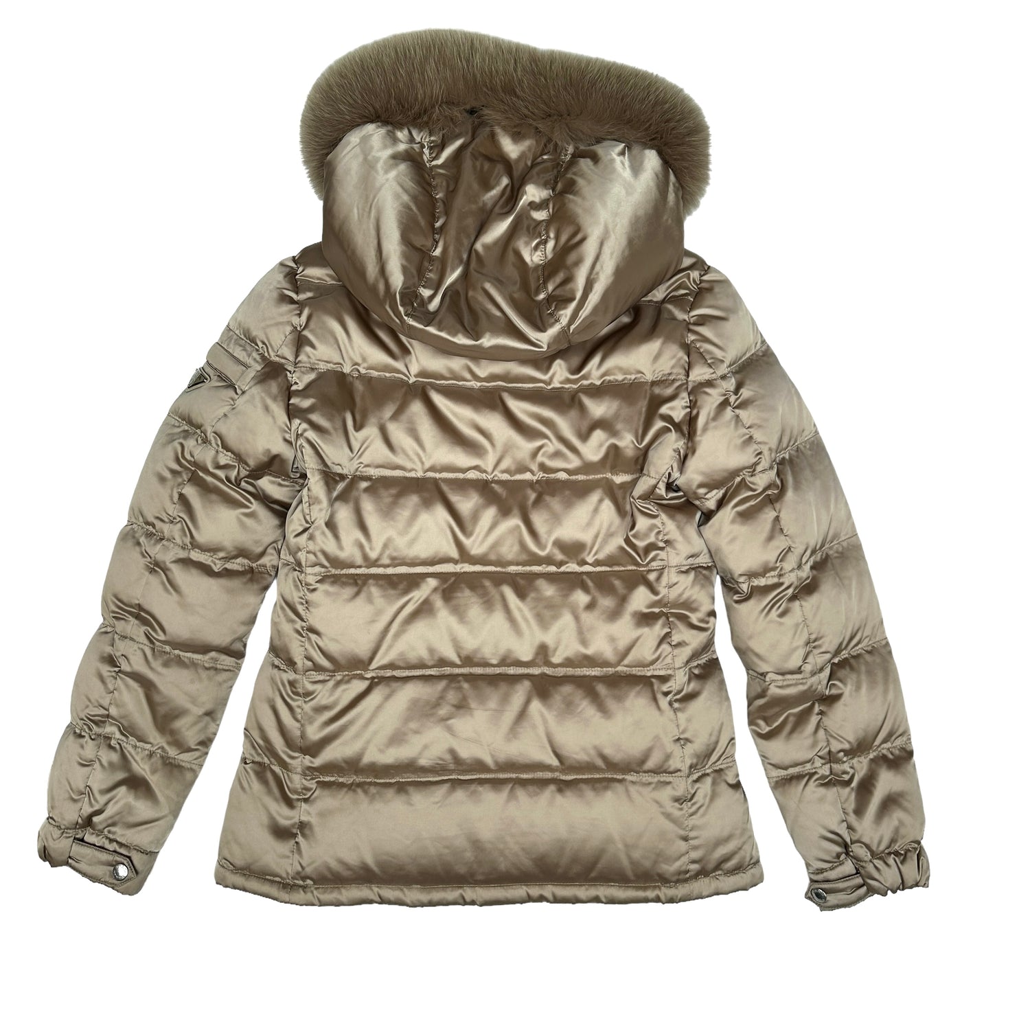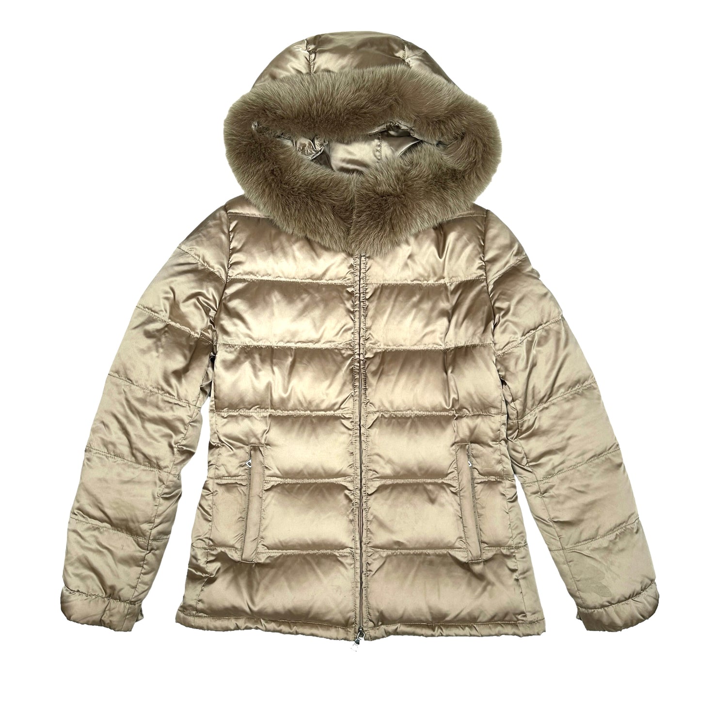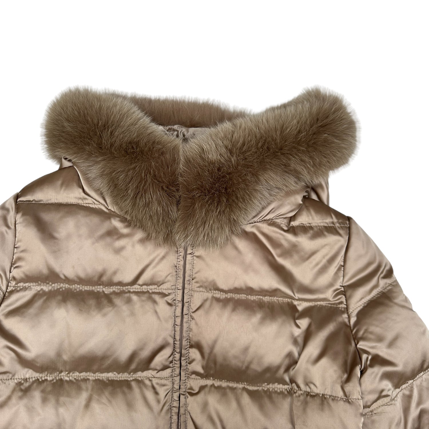 Prada gold puffer jacket with fur trim. Down jacket with zipper closure at front. Two zipper pockets at front. One interior zipper pocket. Silver-tone hardware. Logo plaque at shoulder with shoulder zipper pocket. Designer size 44.
