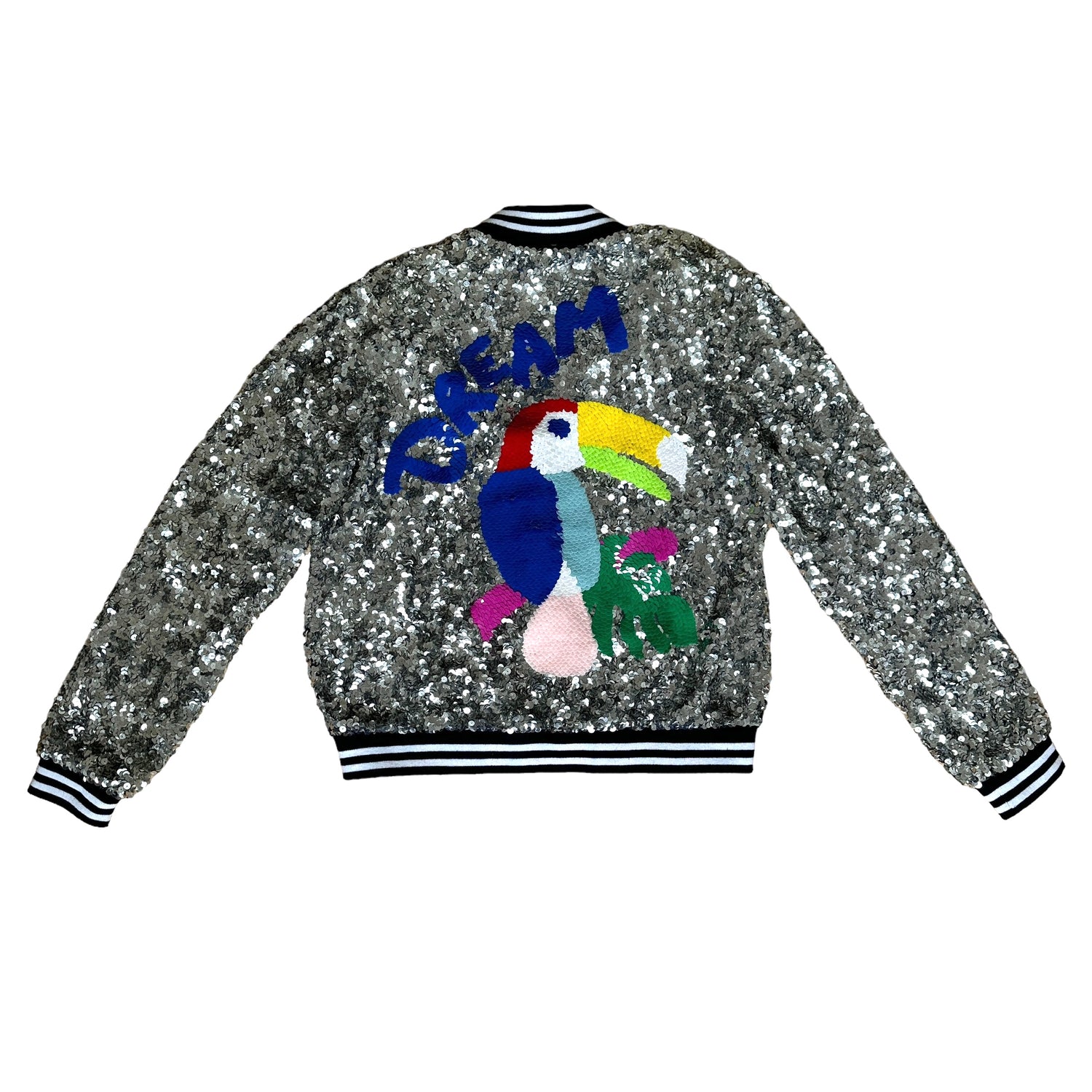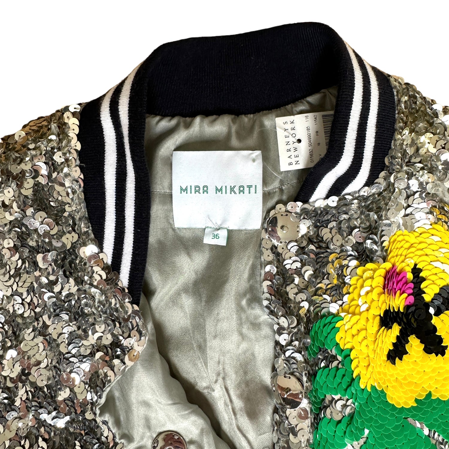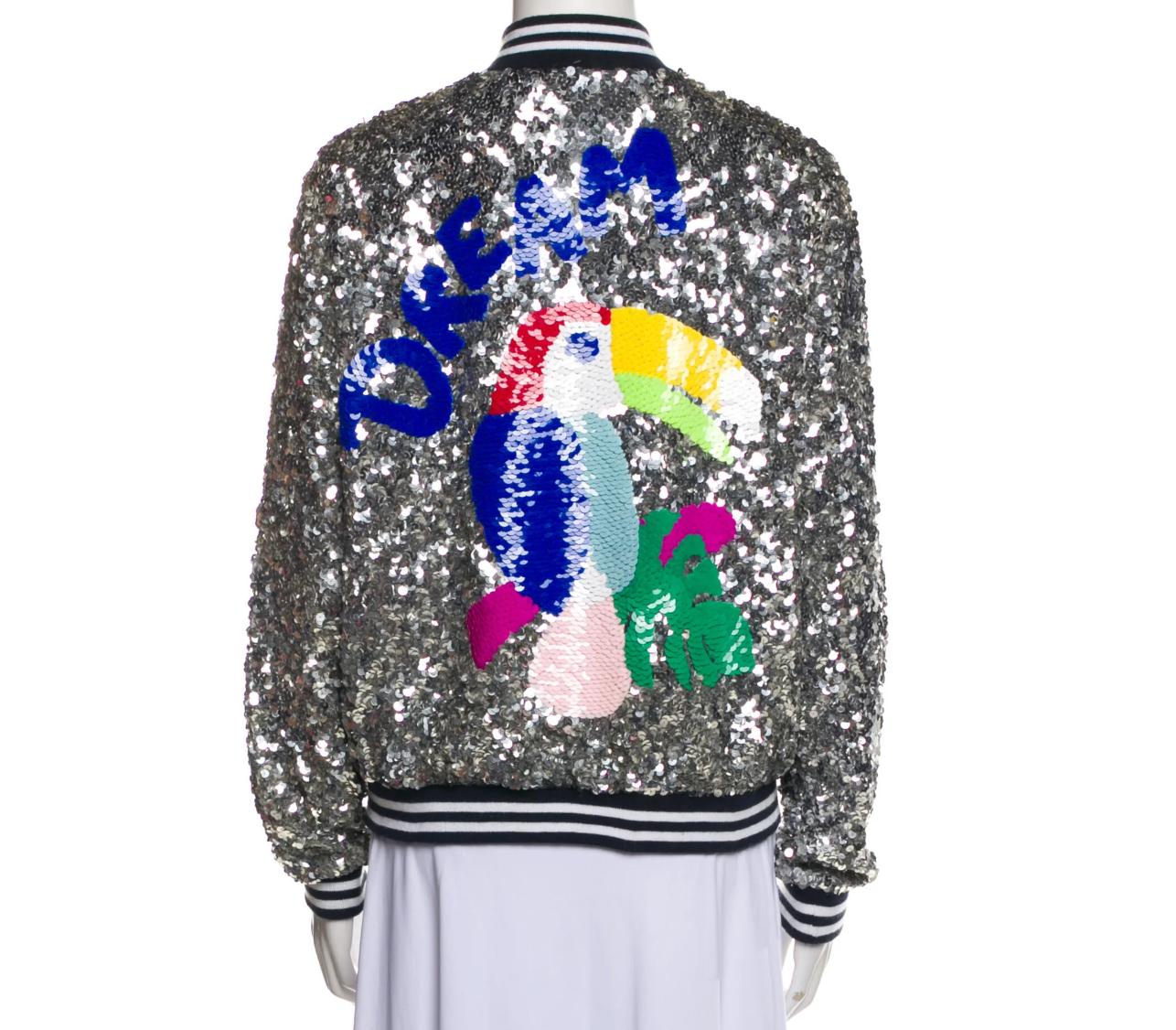 Mira Mikati dreamy silver sequins bomber jacket. Snap button closing at front. Black and white stripe details at collar, waist and wrists. Round neck. Very stylish and unique piece to collect. "Dream" and parrot design at back in multicolor sequins. Designer size 36.