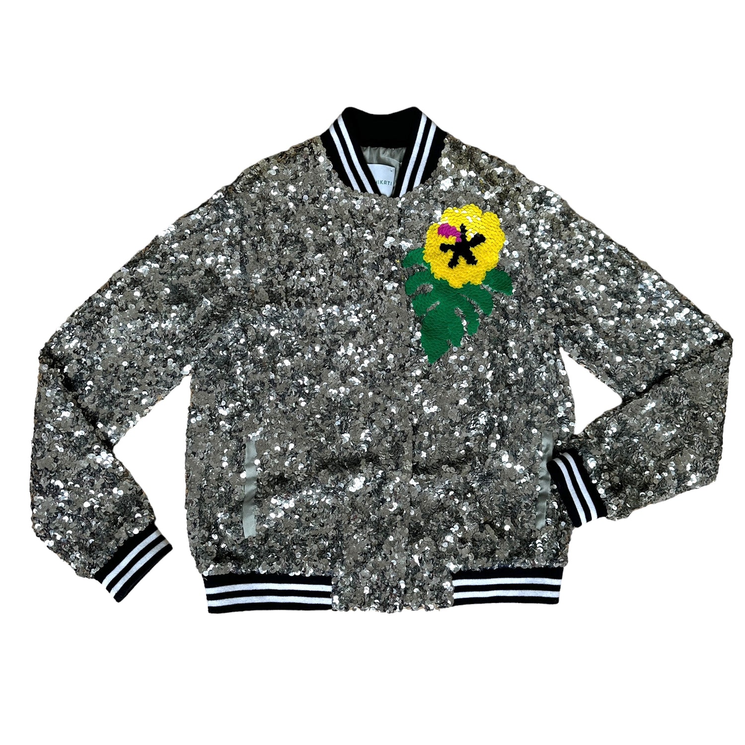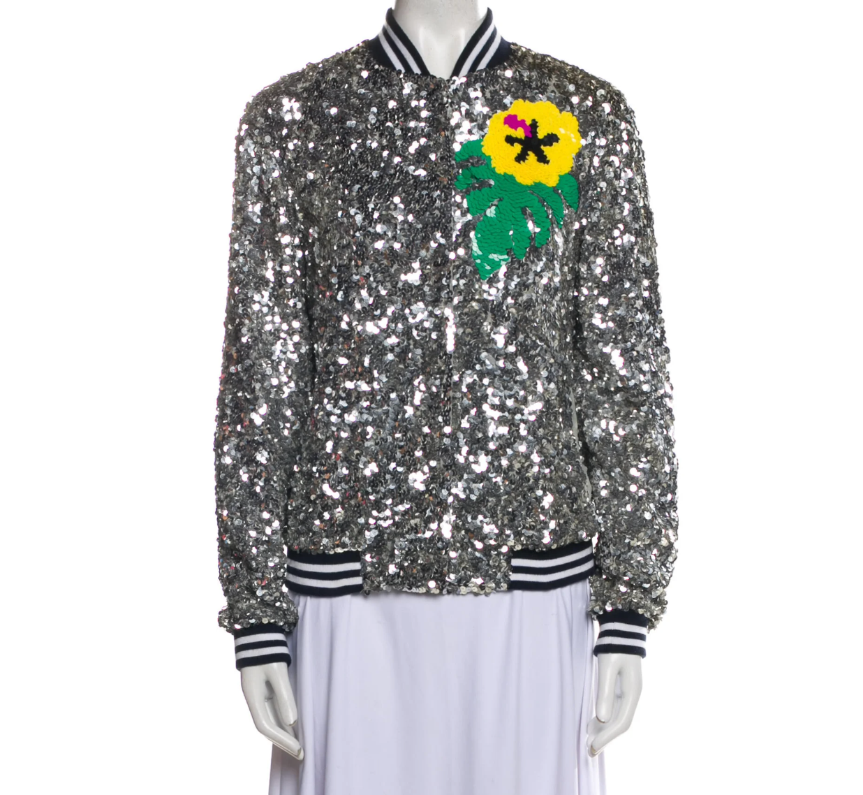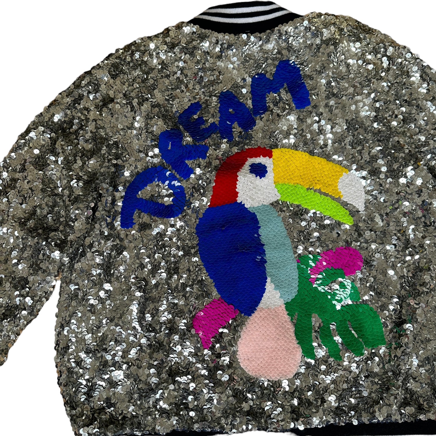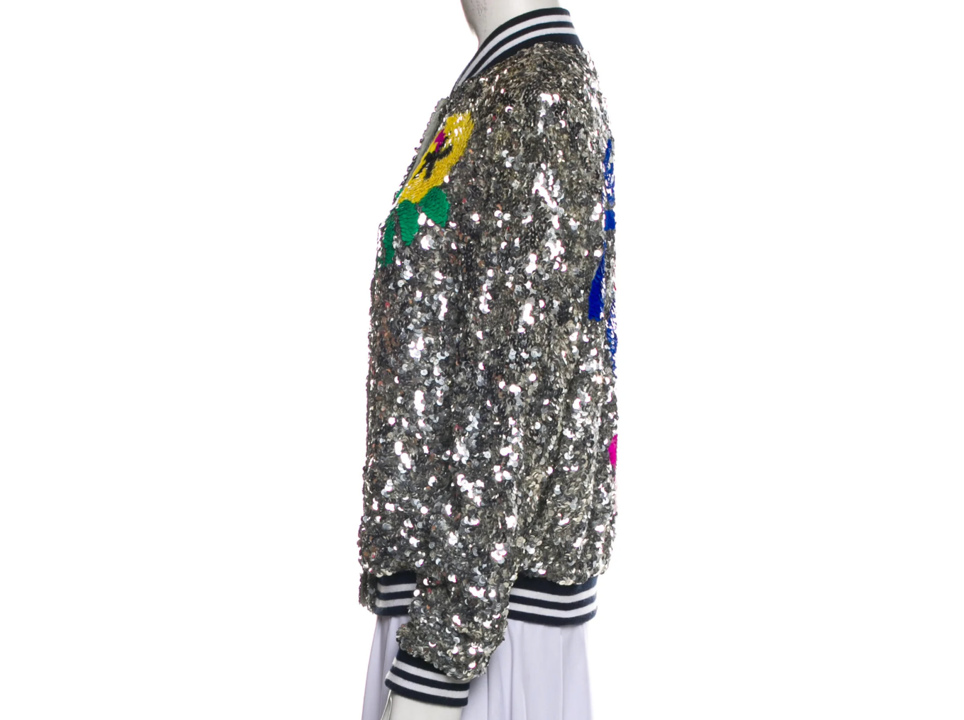 Mira Mikati dreamy silver sequins bomber jacket. Snap button closing at front. Black and white stripe details at collar, waist and wrists. Round neck. Very stylish and unique piece to collect. "Dream" and parrot design at back in multicolor sequins. Designer size 36.
