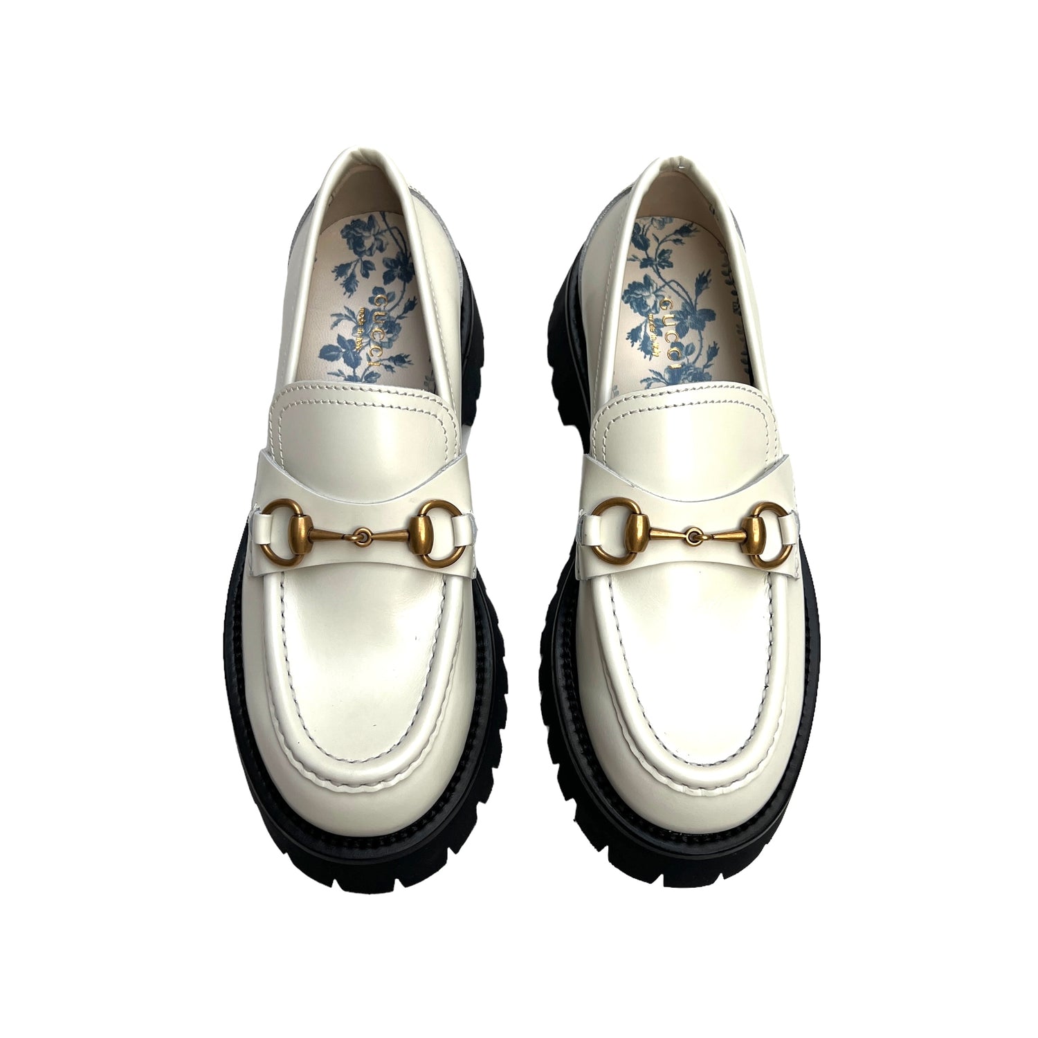 Gucci dusty white loafers. Aged gold-tone horse-bite on top. Gold tread bee at back. Chunky rubber soles. Flower print leather lining.