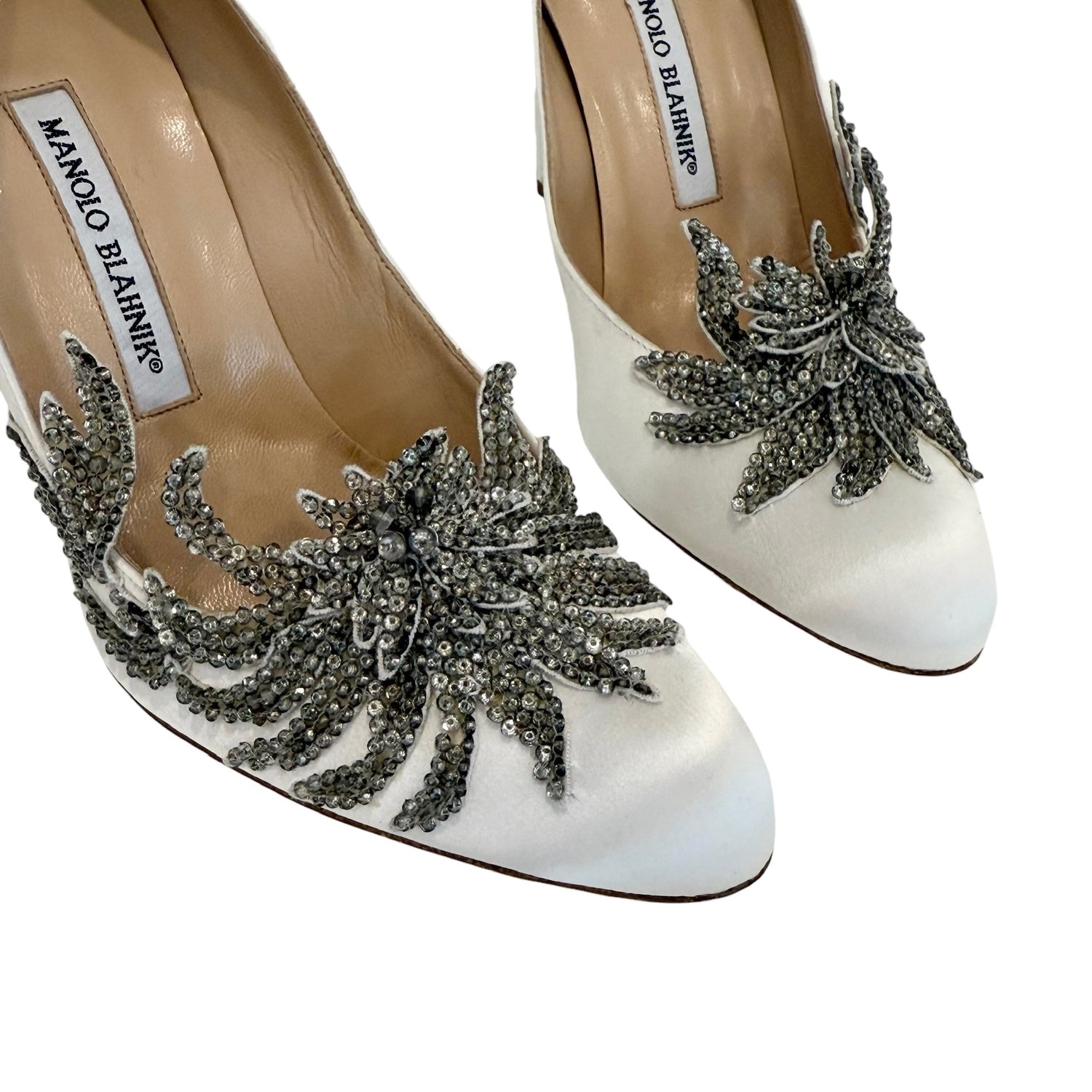 Manolo Blahnik white satin heels. Crystal embellished. Round toe. Designer size 40.
