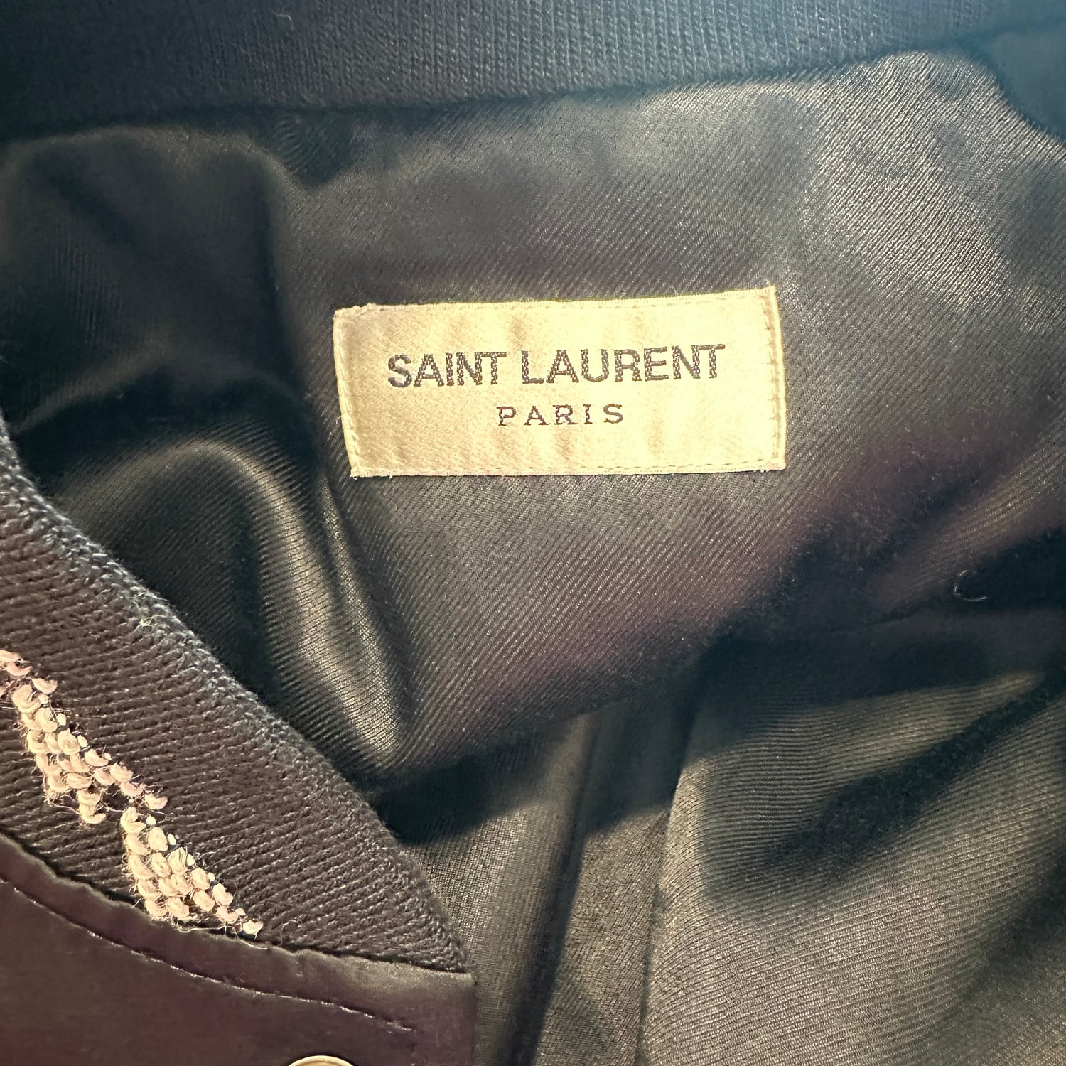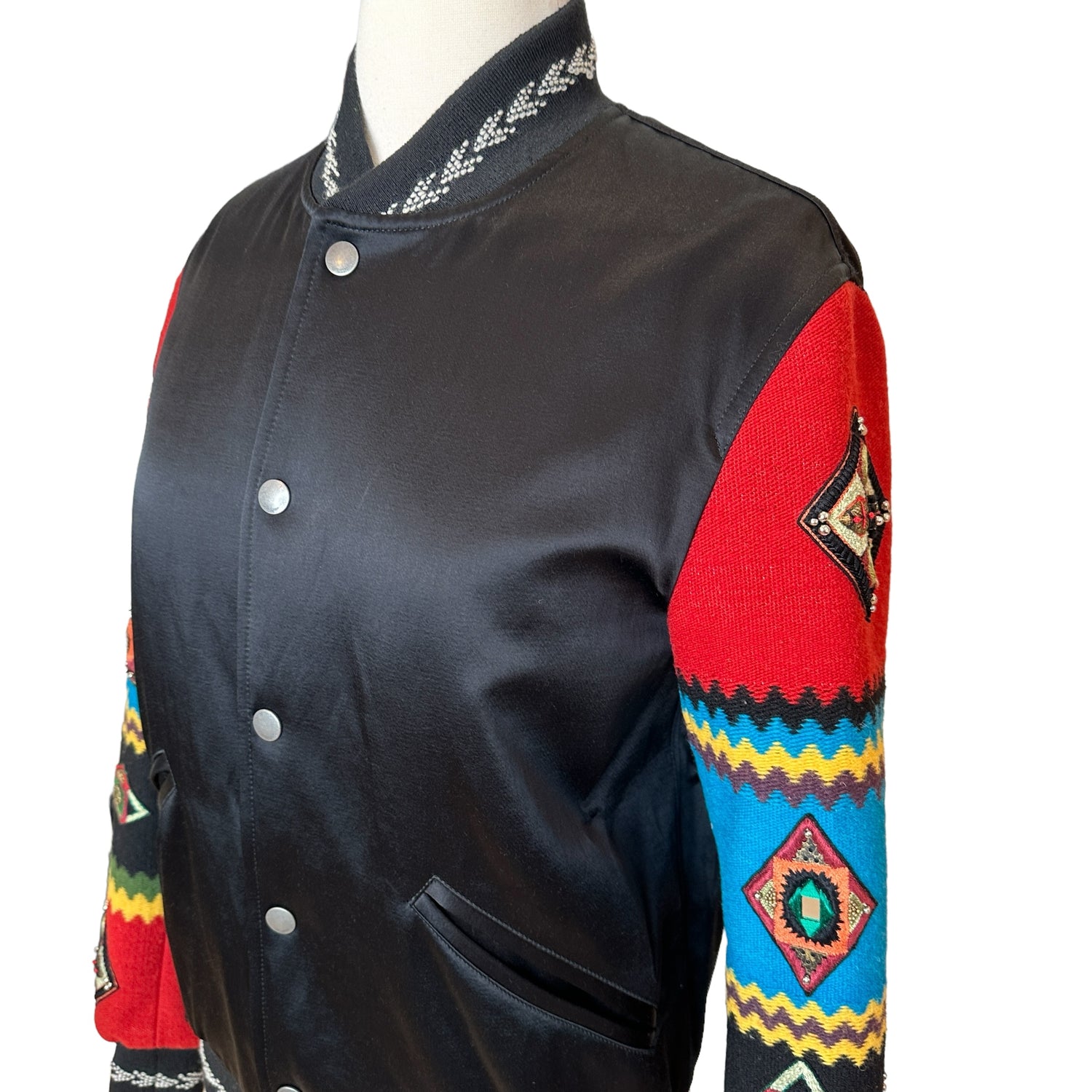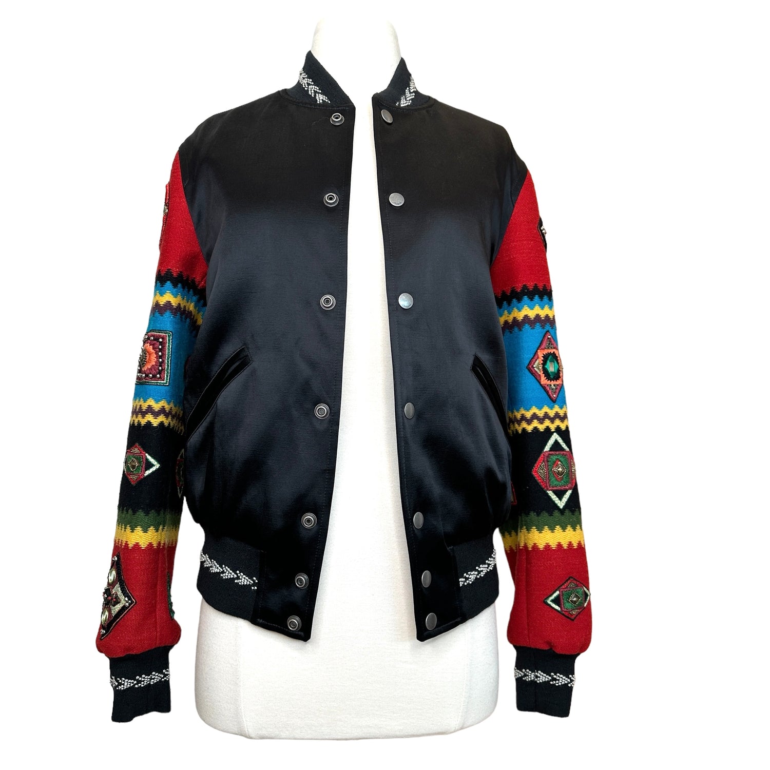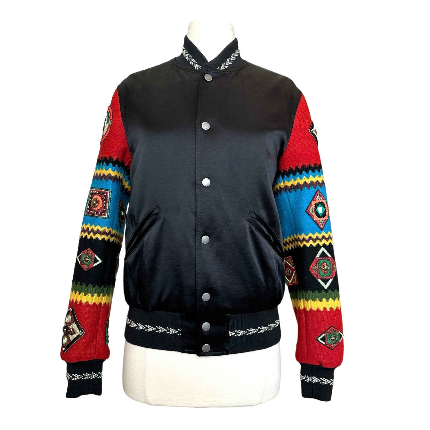 Saint Laurent bomber jacket. Embroidered sleeves with patches. Pockets. Lined throughout. Two interior pockets. Designer size 36.