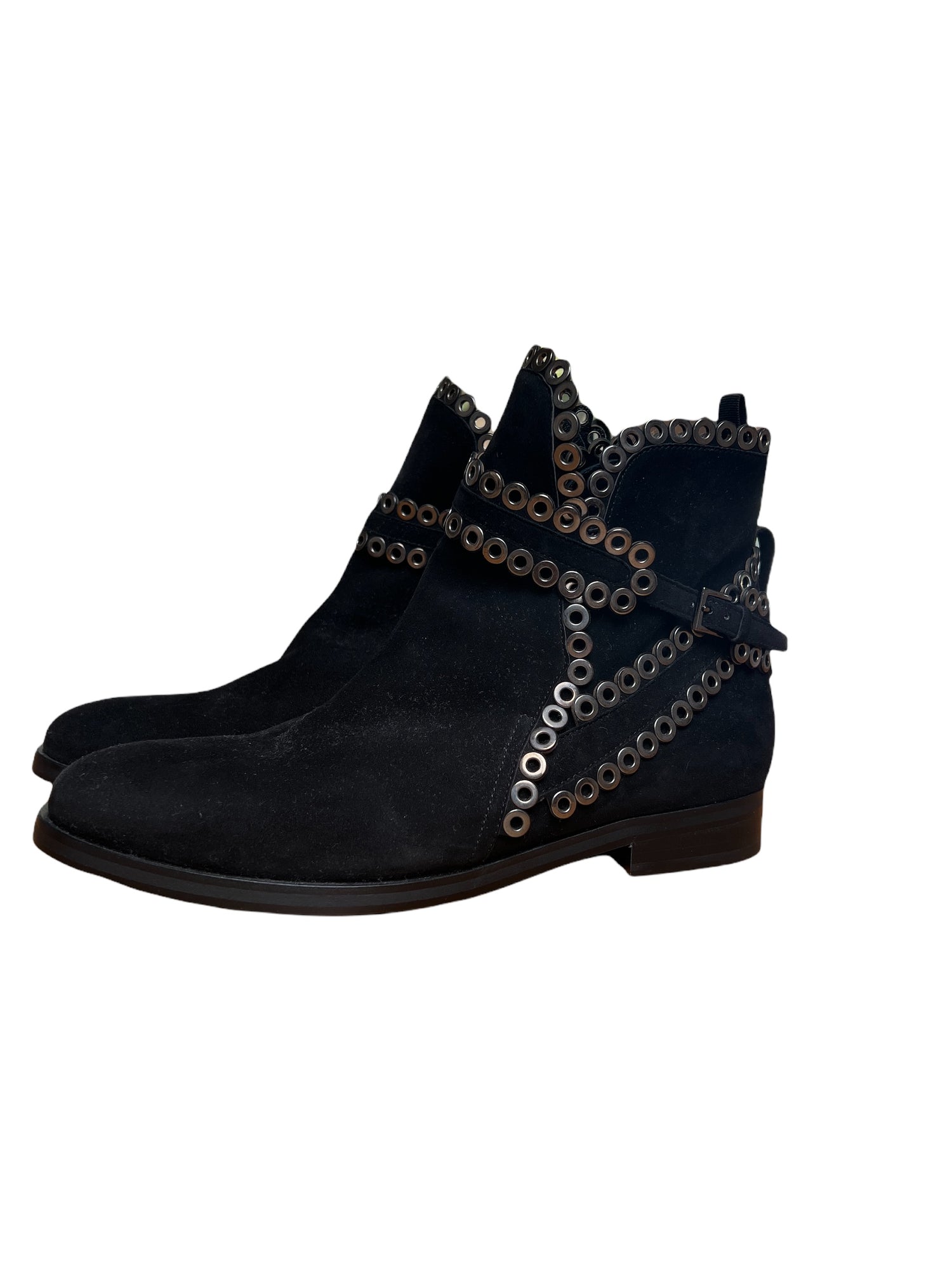 These are made of black suede. Iconic eyelet style with silver tone hardware. Buckles at side.