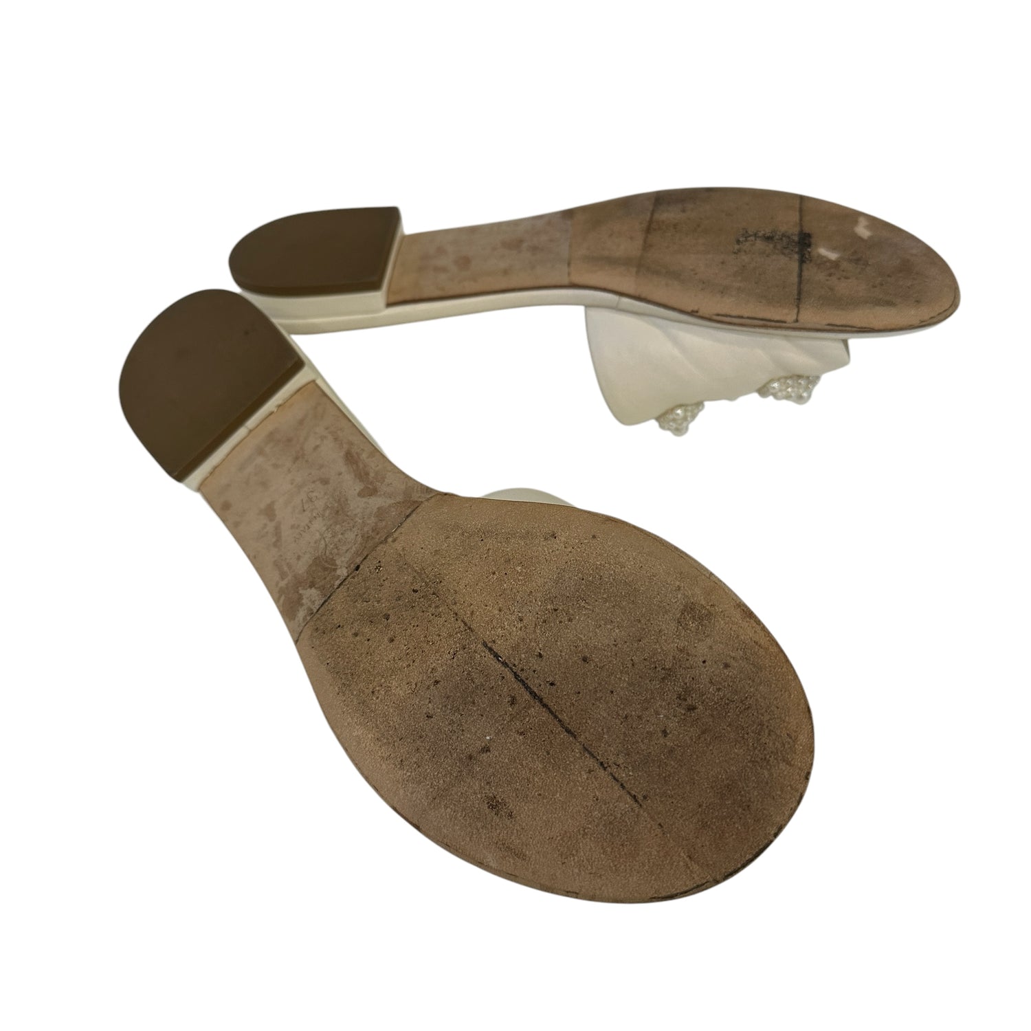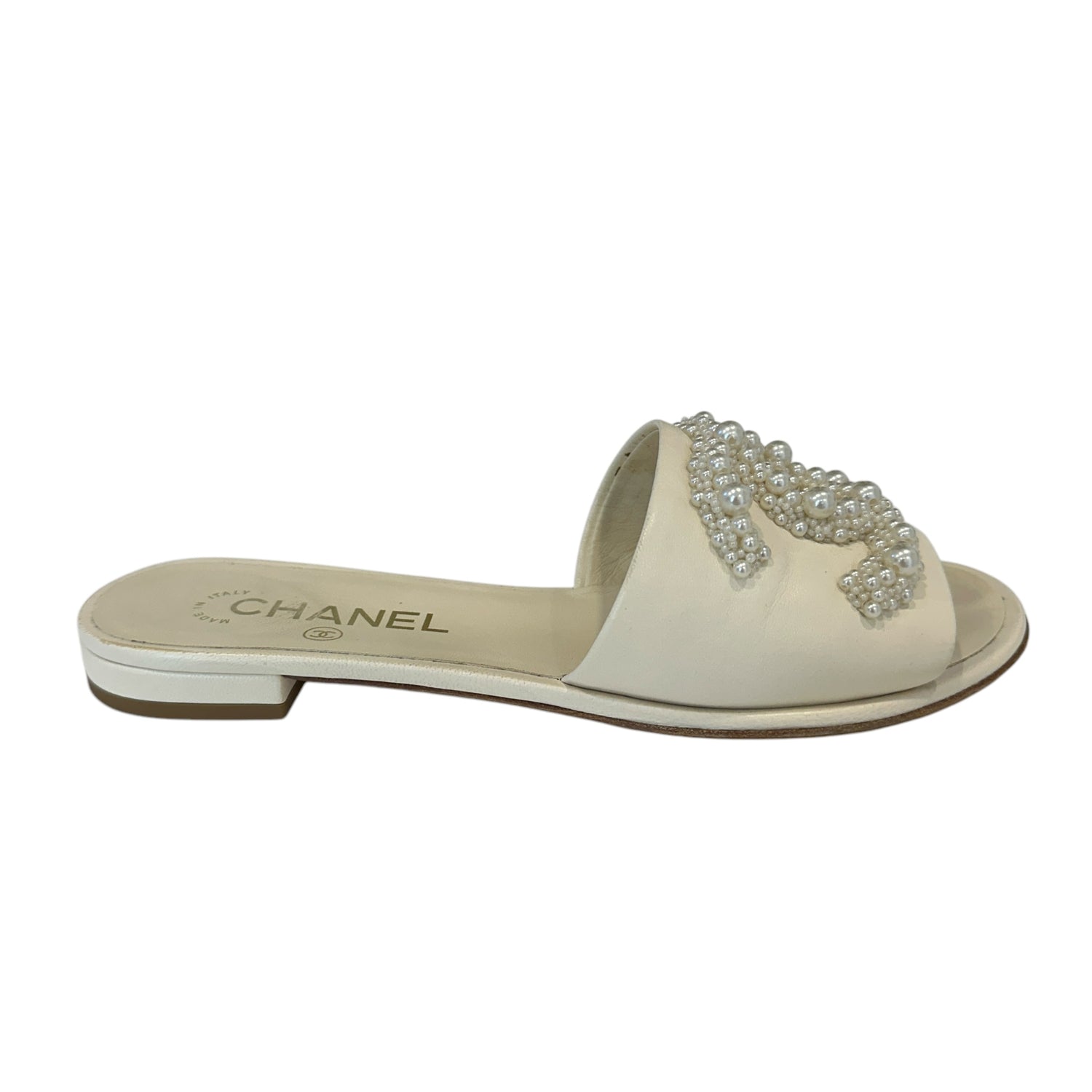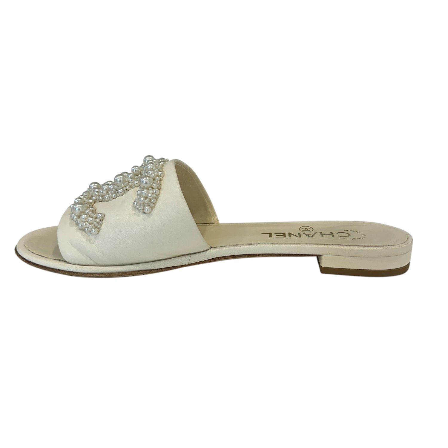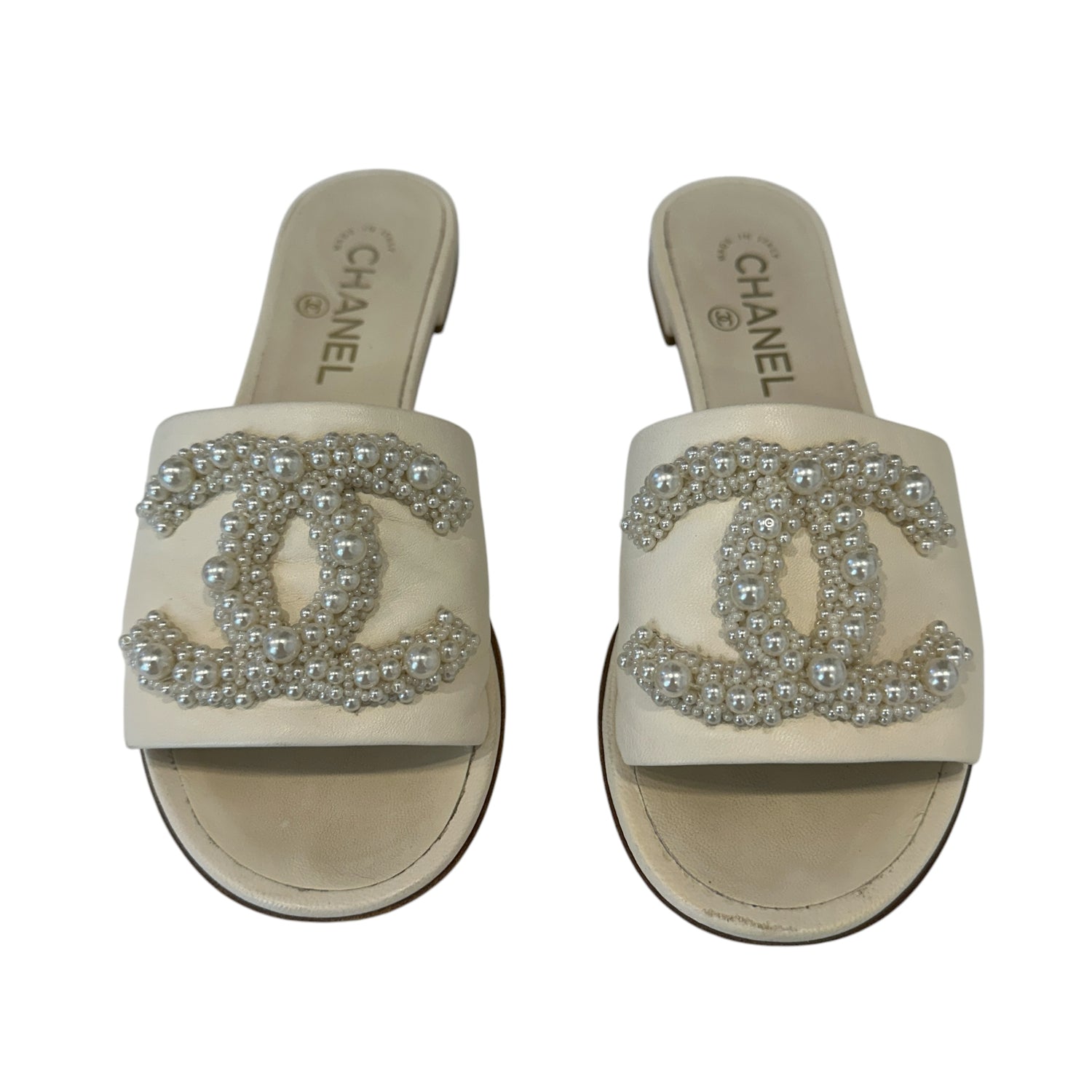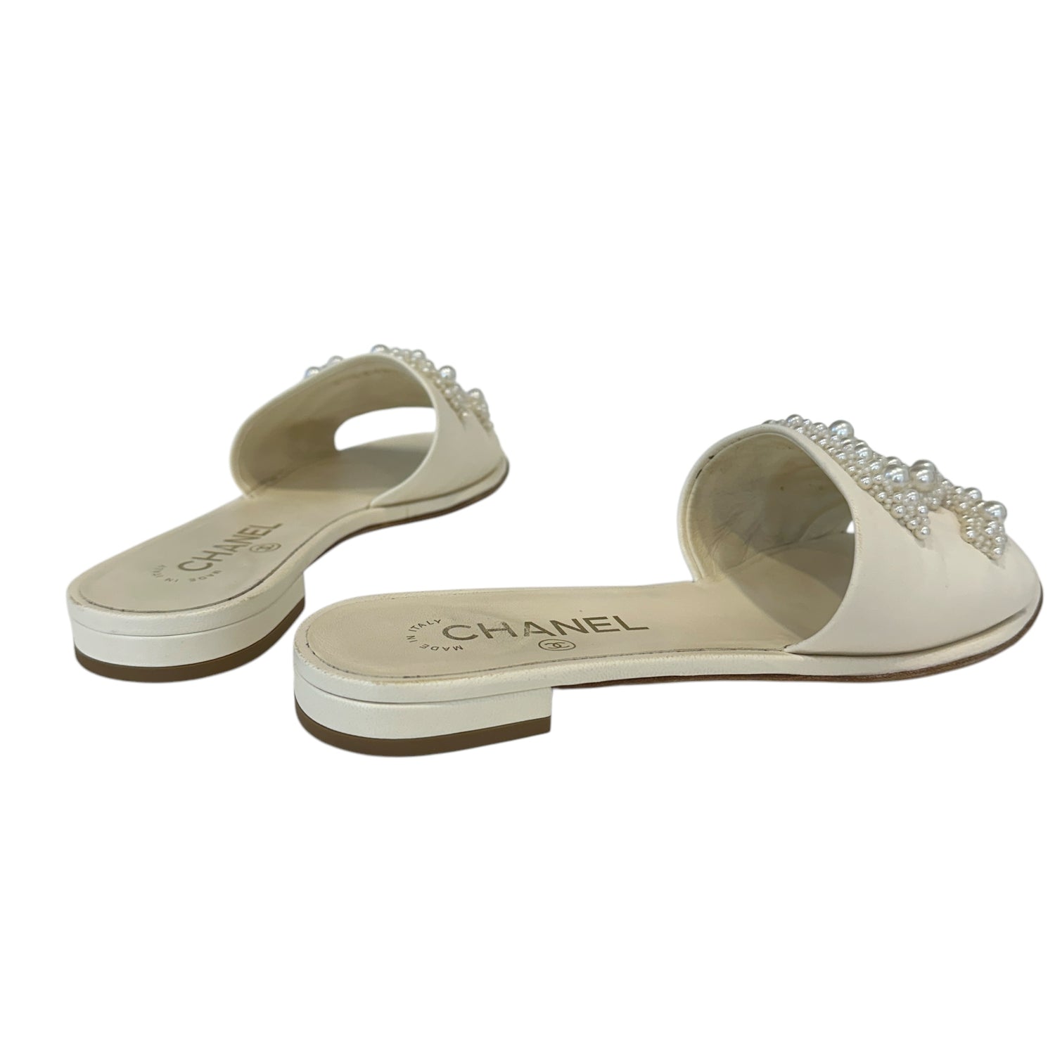 Chanel sandals with faux-pearl embellishments at top. Open toes. White lambskin leather. Designer size 37.