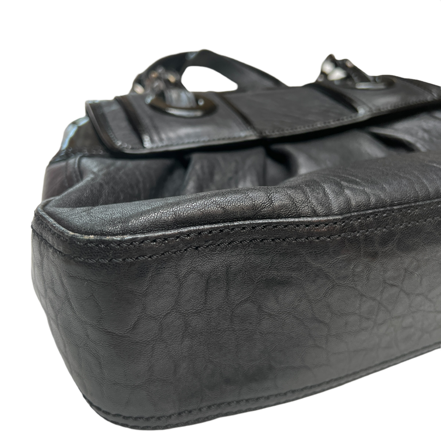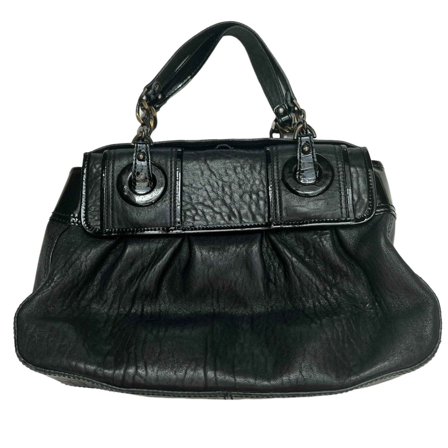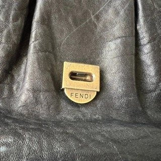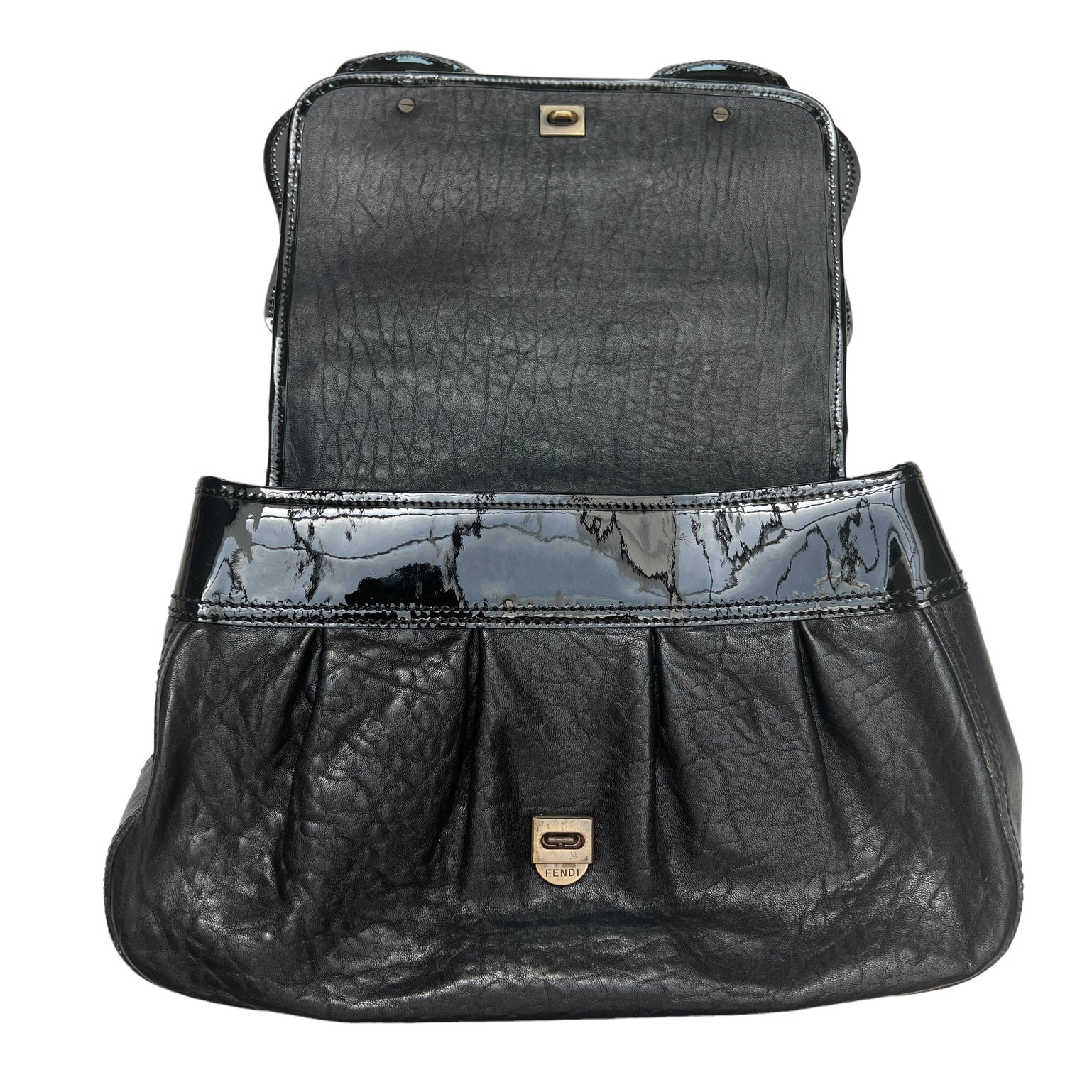 Fendi black leather bag. Zucca FF logo at hardware. Antique gold-tone hardware. Patent leather detail. Logo jacquard lining. Interior pocket. Snap closure at front.