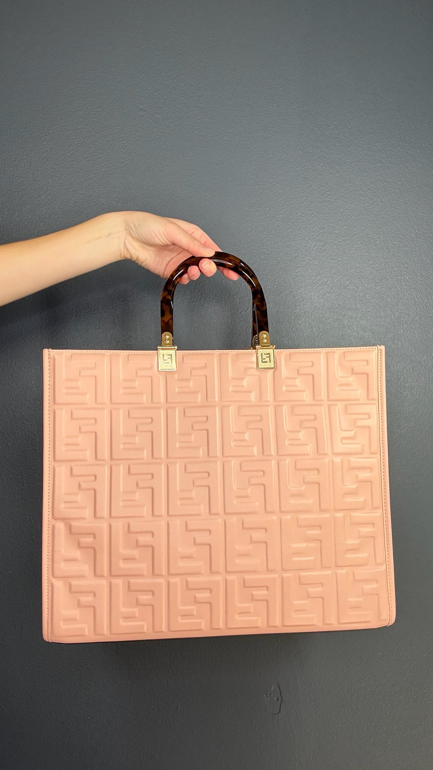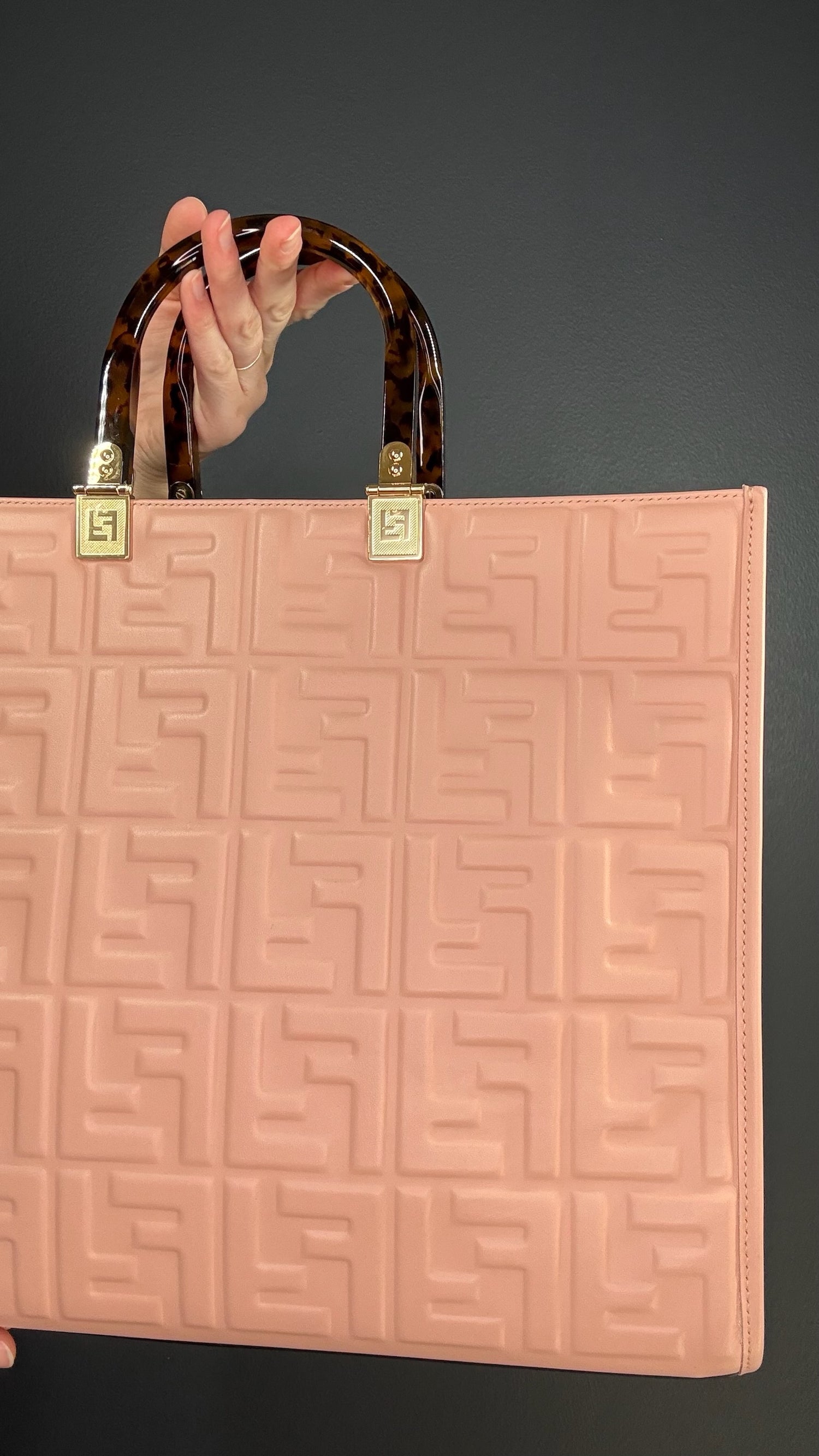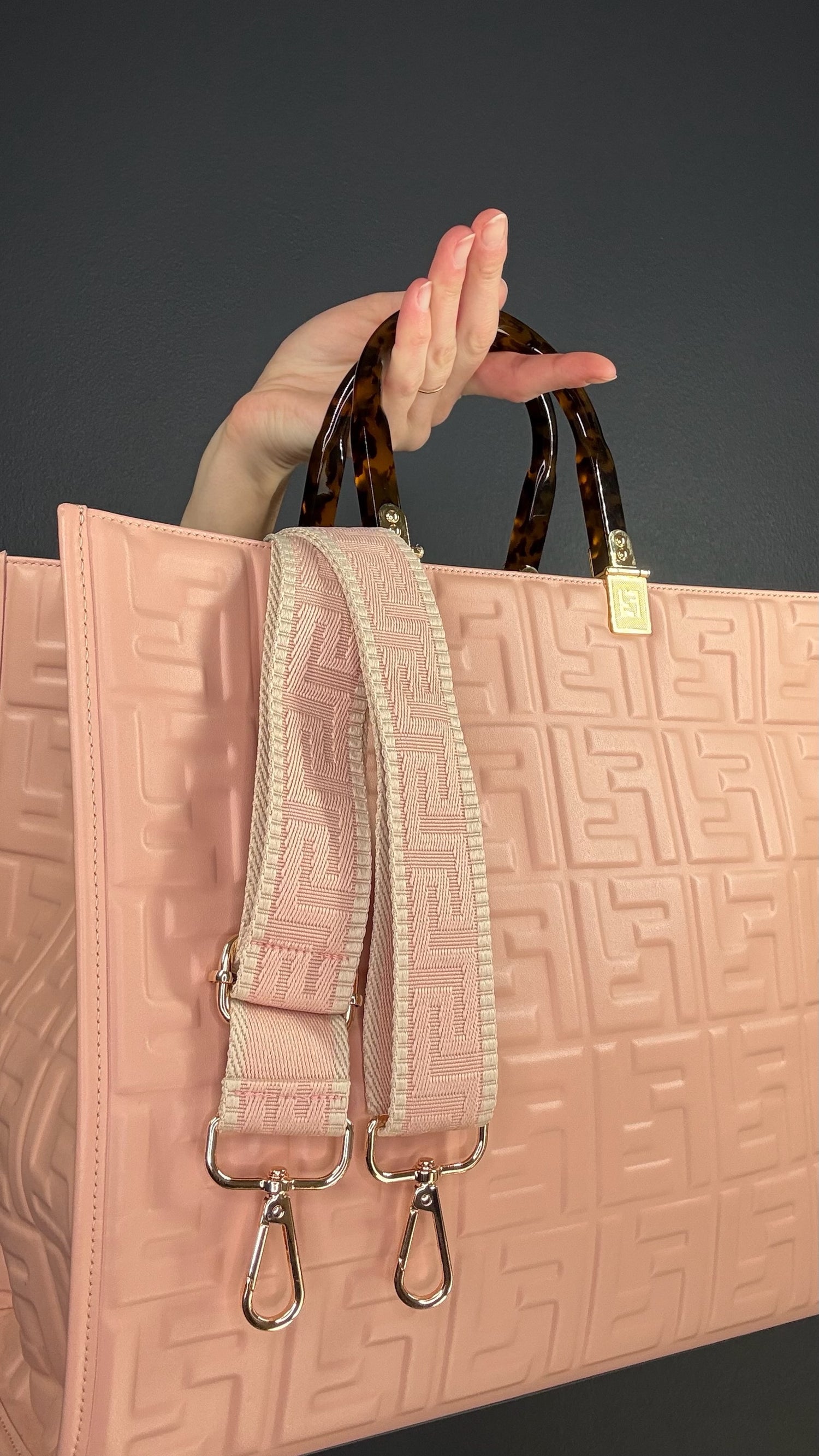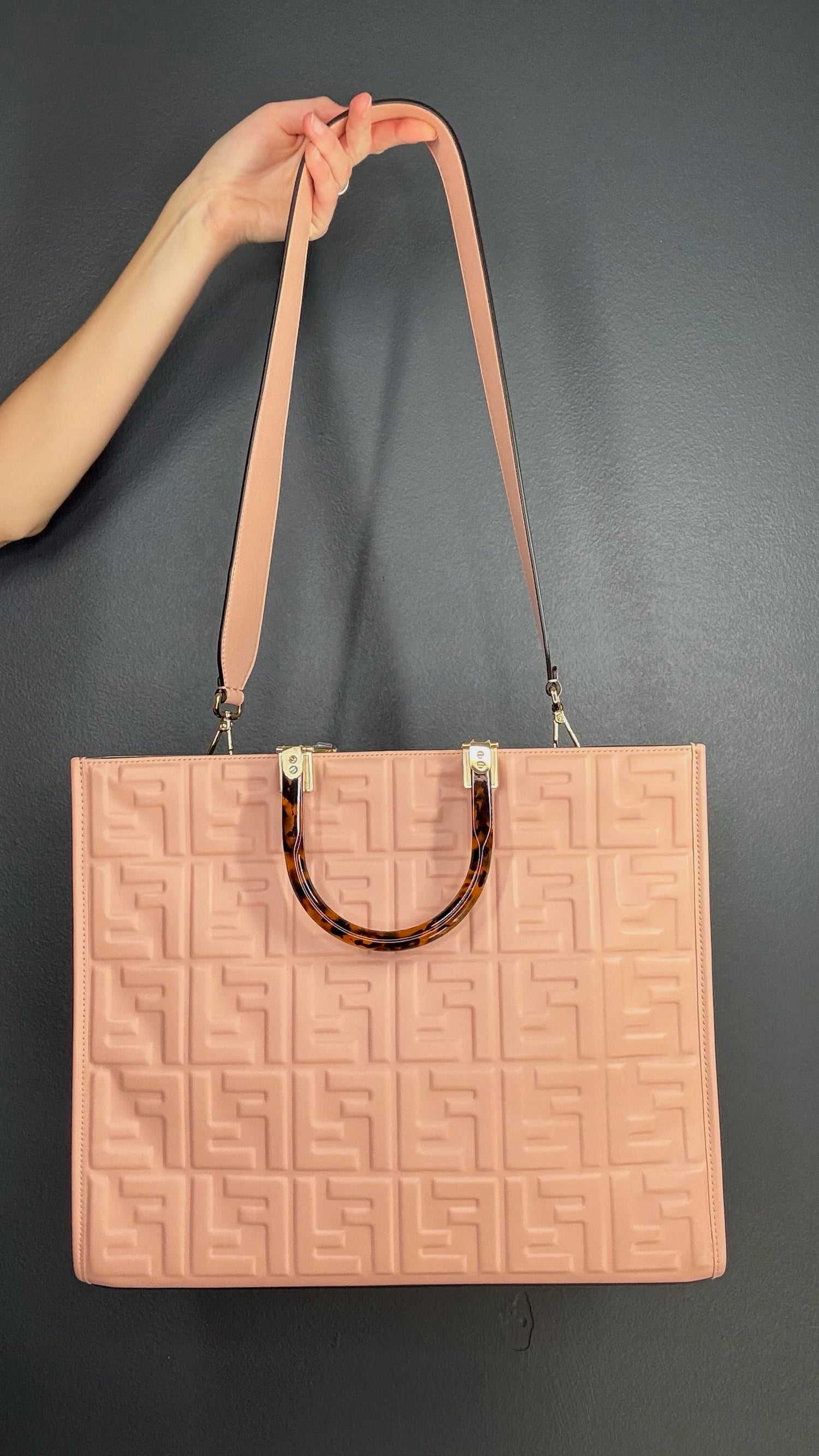 This luxurious Fendi tote bag in a soft pink hue features the iconic Fendi logo pattern, offering a sophisticated and feminine touch. The structured design is complemented by a tortoiseshell top handle and an adjustable shoulder strap, making it both stylish and versatile for any occasion.