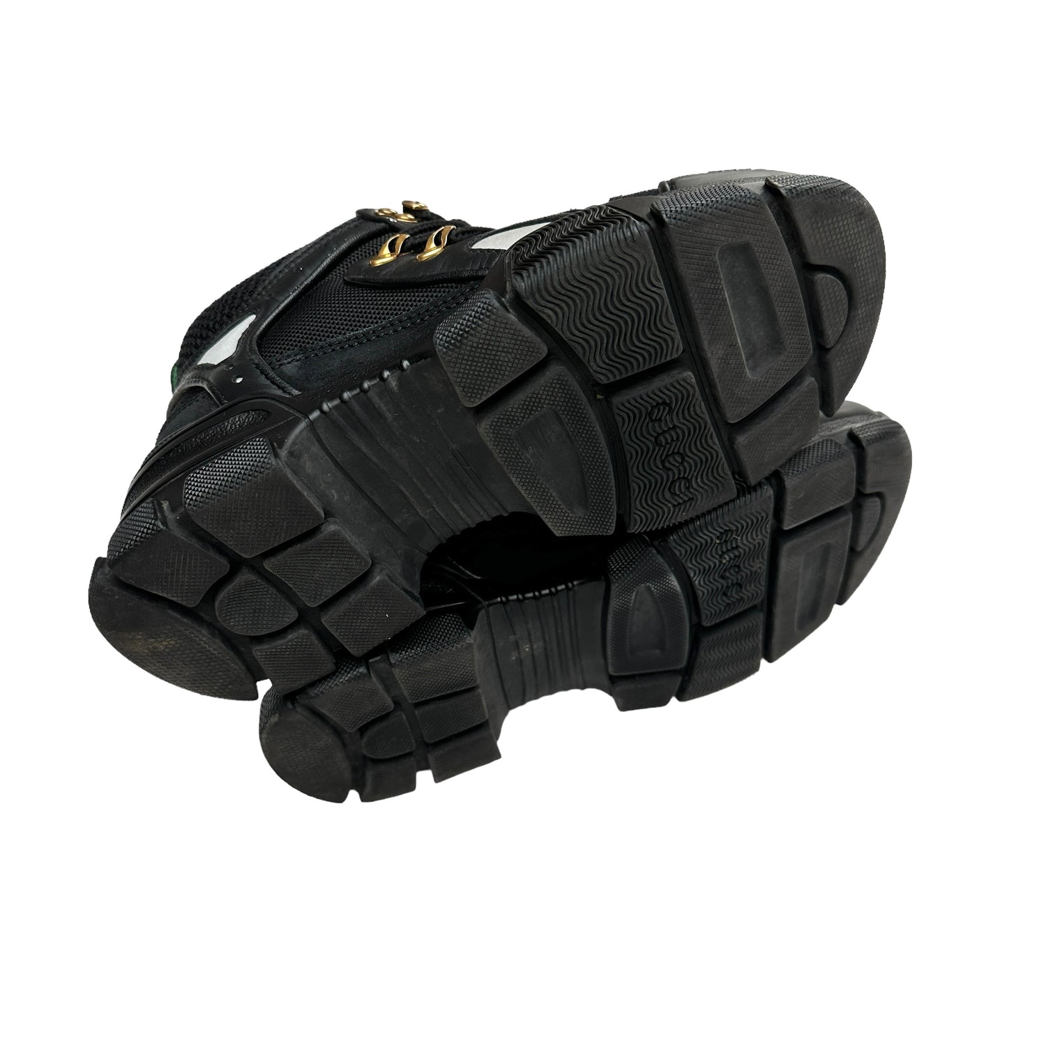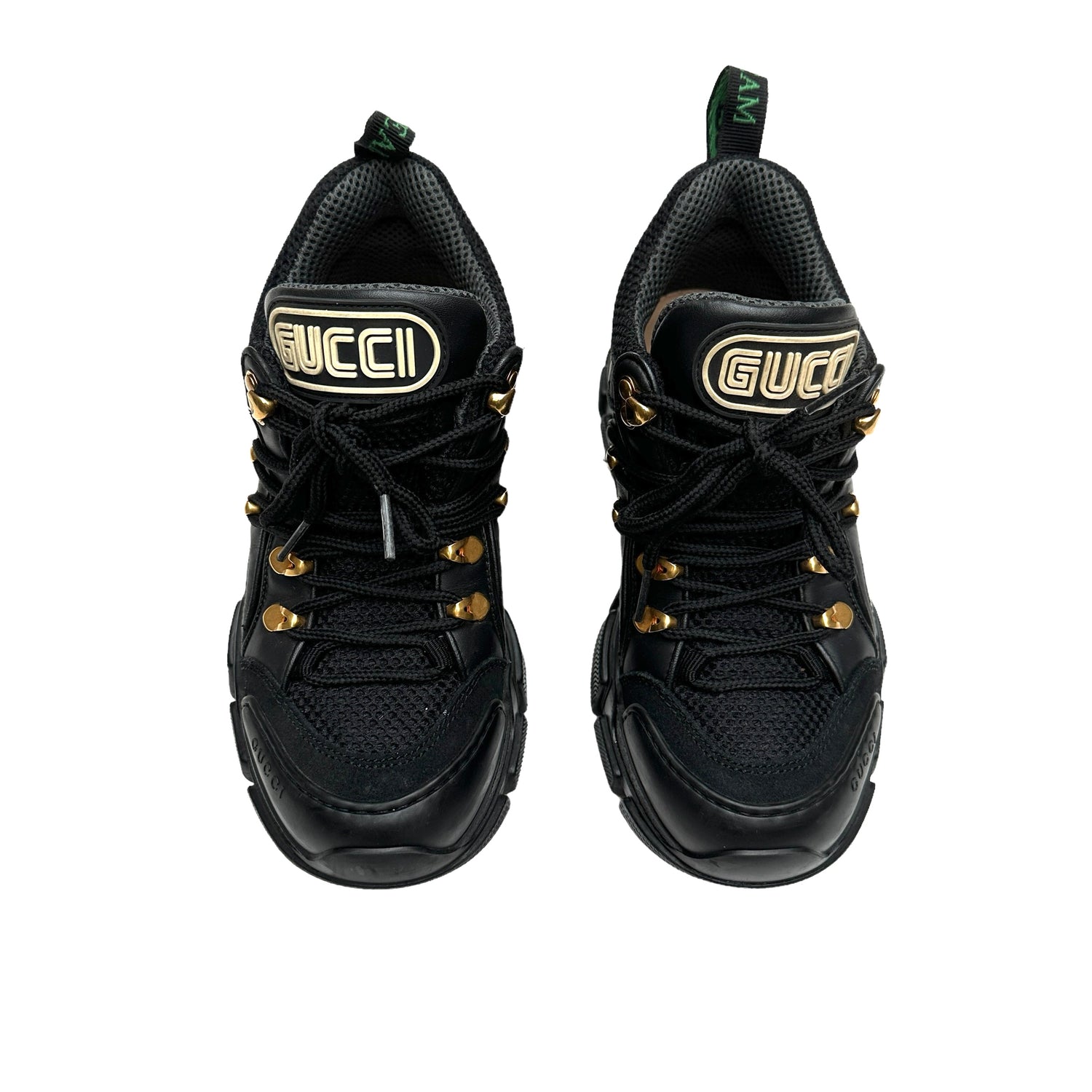 Gucci x SEGA collaboration Flashtrek sneakers. Rubber, suede and canvas details. Chunk rubber soles. Lace closure at top. Gold-tone hardware. Gucci logo at top and back. Designer size 36.5