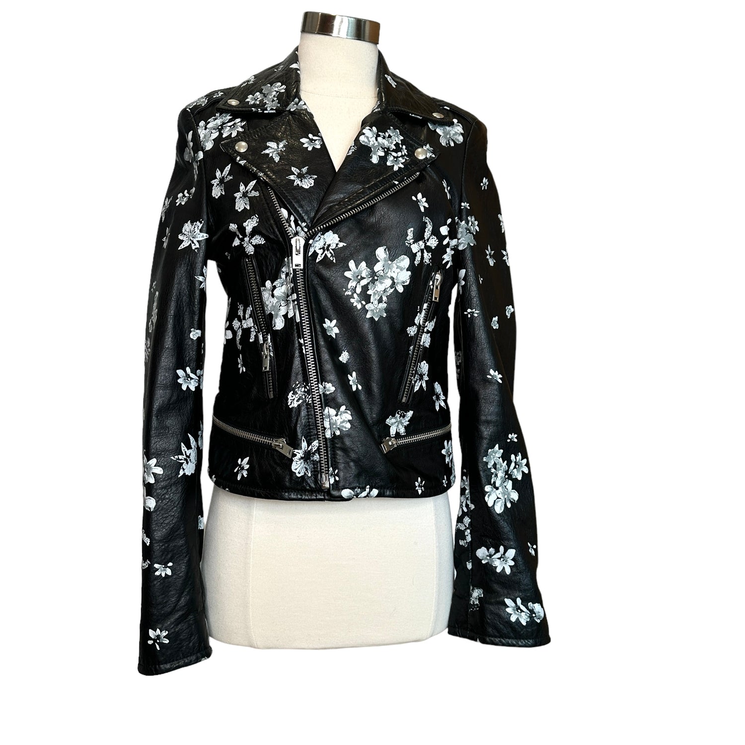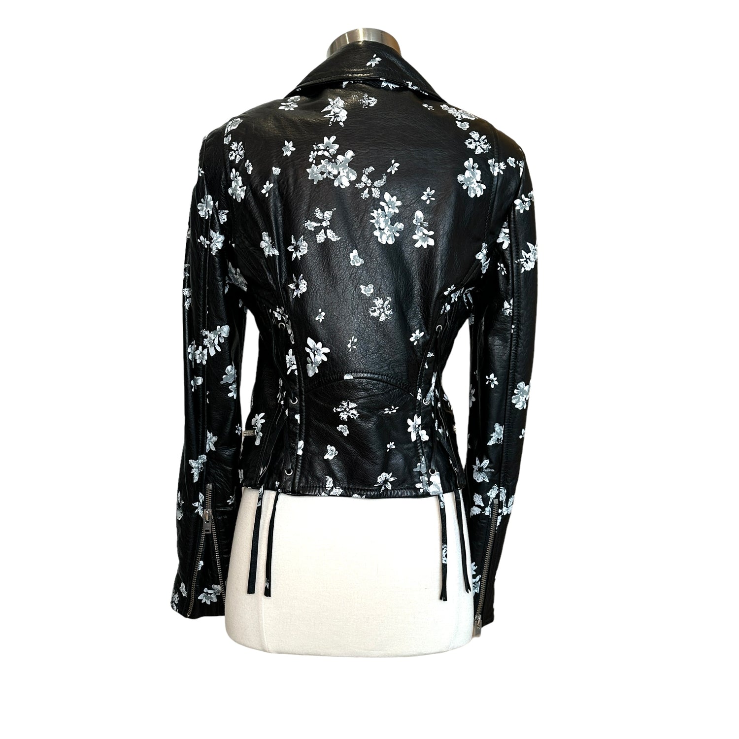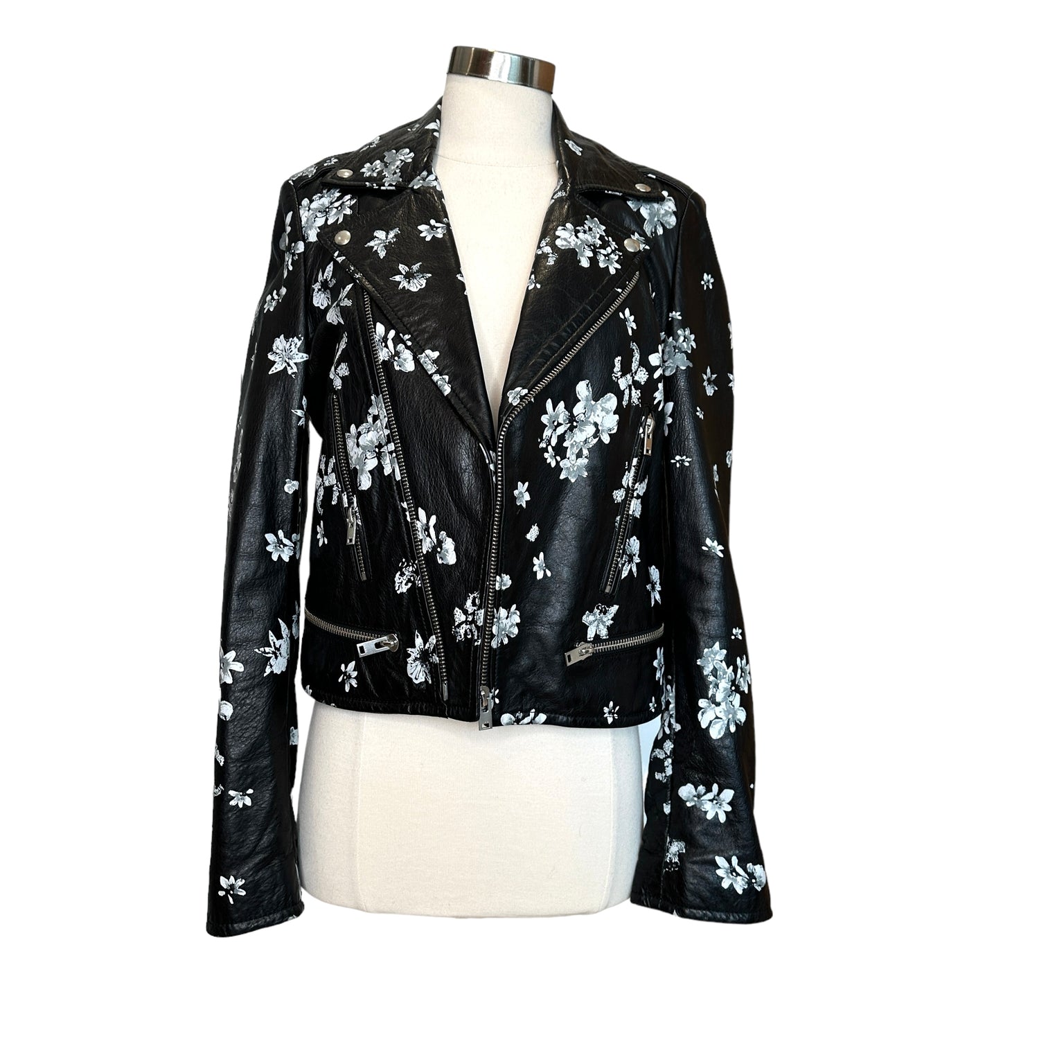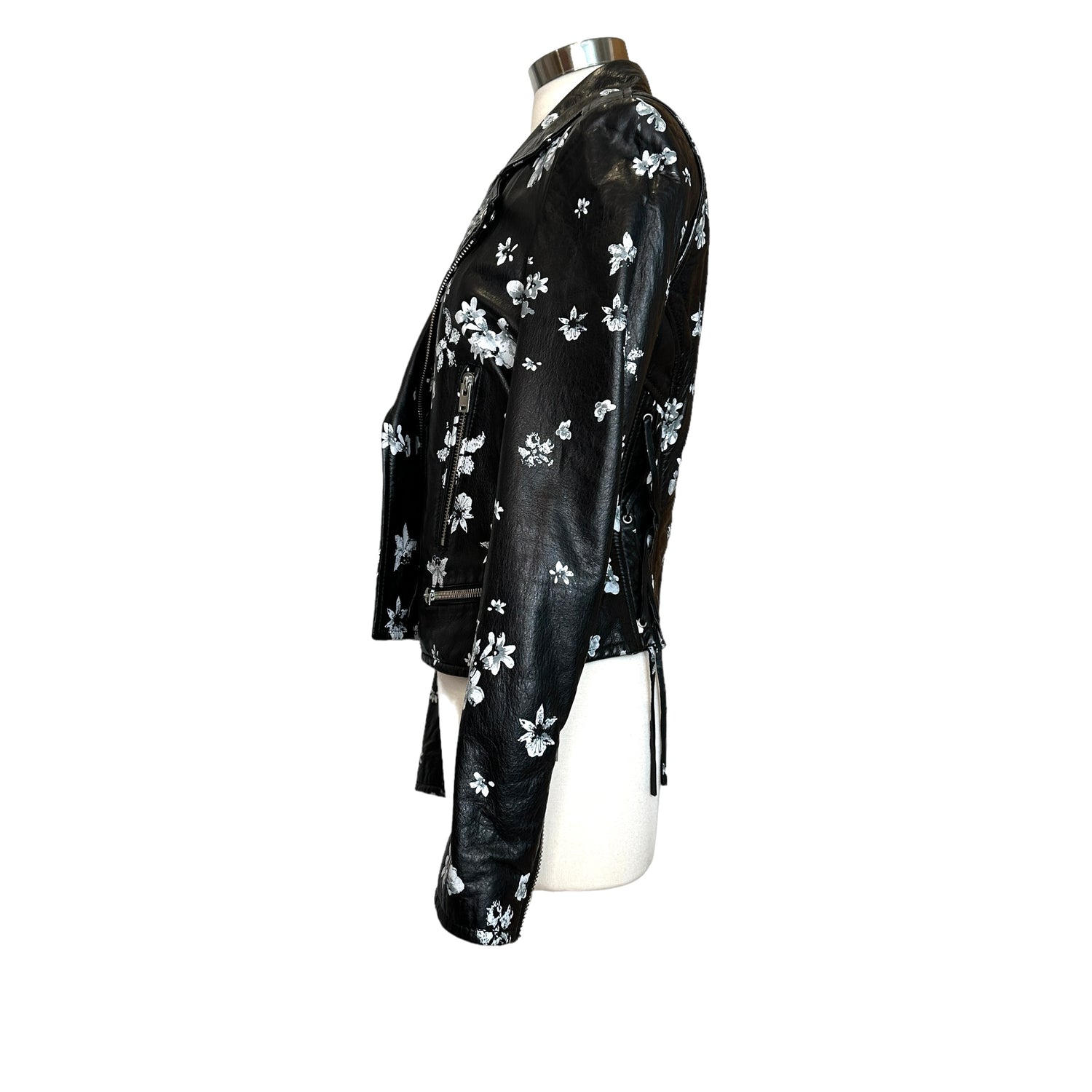 IRO black lambskin leather jacket with white floral print. Spring 2017 collection. Pockets. Zipper at front. Silver-tone hardware. Tassel details at back. Designer size 38.