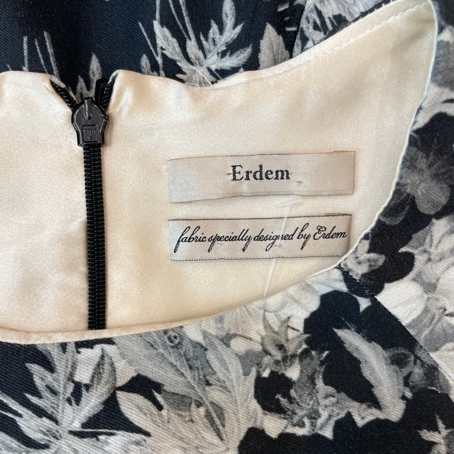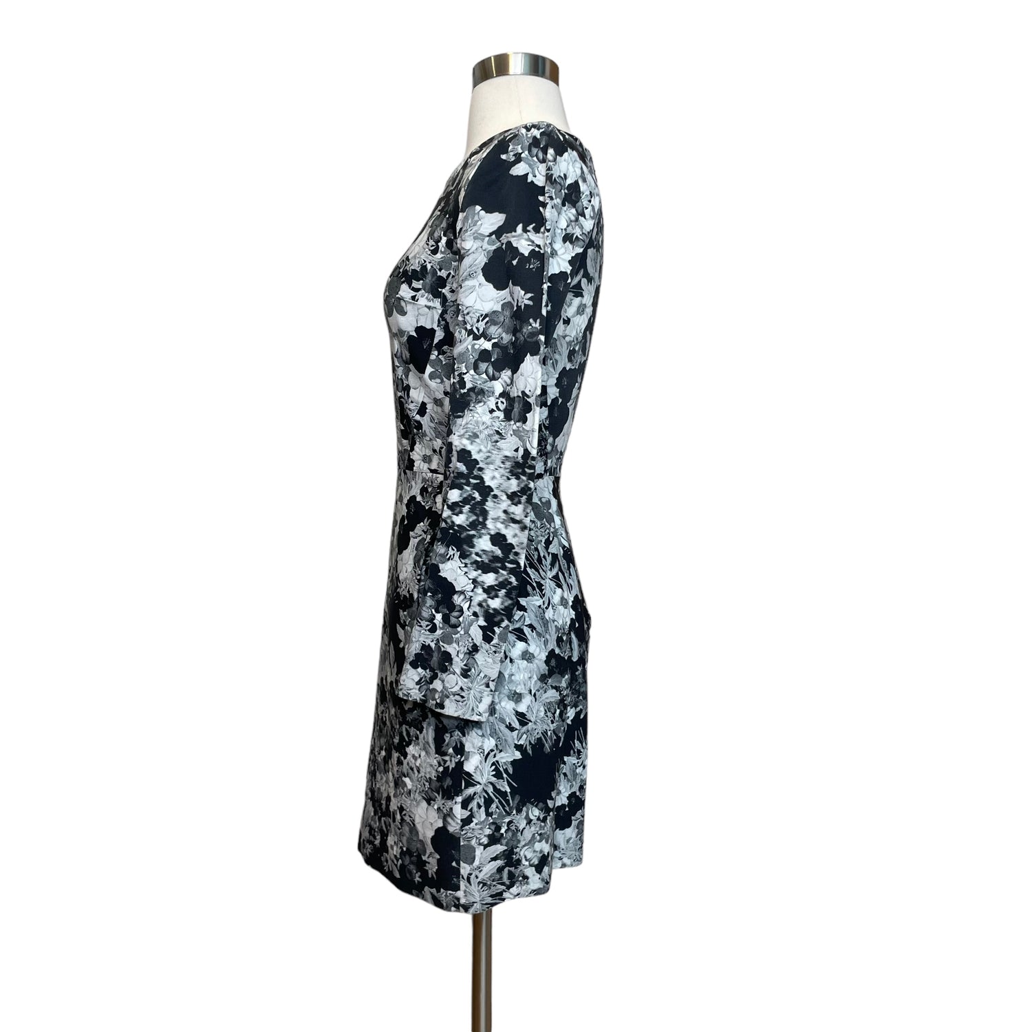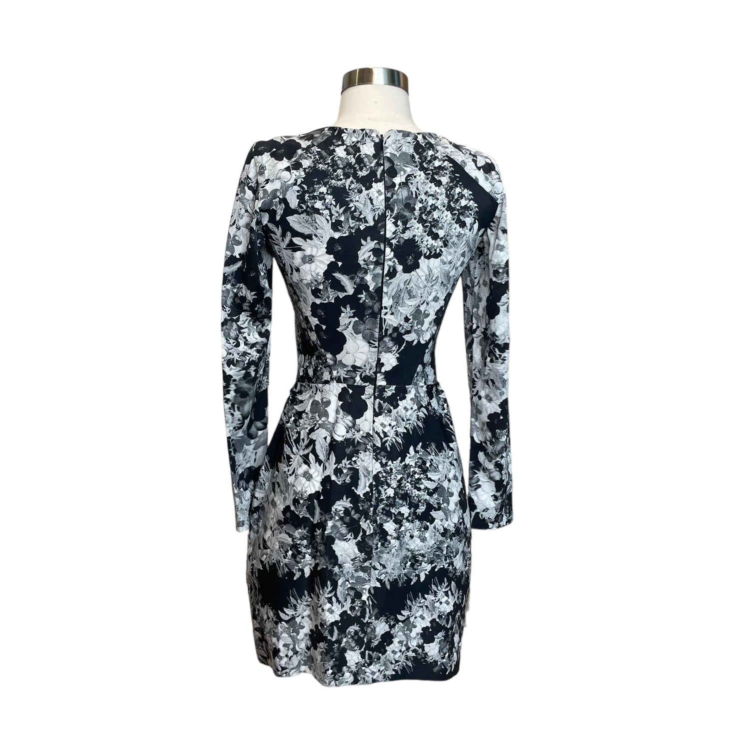 Erdem black and grey floral long sleeve fitted dress. Concealed zipper closure at back. Slit pockets at front. Designer size 0