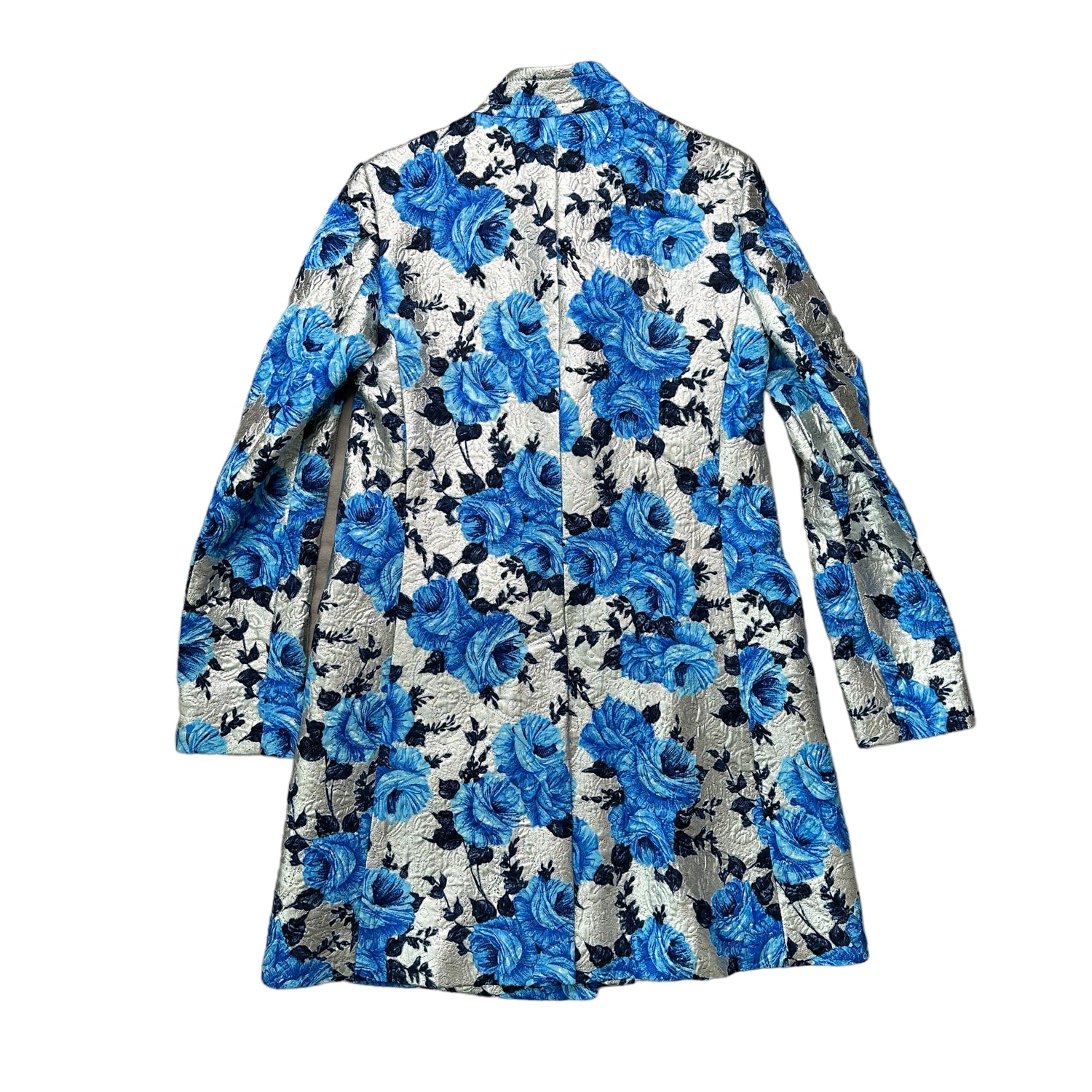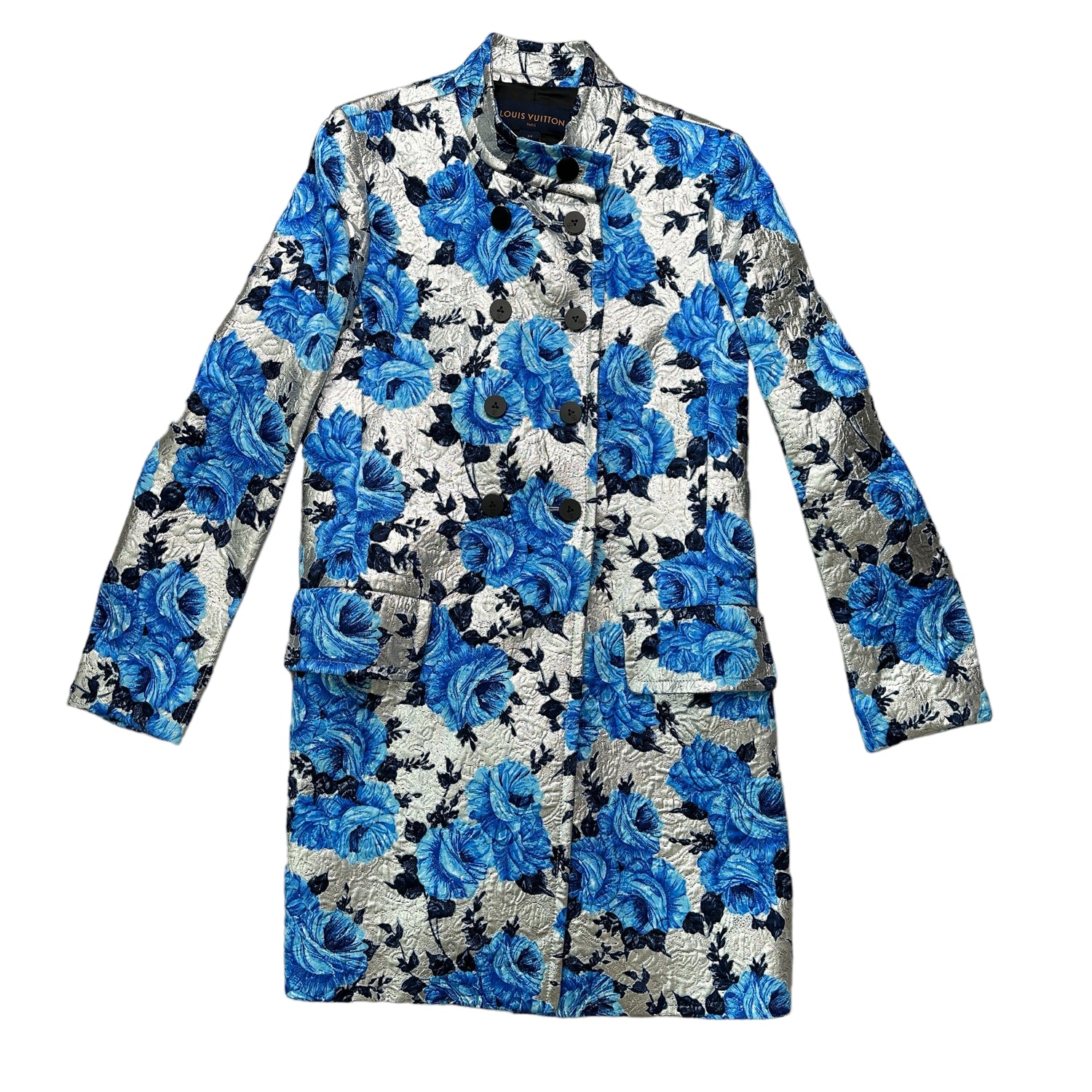 Louis Vuitton floral blue and silver coat. Button closure at front. Designer size 34.