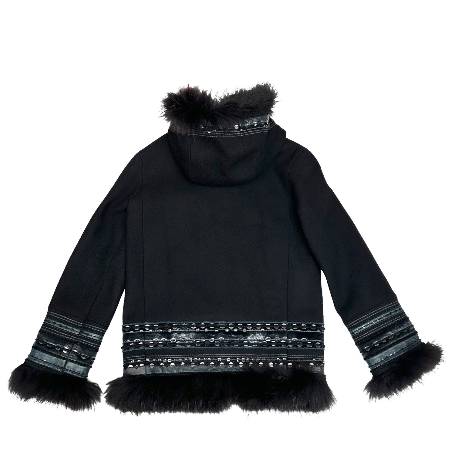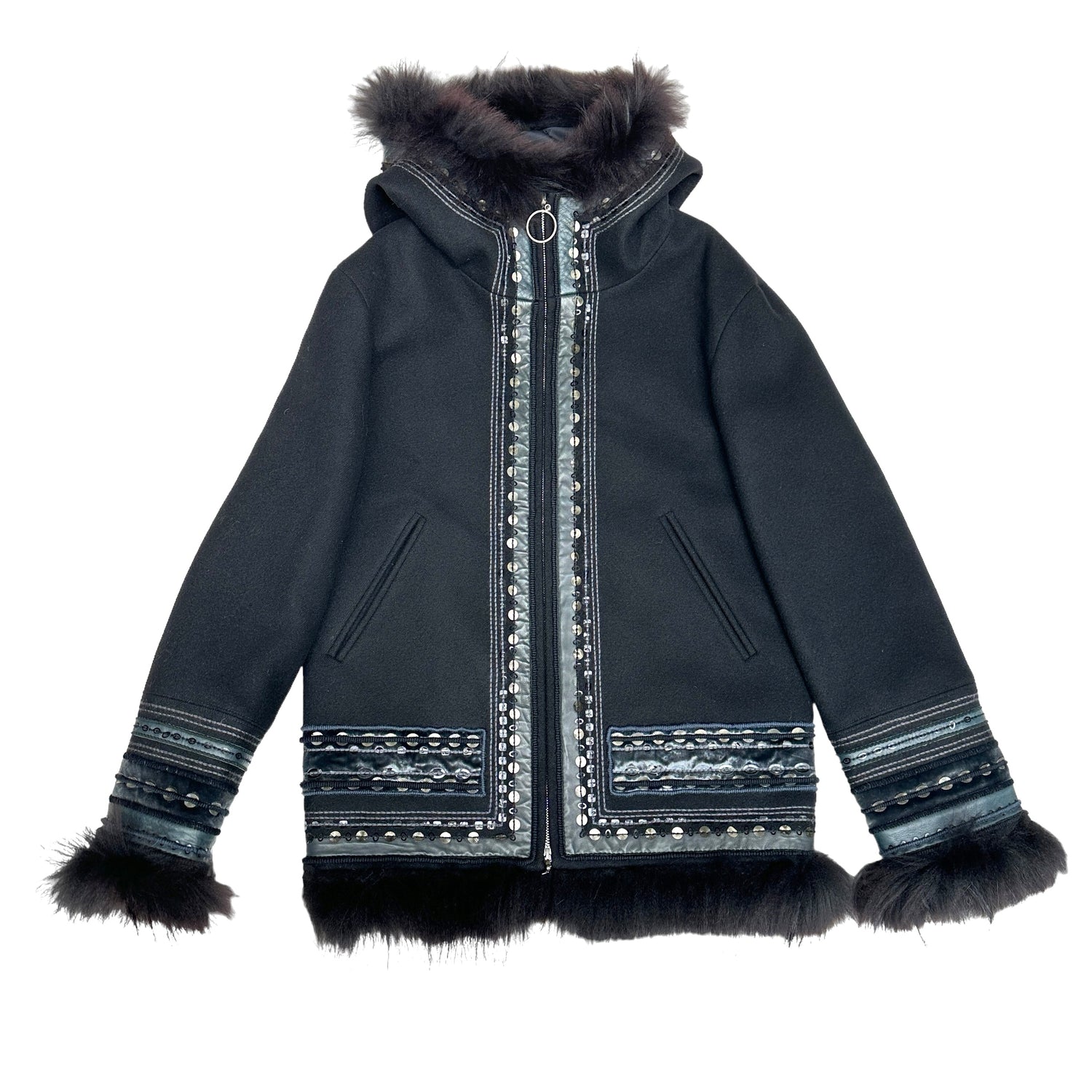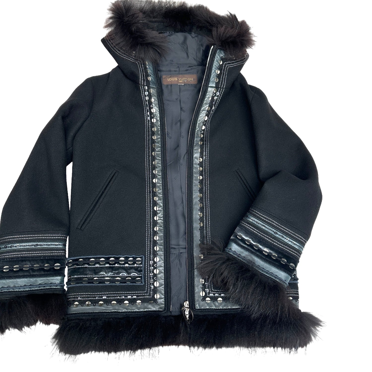 Louis Vuitton fur coat with sequins and embroidery. Fur trim at sleeves, bottom and hoodie. Hooded coat. Two pockets. Black wool with leather trims. This coat is extremely special and well crafted.