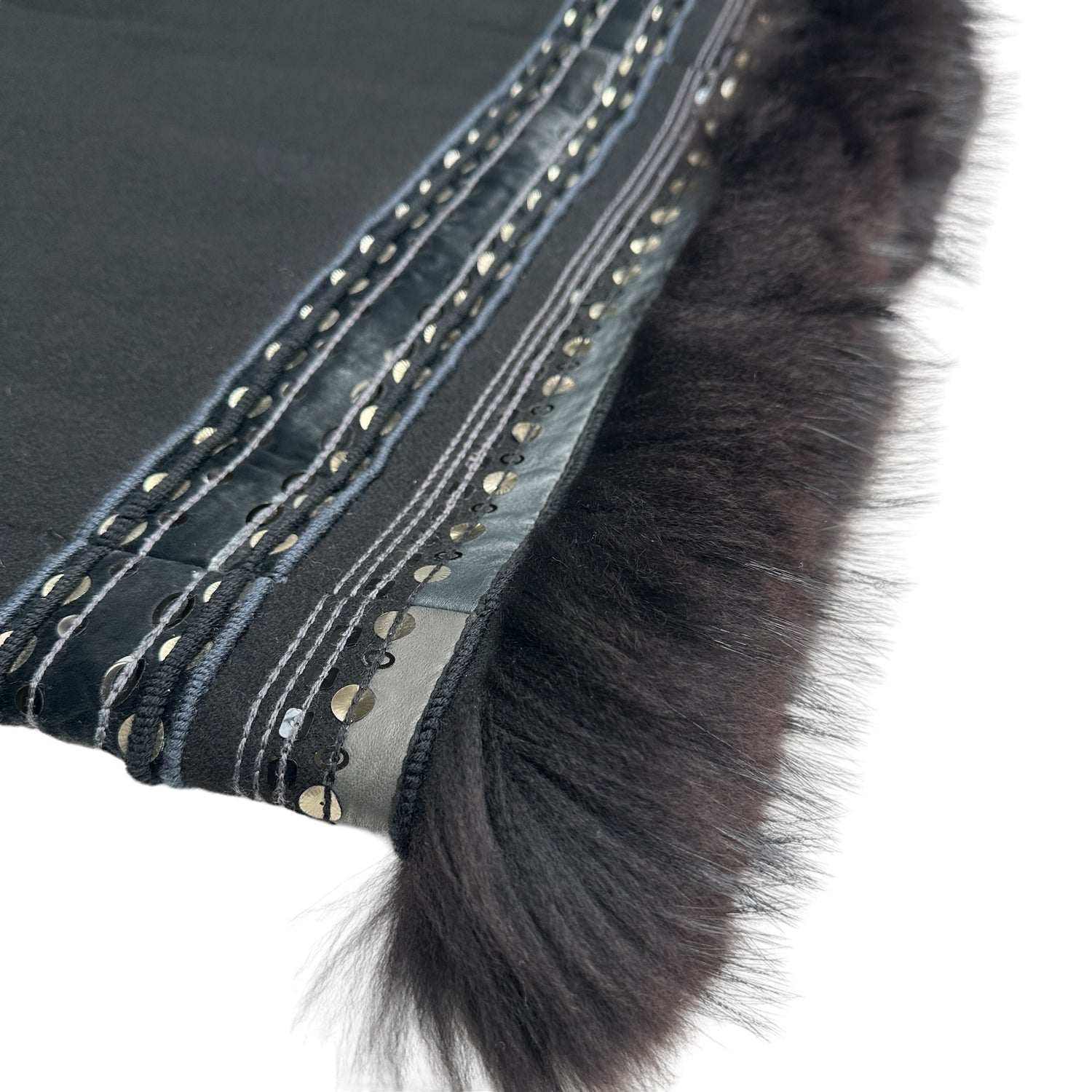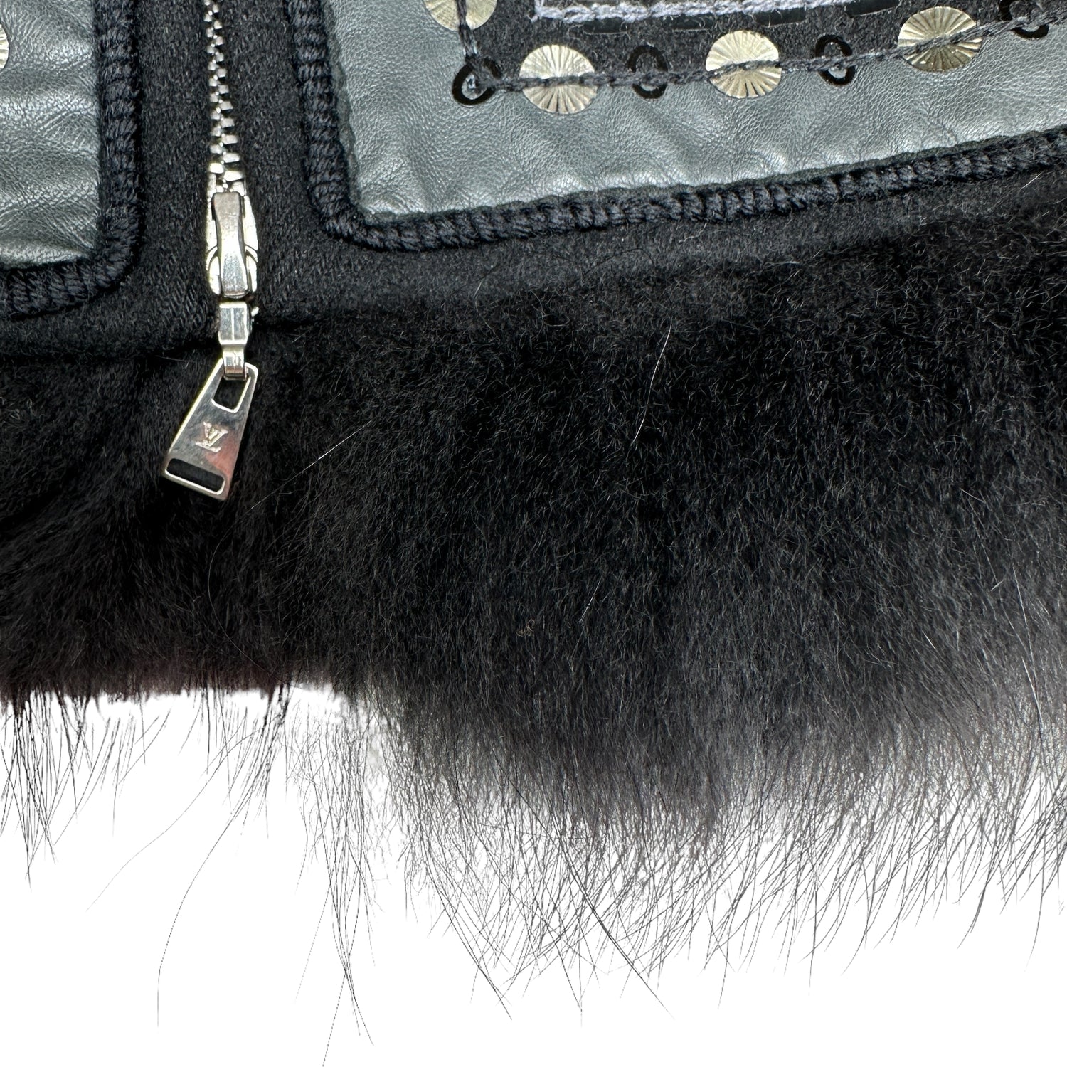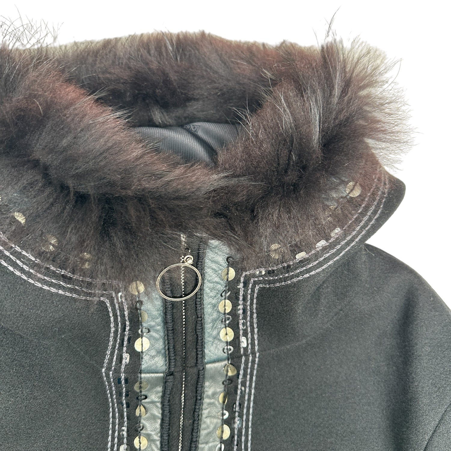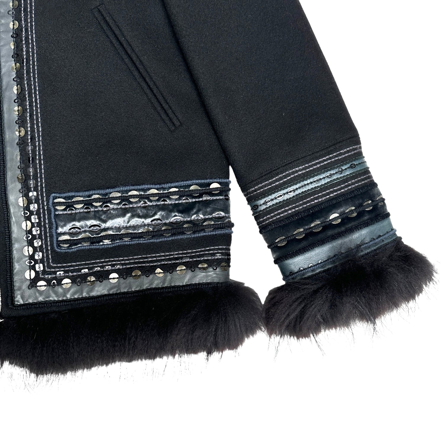 Louis Vuitton fur coat with sequins and embroidery. Fur trim at sleeves, bottom and hoodie. Hooded coat. Two pockets. Black wool with leather trims. This coat is extremely special and well crafted.