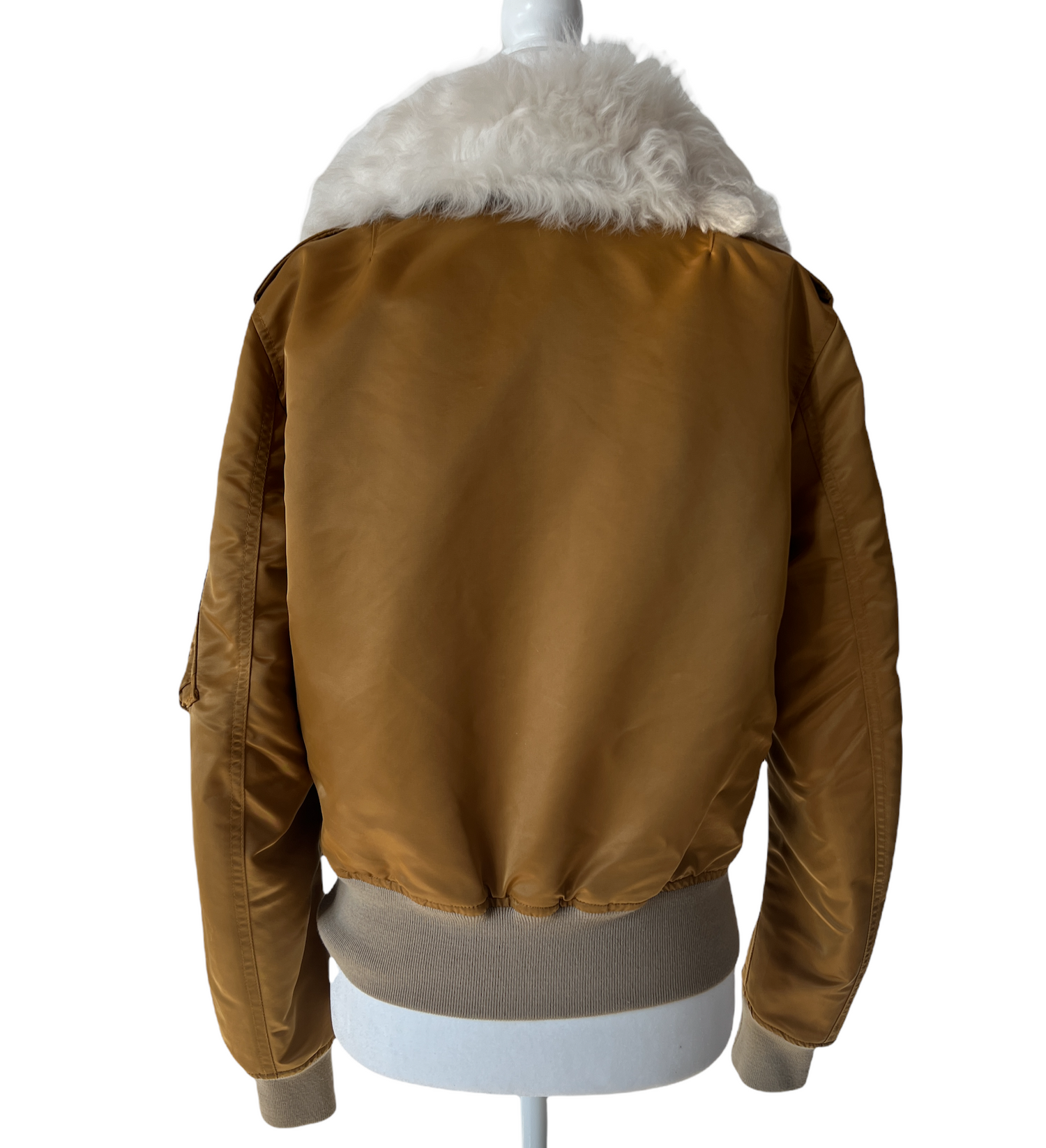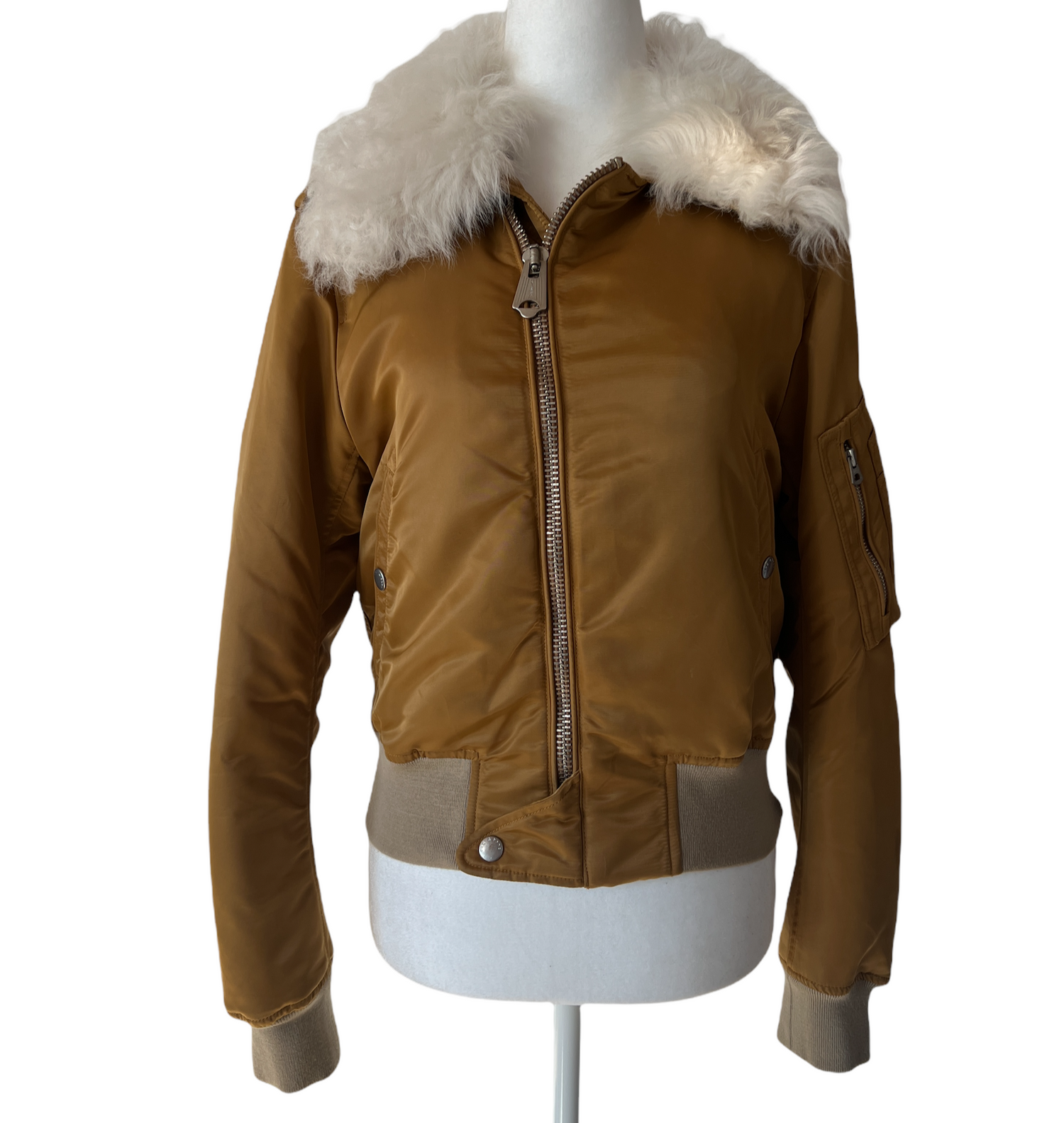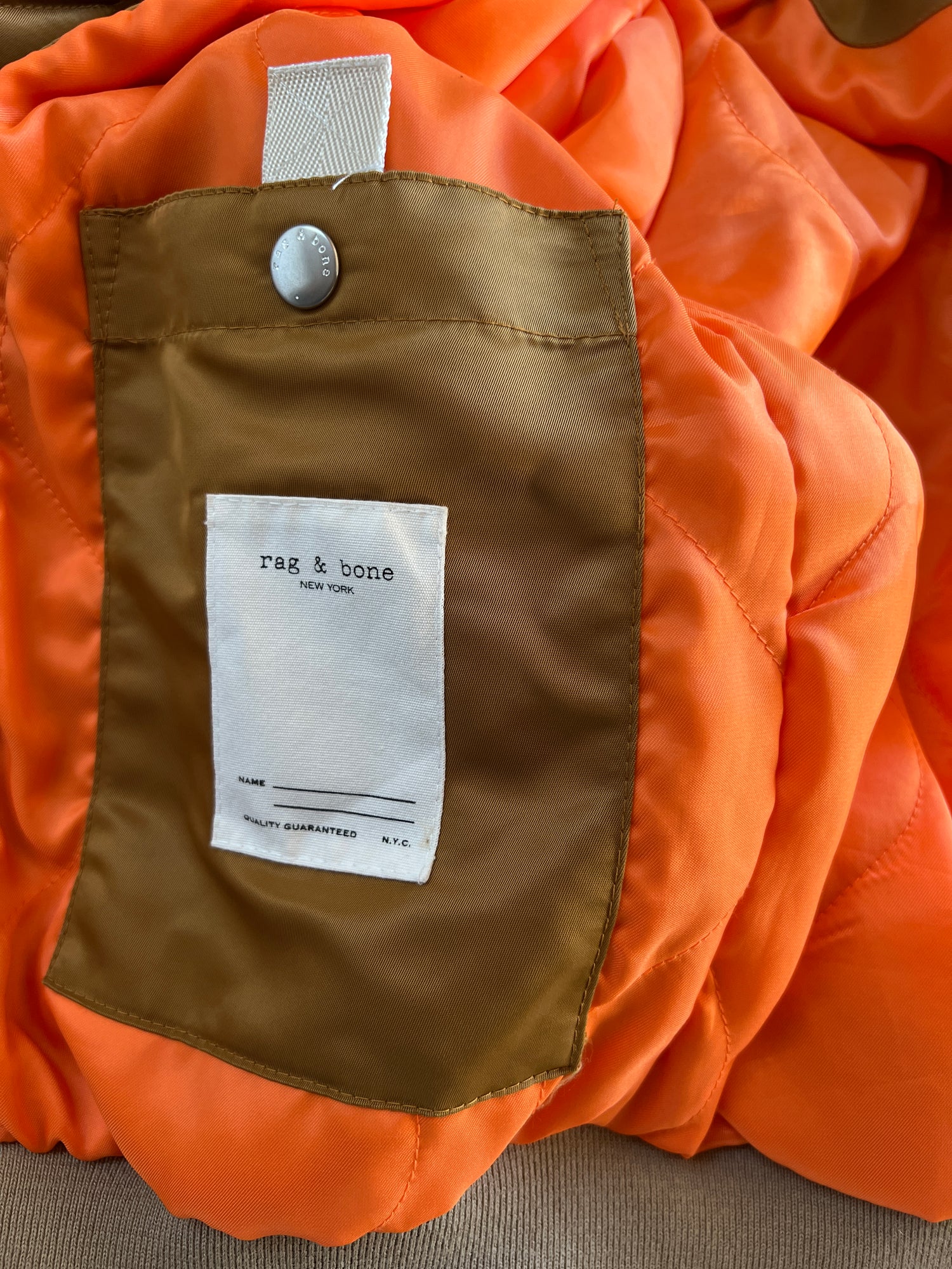 Beautiful Bomber from Rag & Bone. Removable fur collar. Orange Lining. Zipper closure at front. Two inside pockets. Two snap closure outer side pockets. Collar Lamb Suede Shearling. Jacket Nylon Cotton Combo.