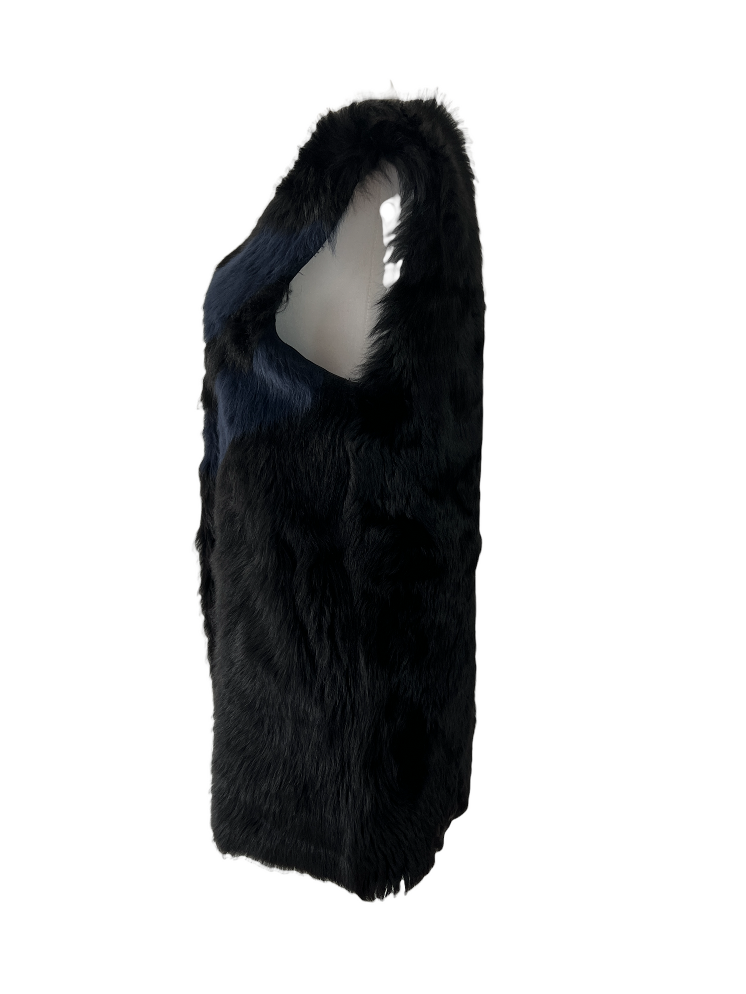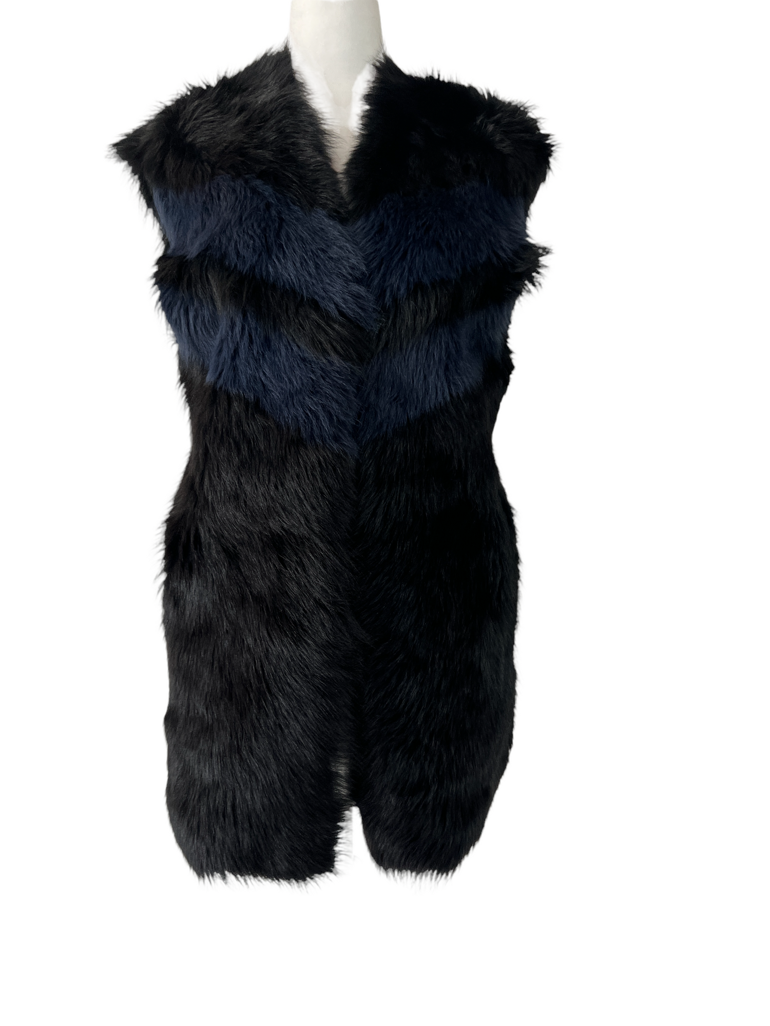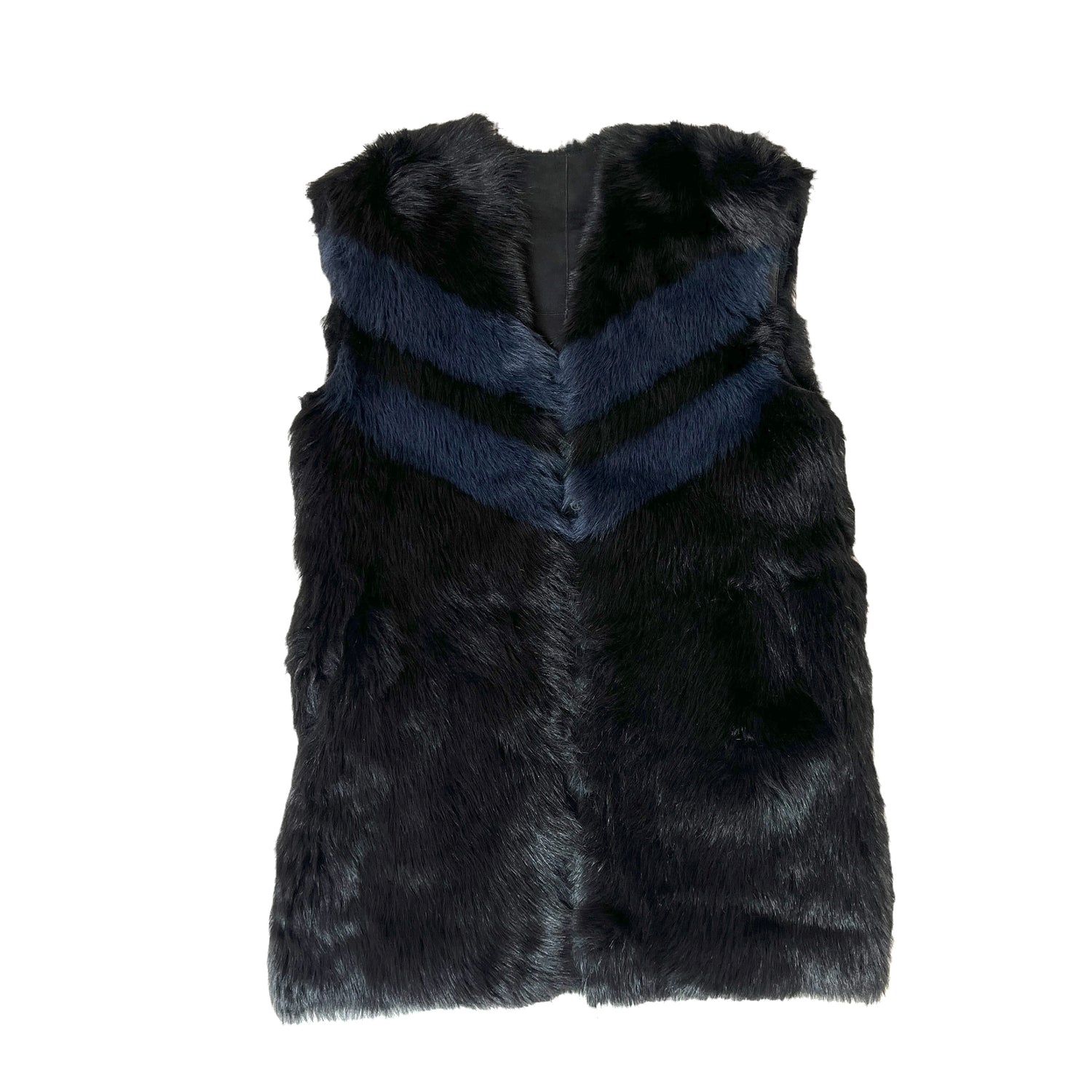 IRO Fur vest. Black and midnight blue fur. Blue chevron details on the chest. This vest is reversible. Leather trims at shoulder. Designer size 36.