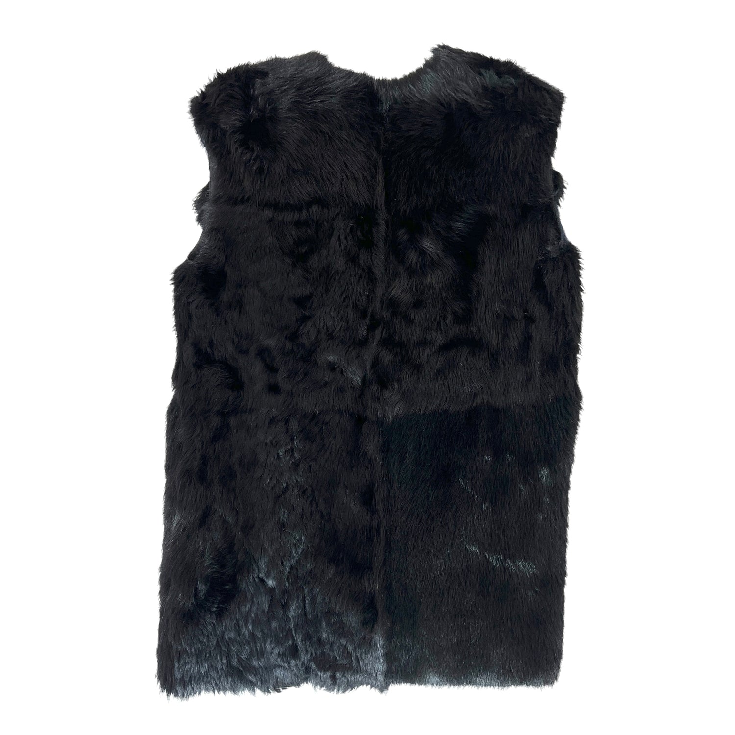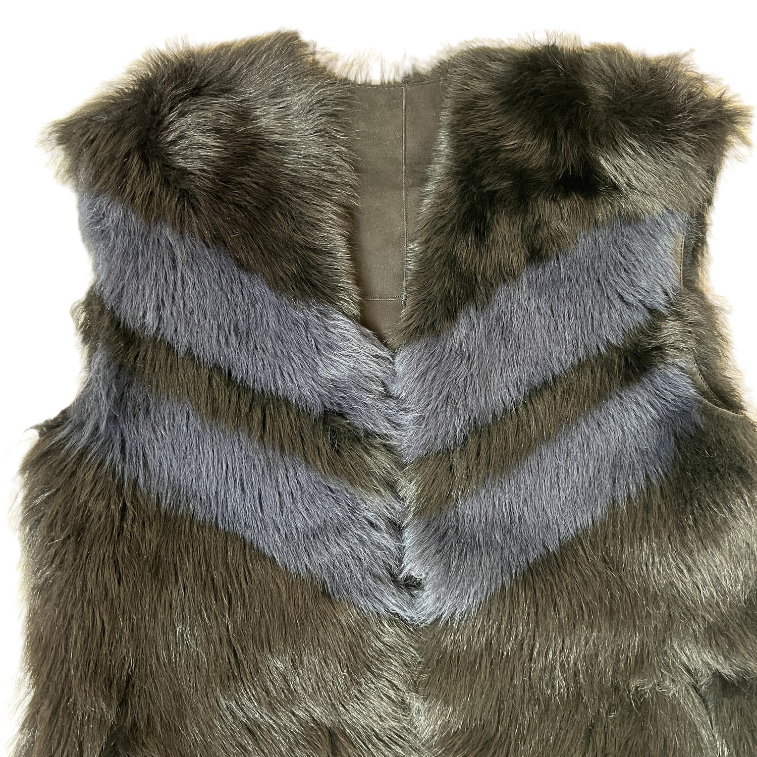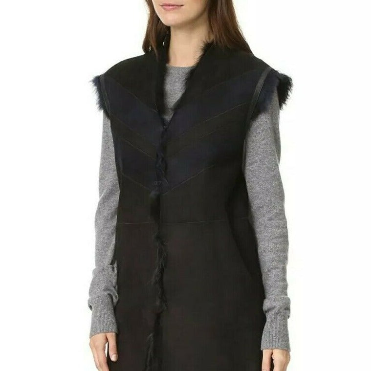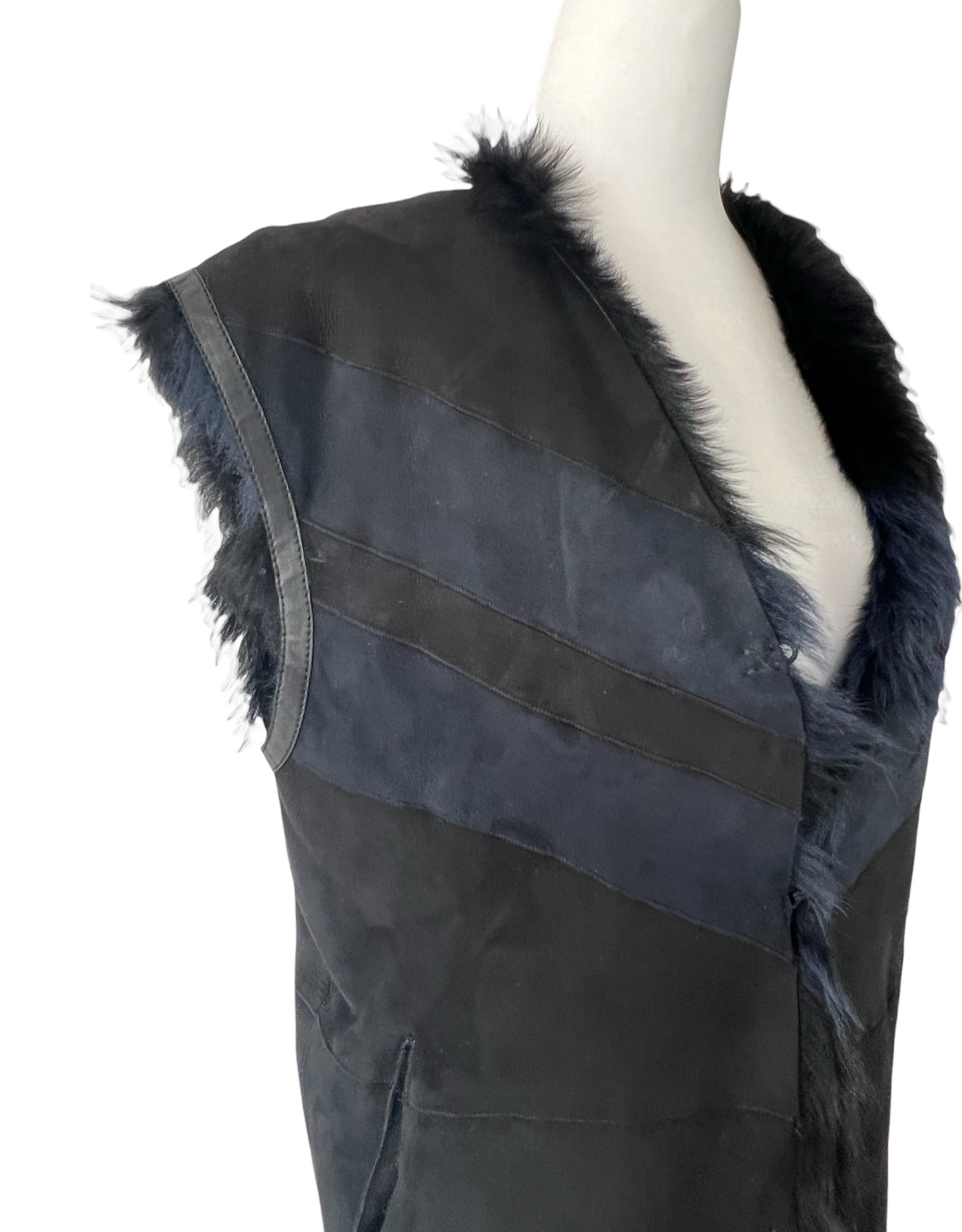 IRO Fur vest. Black and midnight blue fur. Blue chevron details on the chest. This vest is reversible. Leather trims at shoulder. Designer size 36.