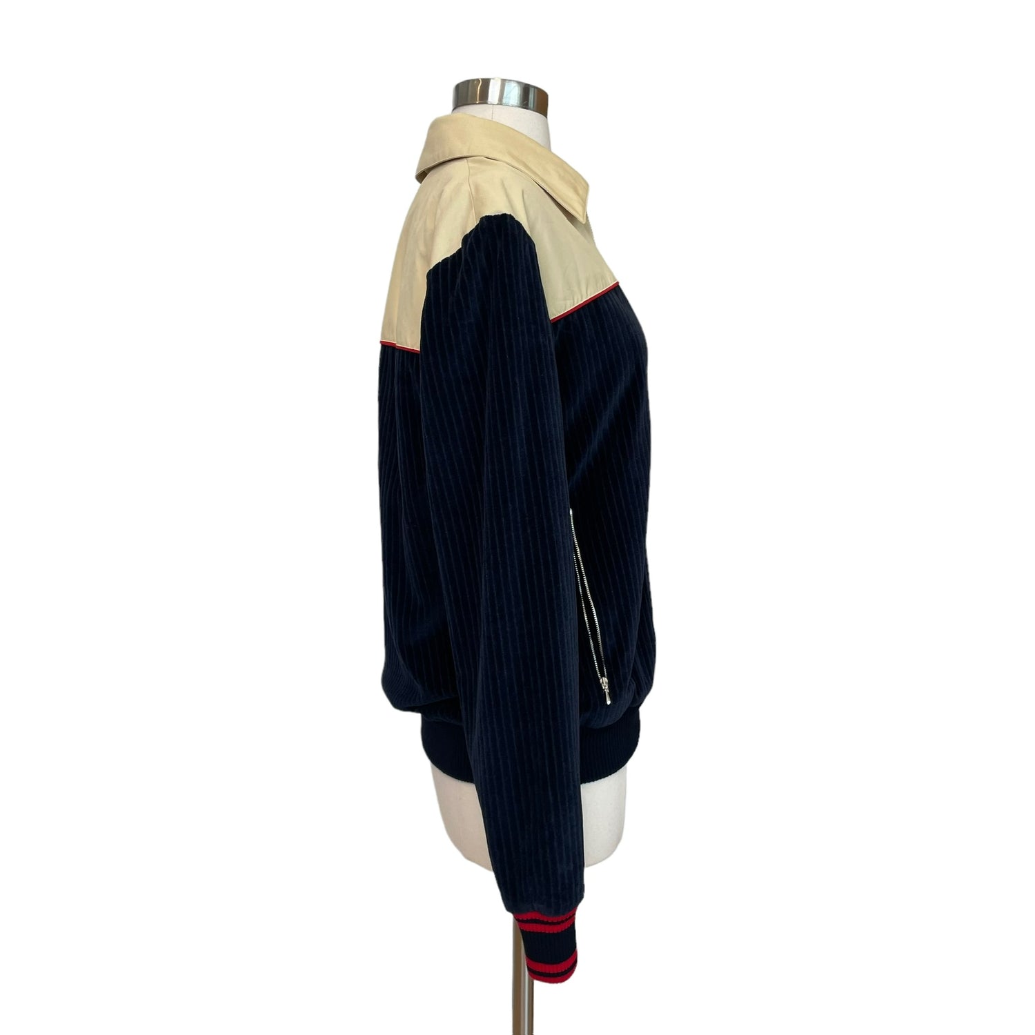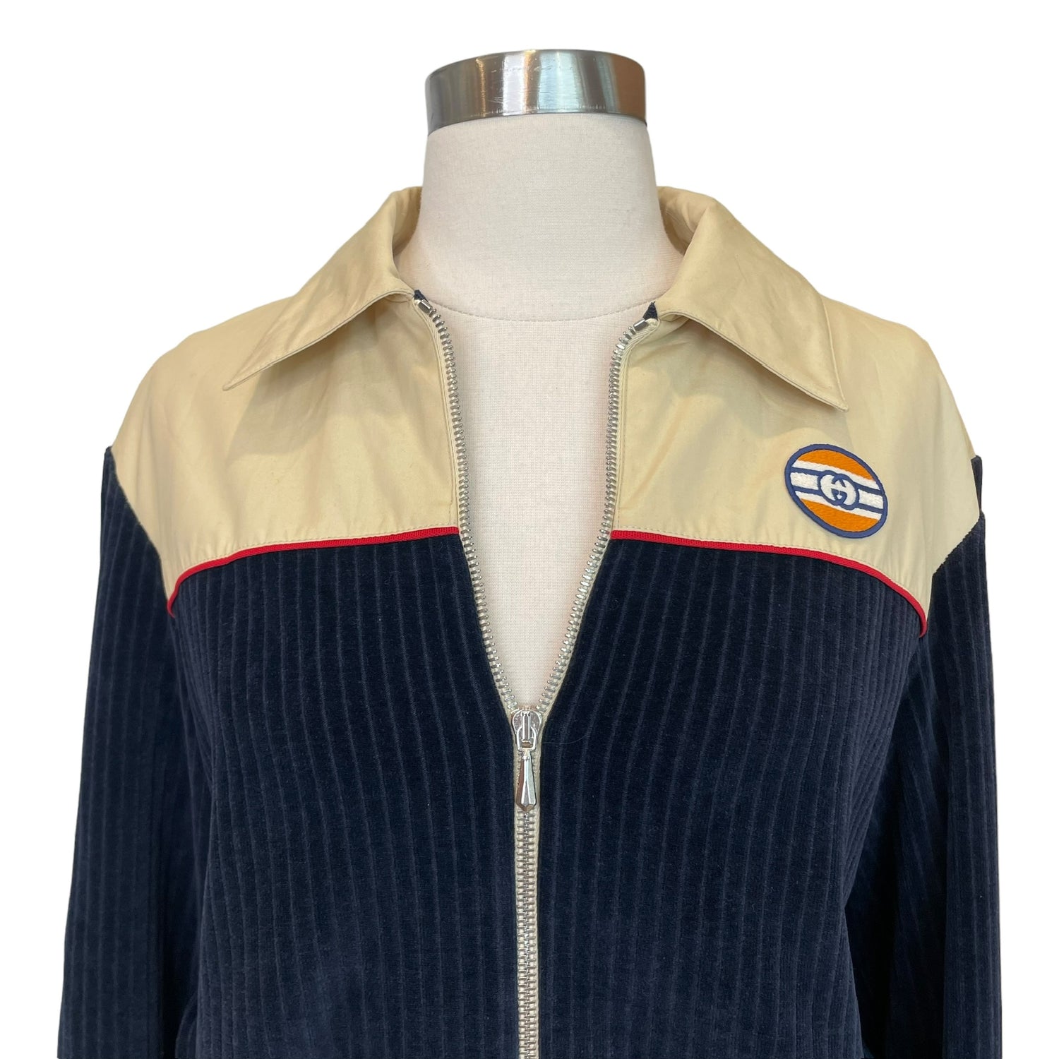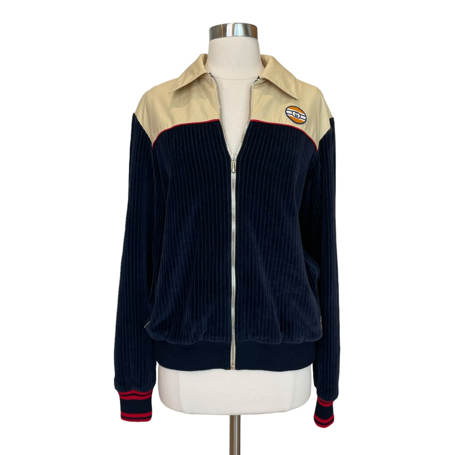 Gucci bomber jacket. Navy velvet. Beige cotton shoulders with GG logo at front. Pointed collar. Silver zipper closure at front. Zipper pockets. Designer size Small.