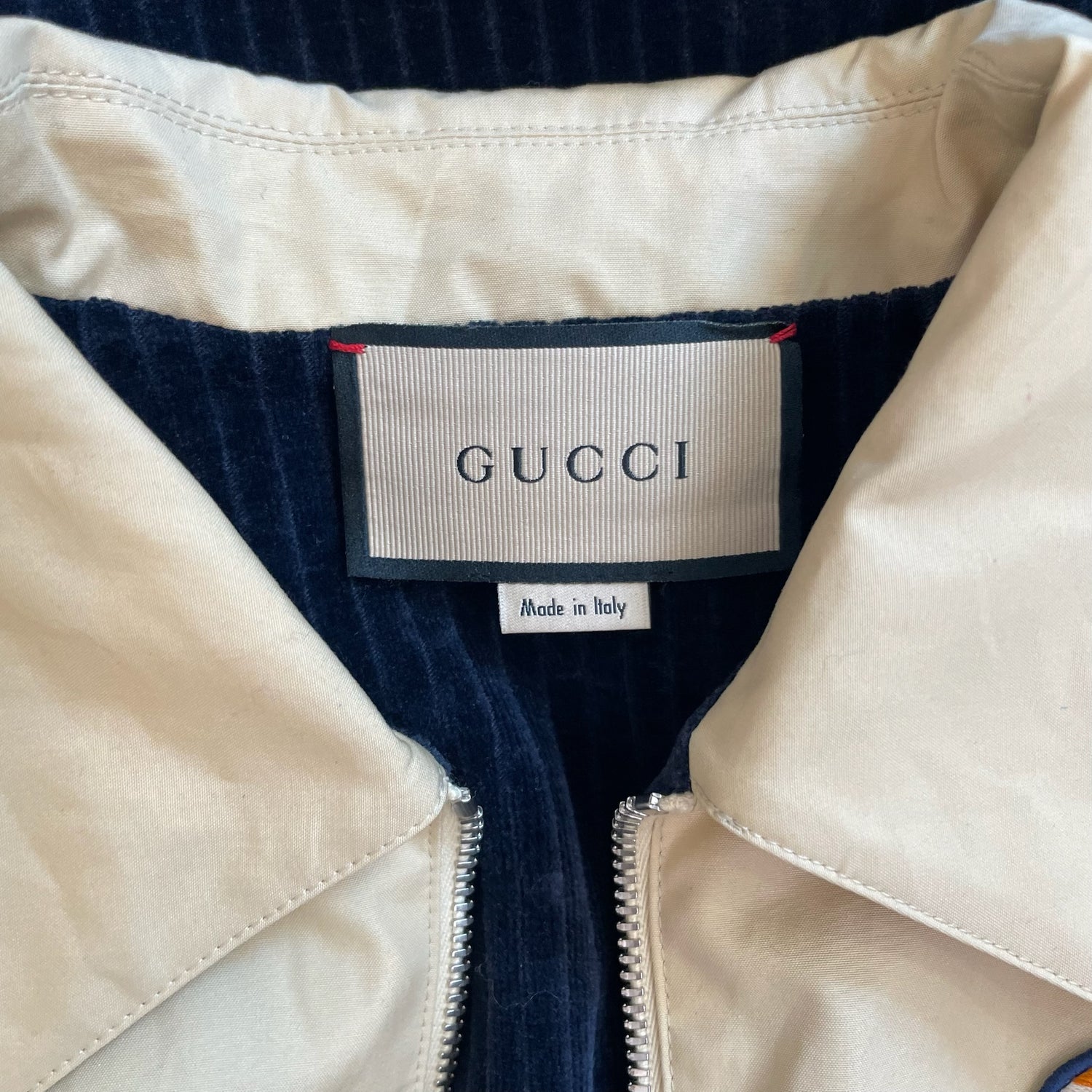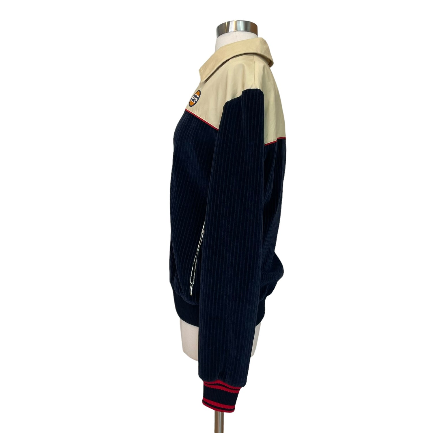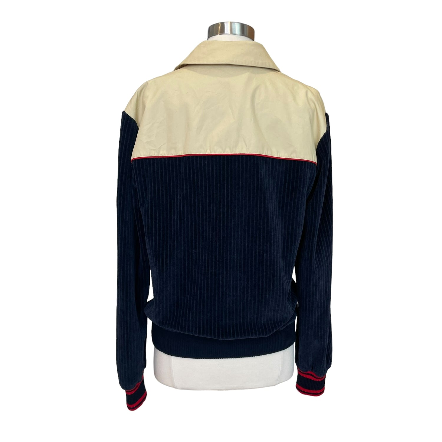 Gucci bomber jacket. Navy velvet. Beige cotton shoulders with GG logo at front. Pointed collar. Silver zipper closure at front. Zipper pockets. Designer size Small.