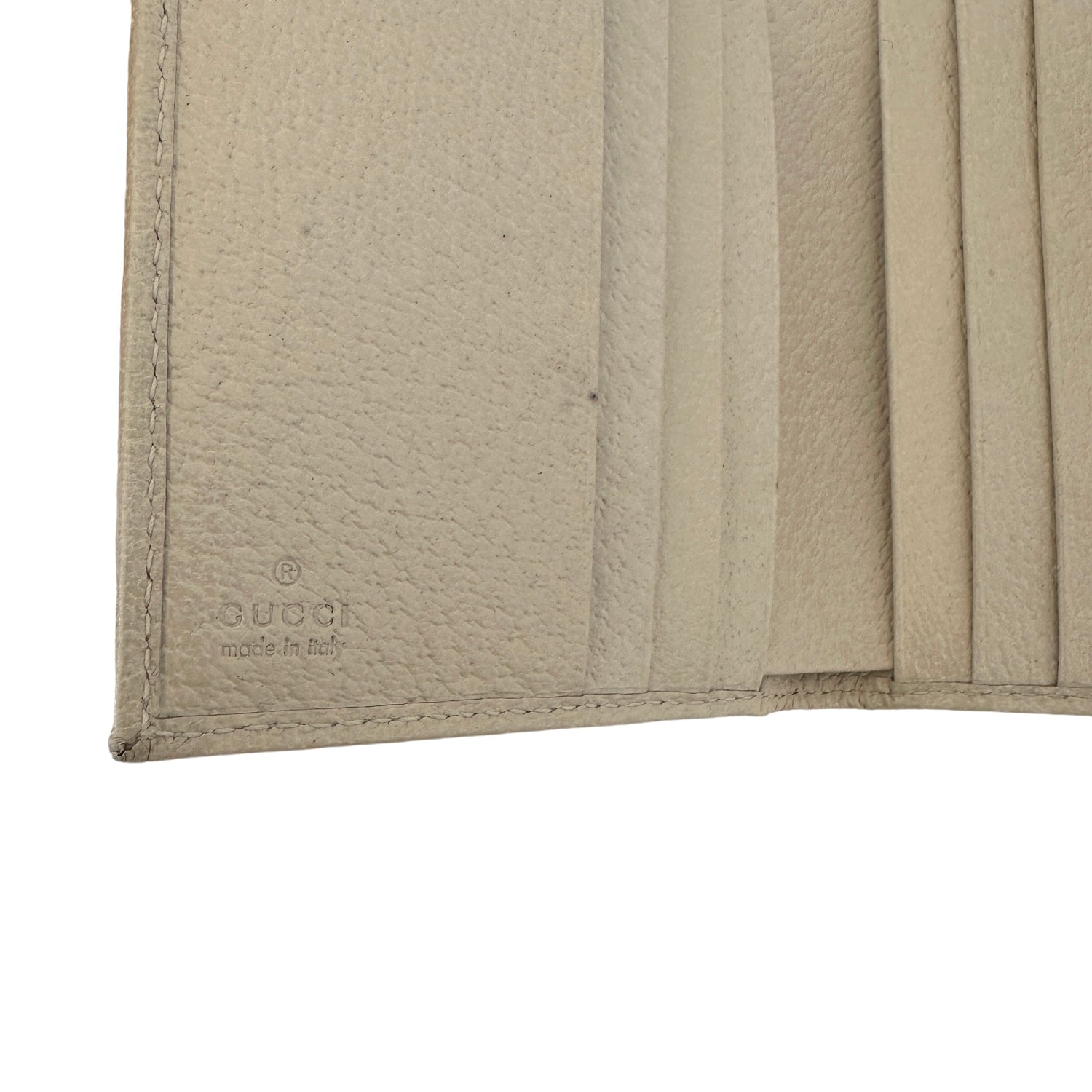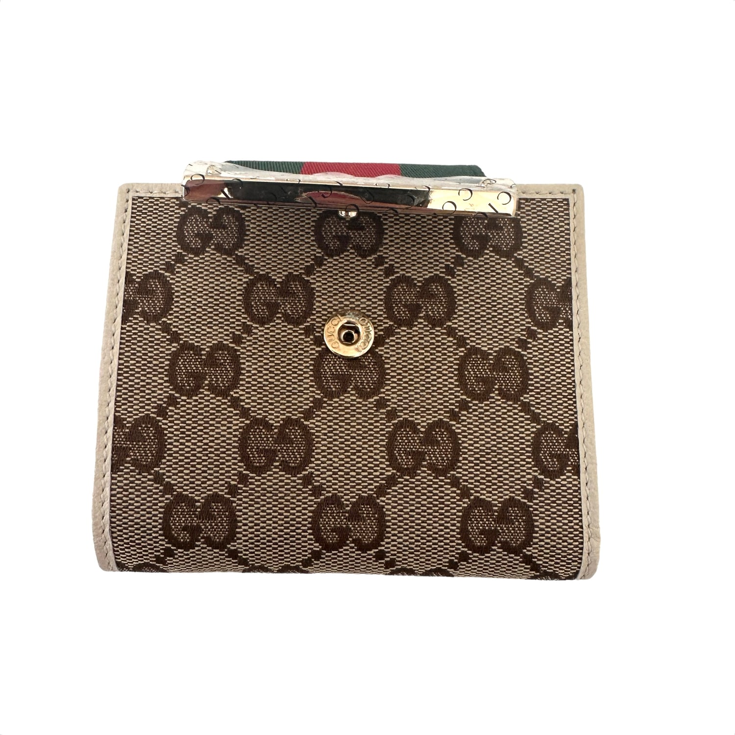 Gucci wallet. Snap closure at flap. GG canvas and beige leather. Multiple card slots. One zipper compartment for coins. Iconic red and green stripe. Gold-tone hardware.