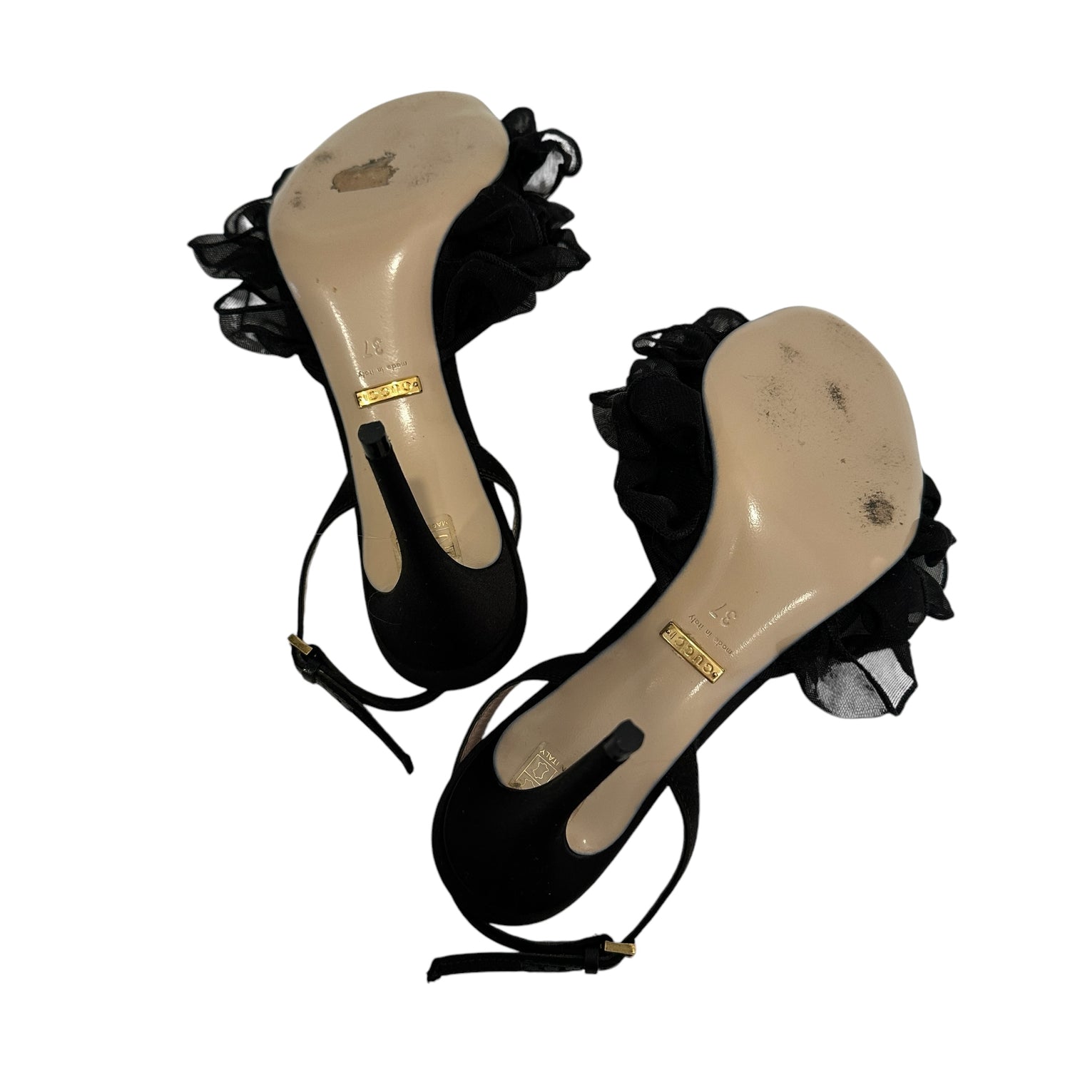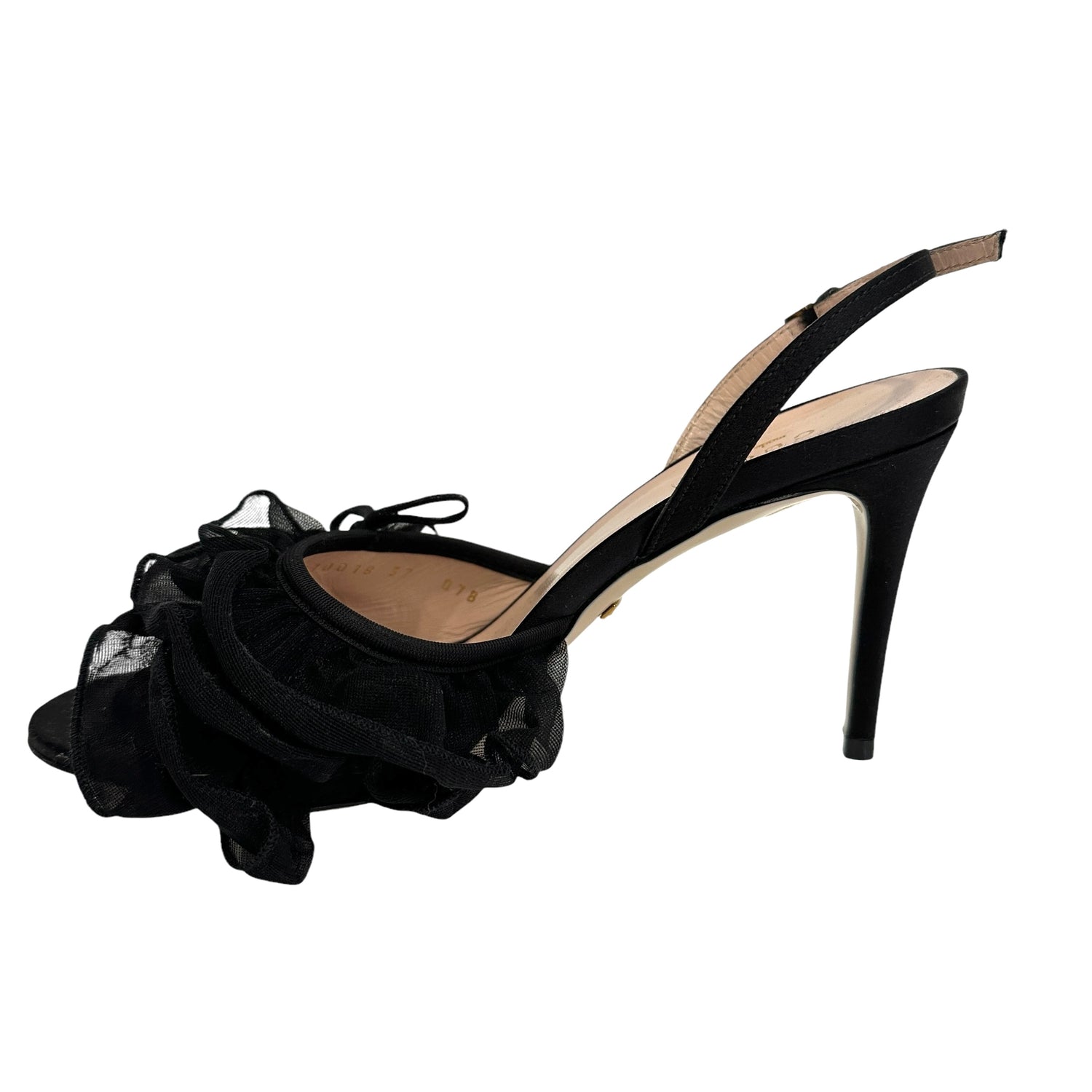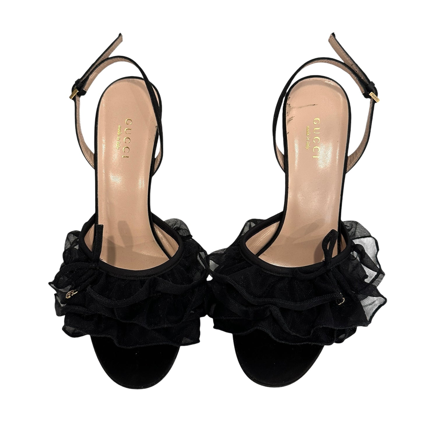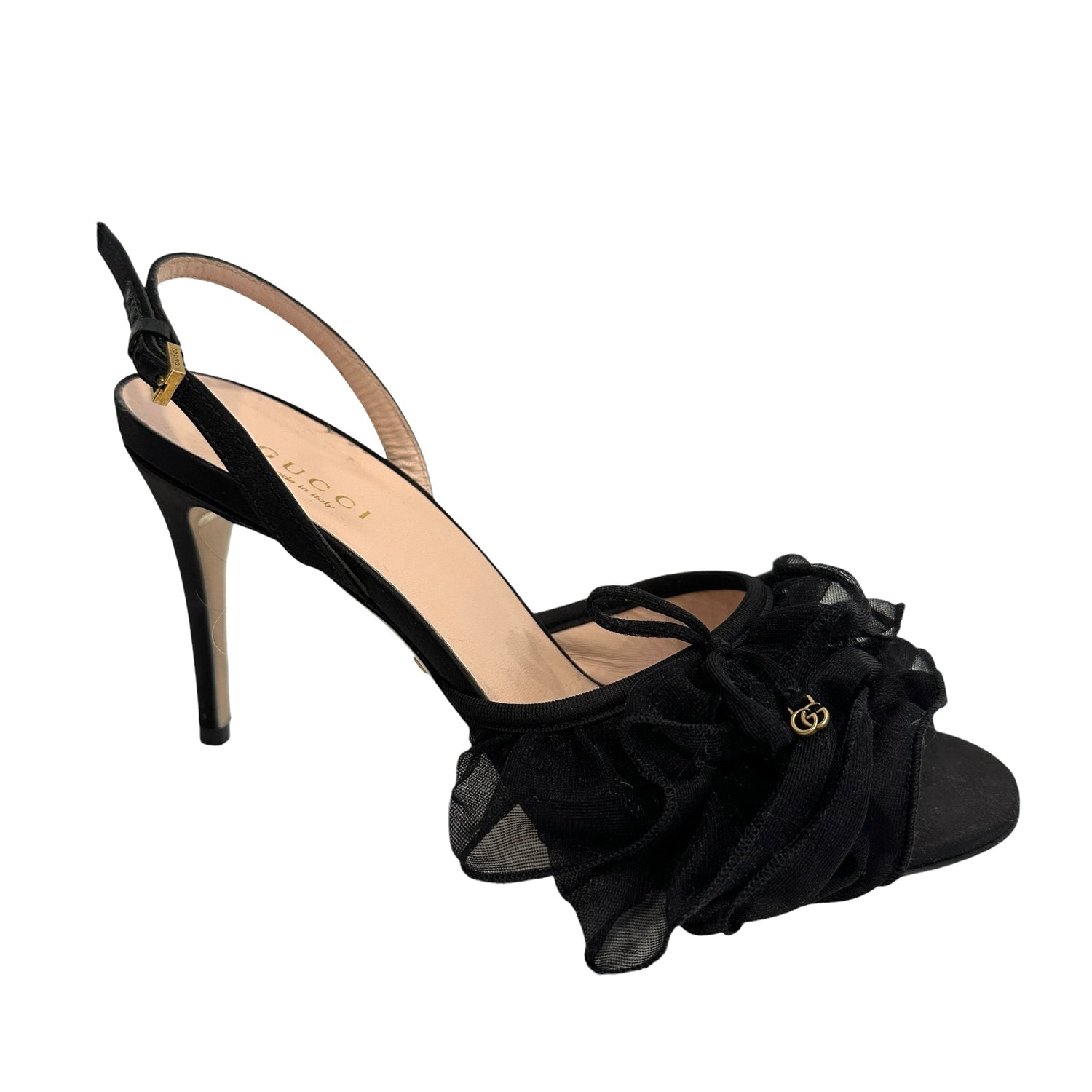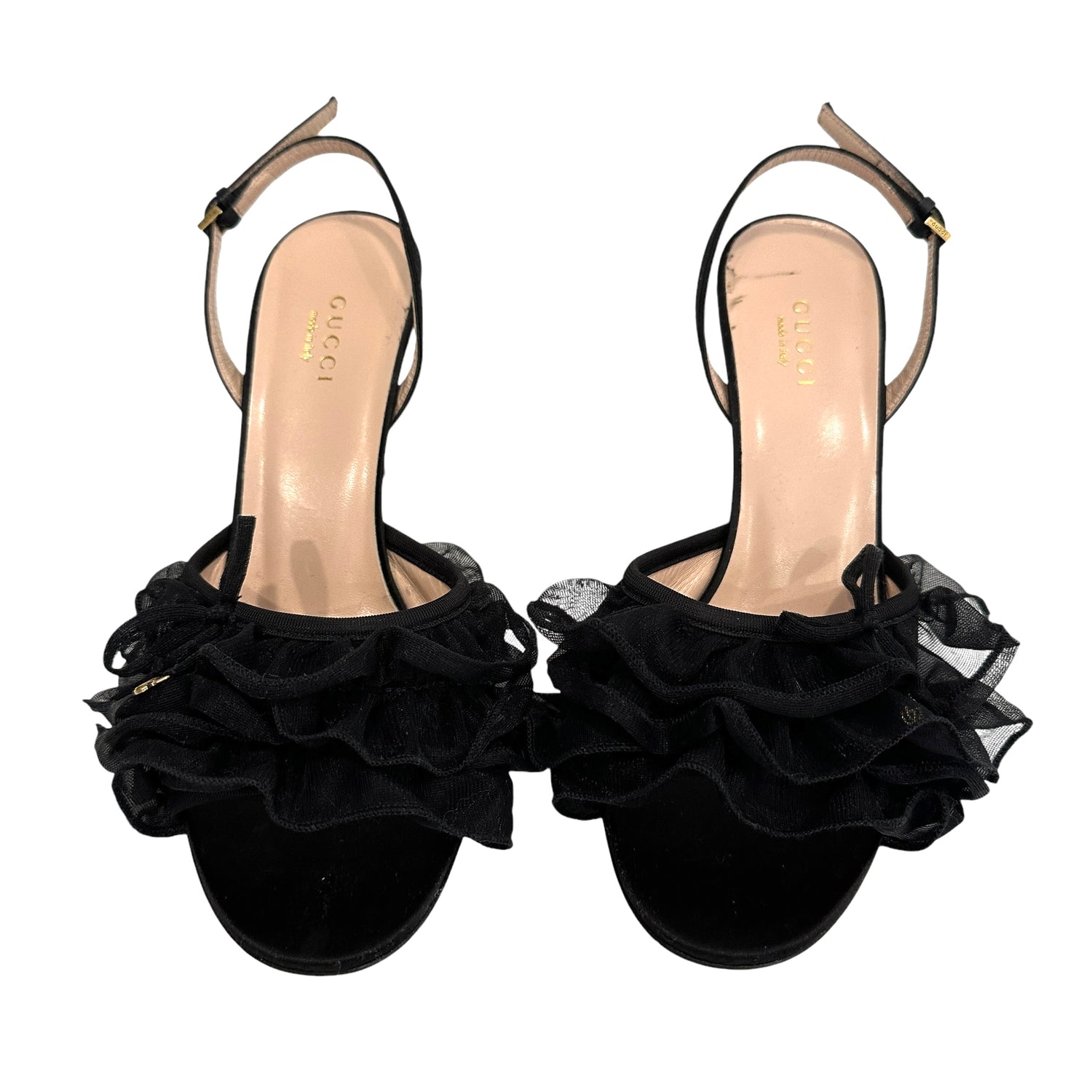 Gucci logo heels. Ruffles at front. GG logo medallion in gold-tone hardware. Designer size 7.