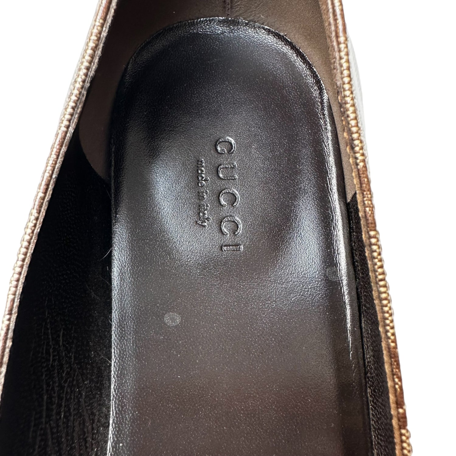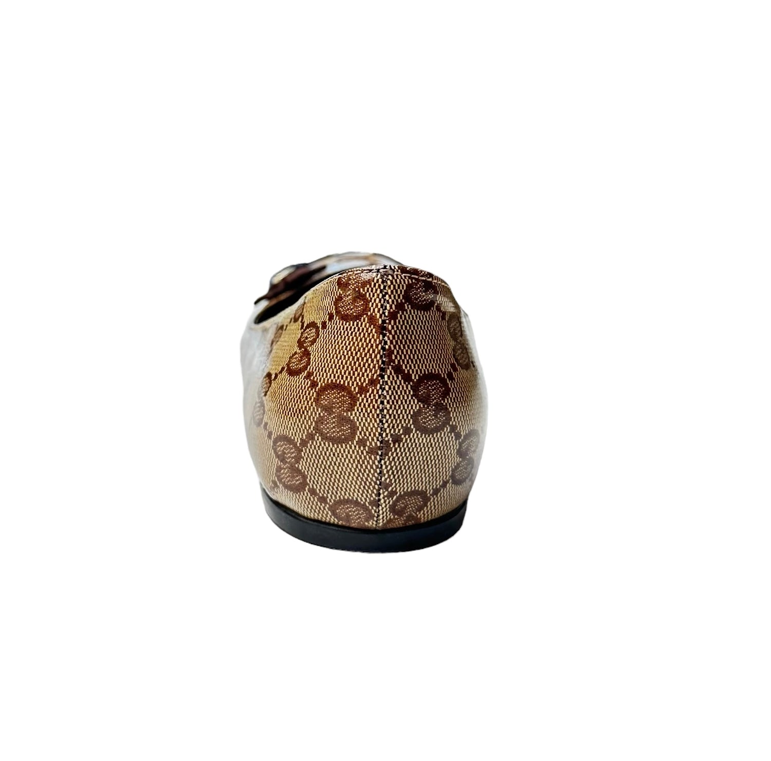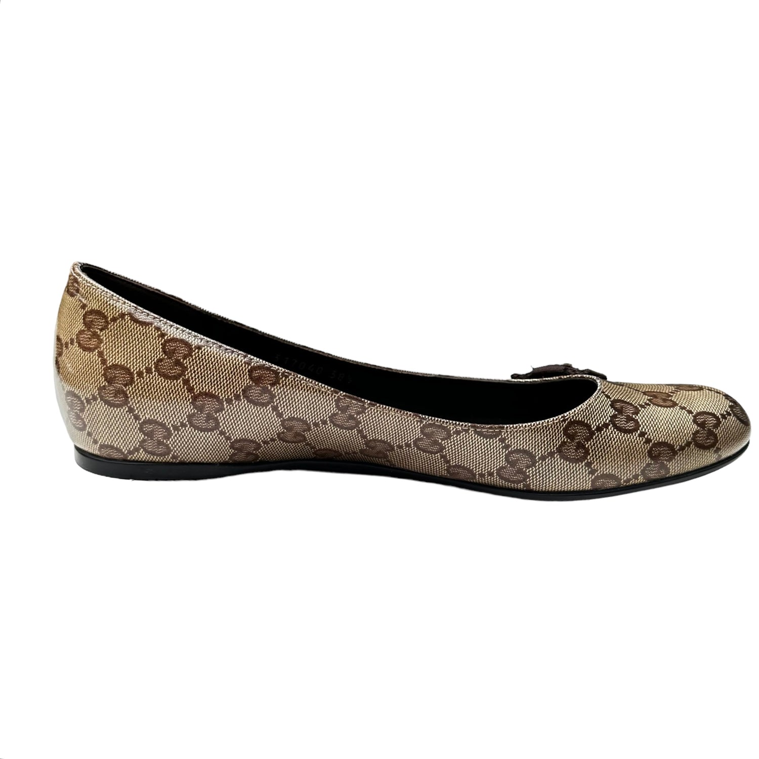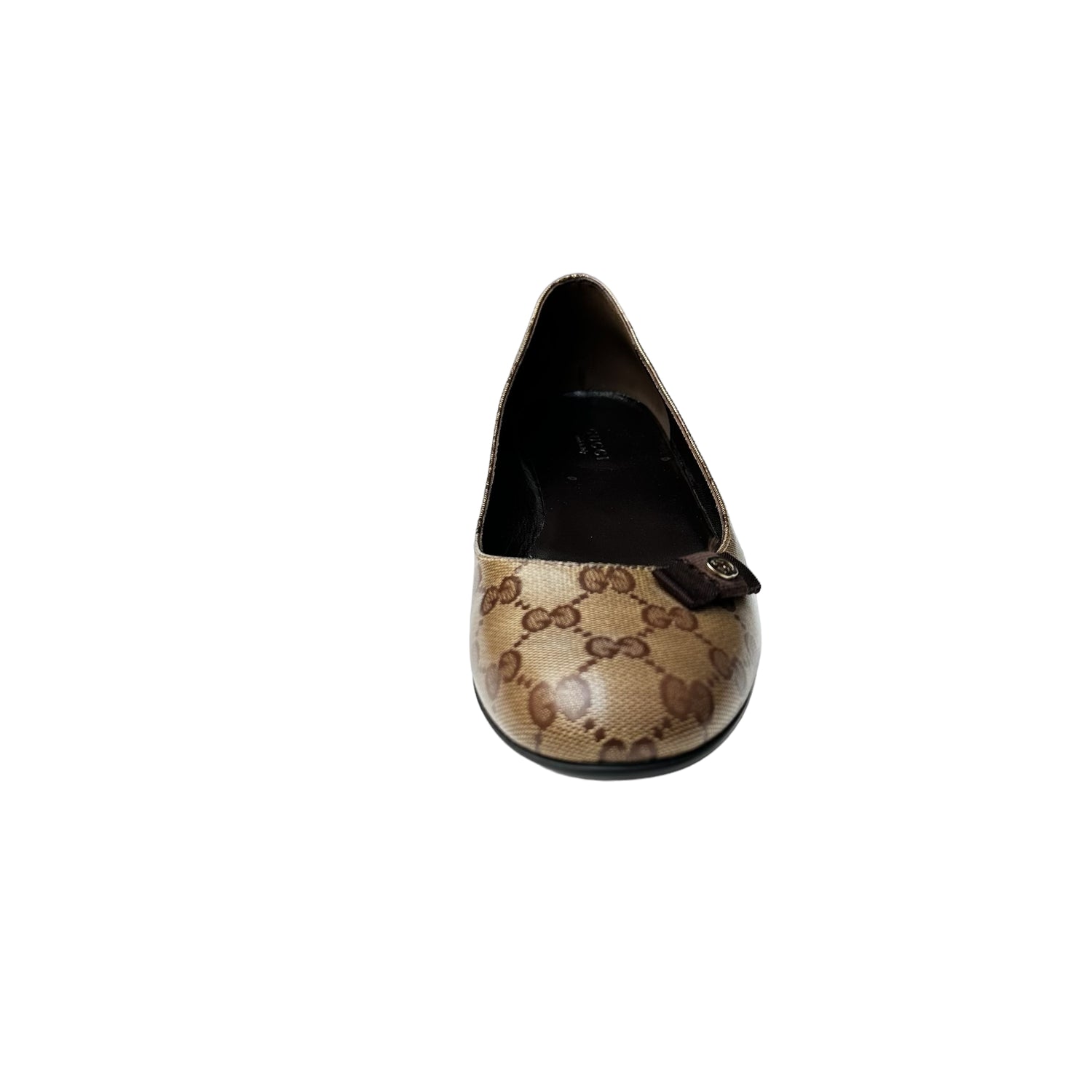 Gucci GG monogram flats. Round toe. Coated canvas and leather. GG brown mini bows on top. Designer size 38.5.