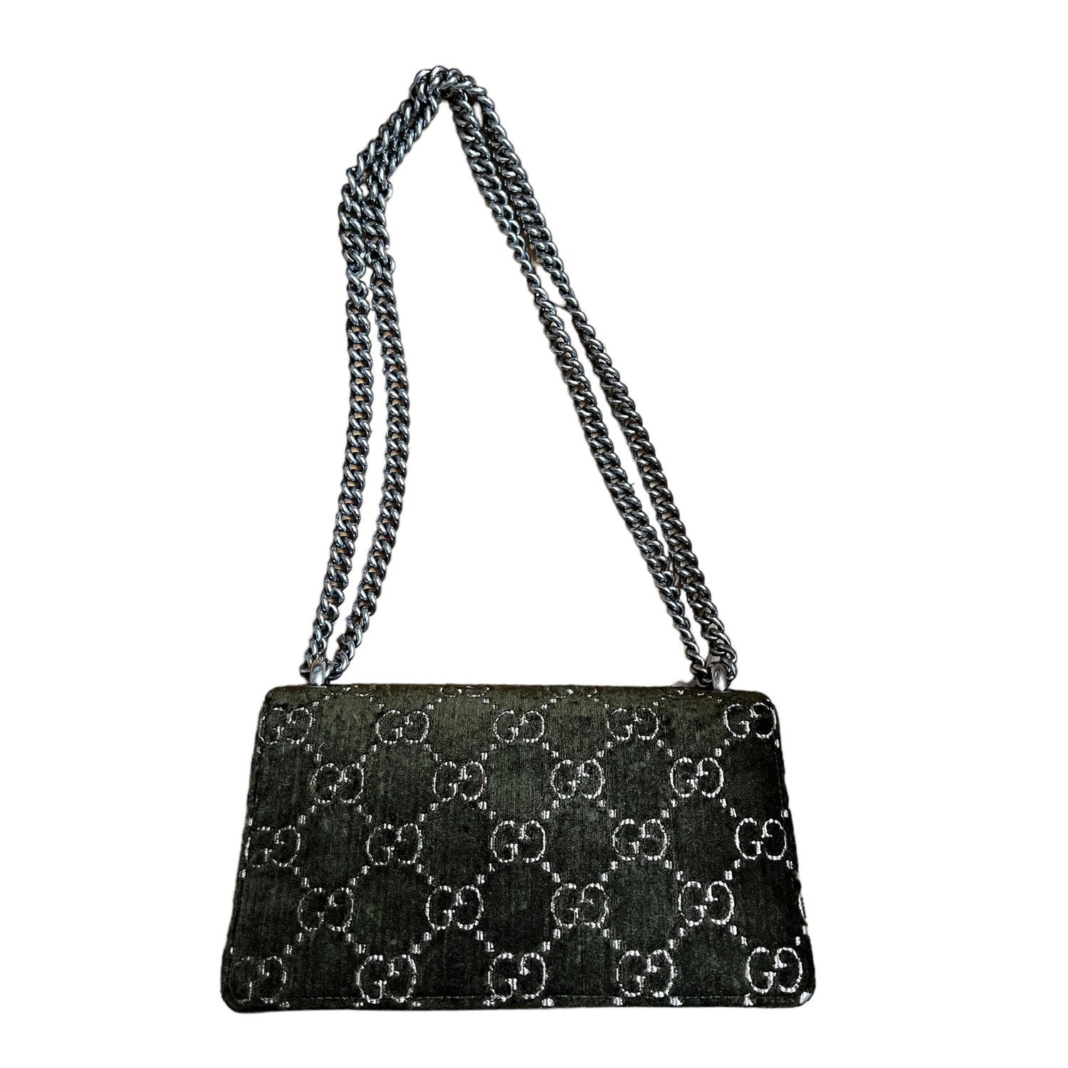 Kaki green velvet and leather Gucci Dionysus bag. Flap bag with double chain. Can be worn as a crossbody or shoulder bag. Silver-tone hardware. Crystal embellishment at clasp.