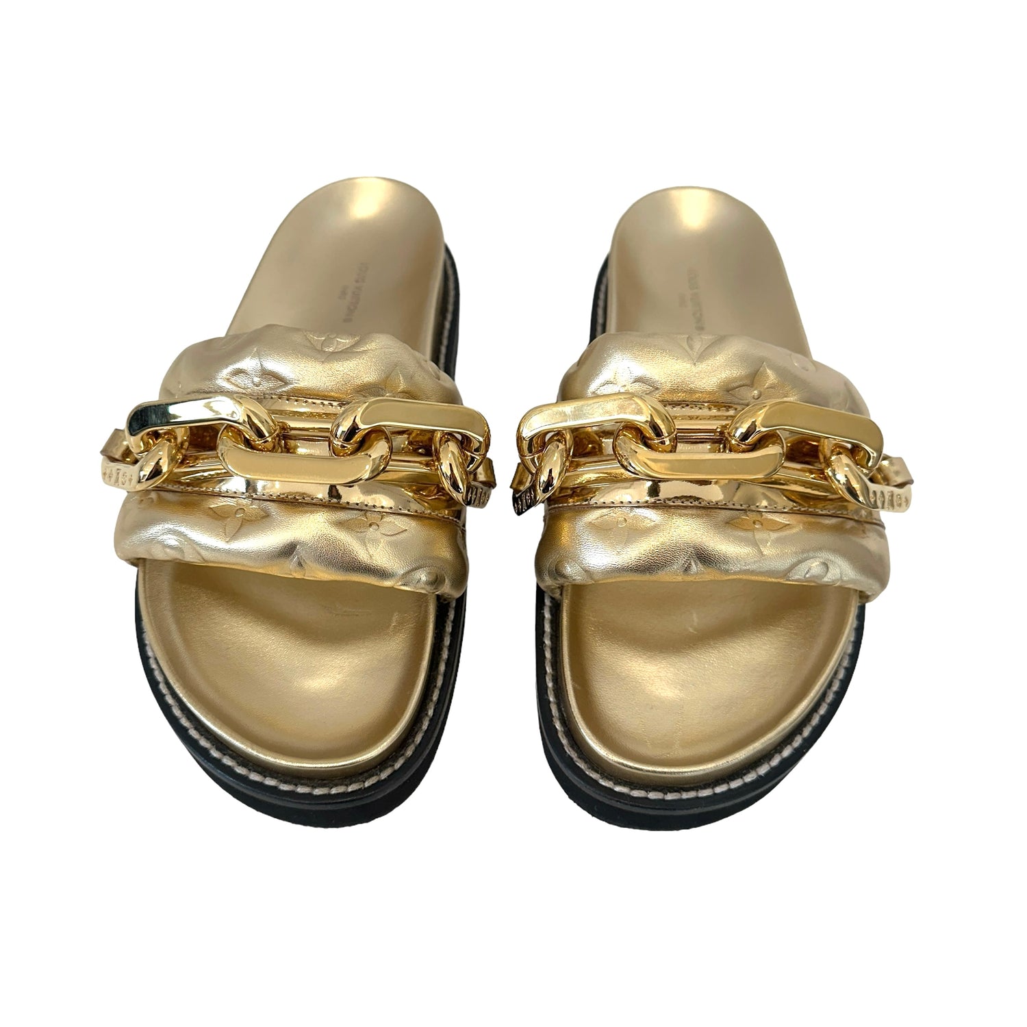 Louis Vuitton gold-tone sandals. Padded gold leather on top with monogram imprints. Chunky gold chain with monogram. Designer size 38.