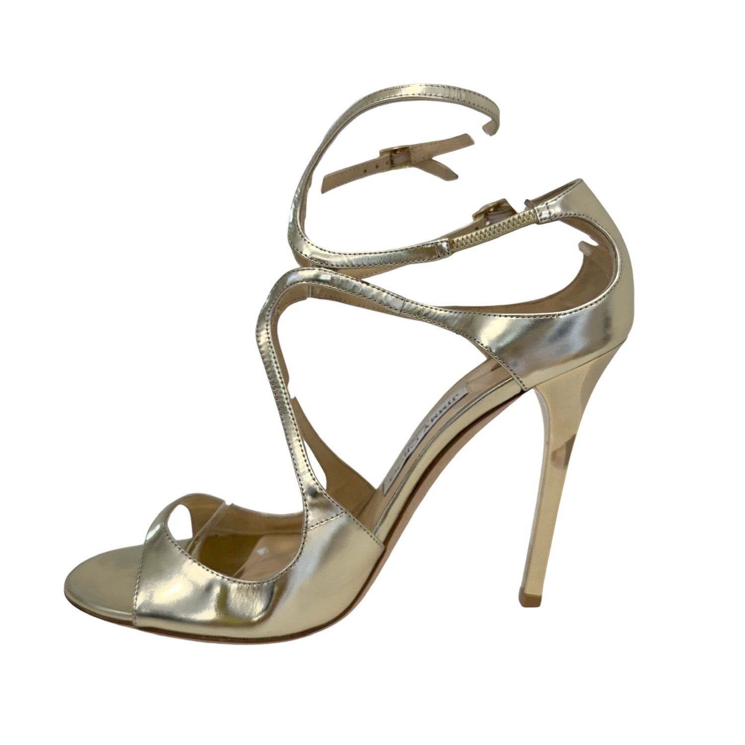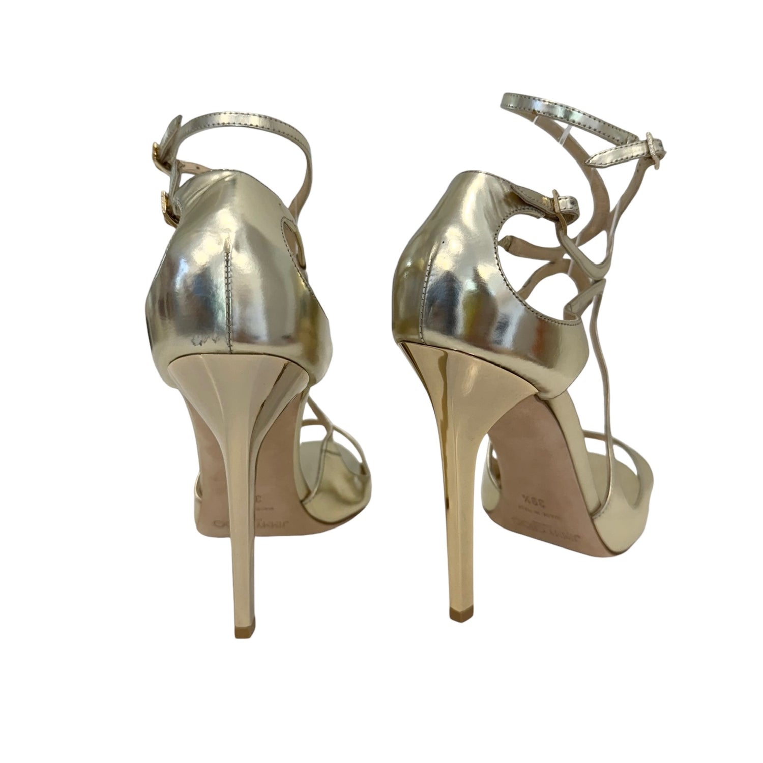 Jimmy Choo iconic heels. Gold leather. Open toe. Designer size 39.5