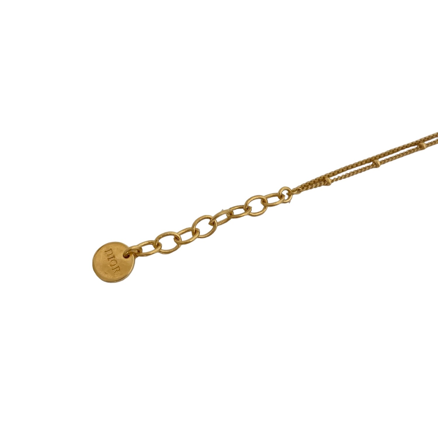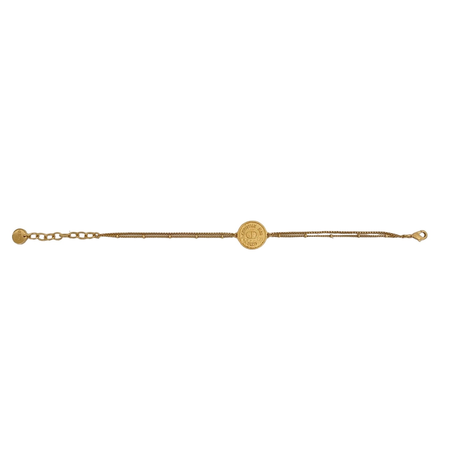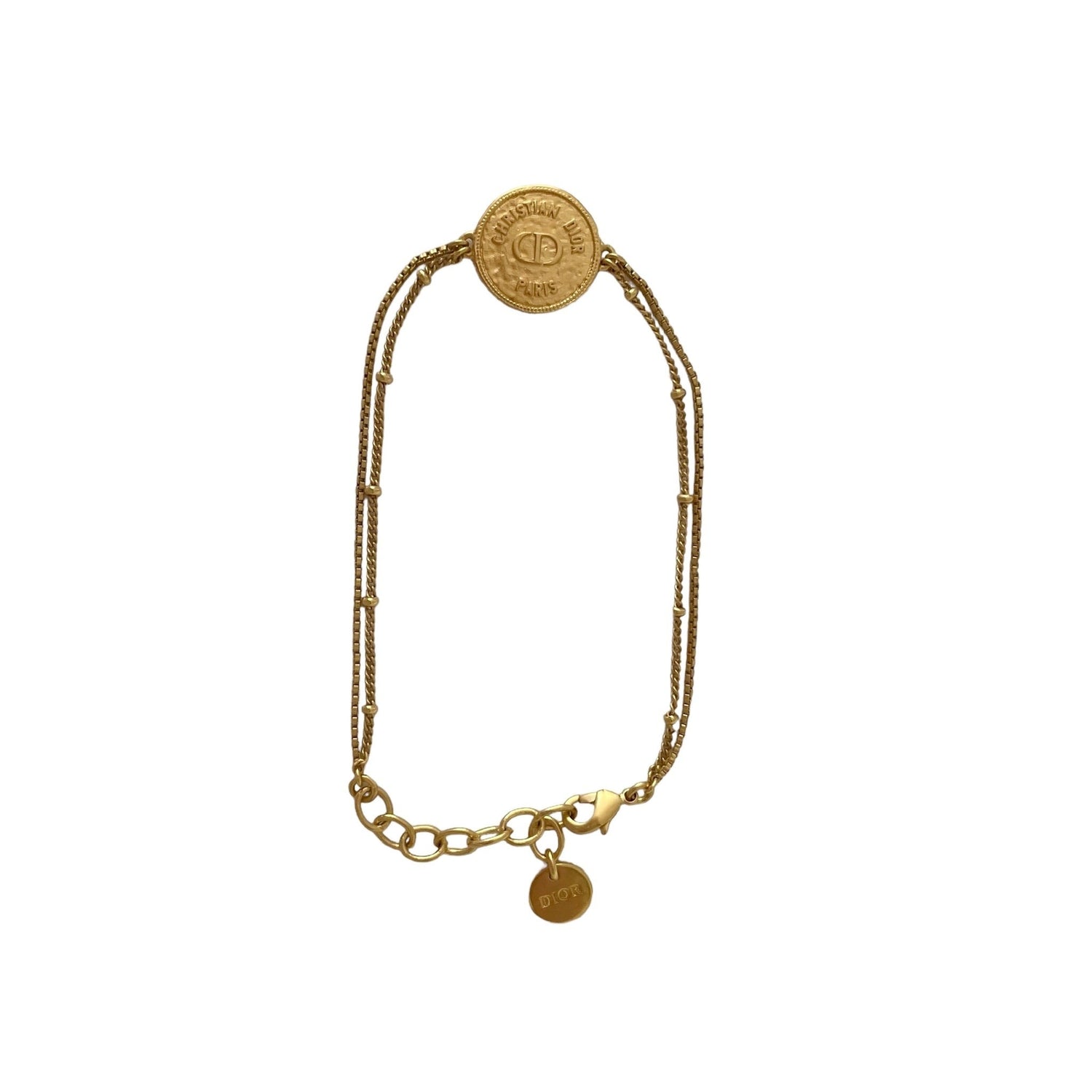 Christian Dior bracelet. Gold-plated metal. Medallion with logo. Hammered design with double chain. Adjustable clasp with logo pendant.