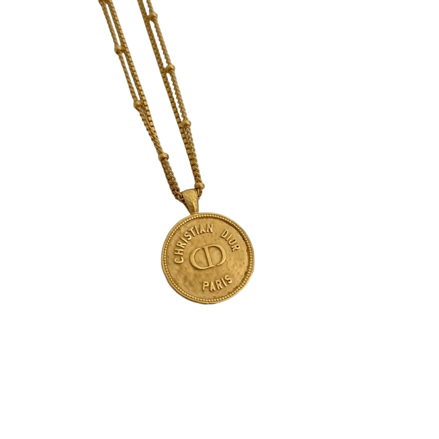 Christian Dior necklace. Gold-plated metal. Medallion with logo. Hammered design with double chain. Adjustable clasp with logo pendant.