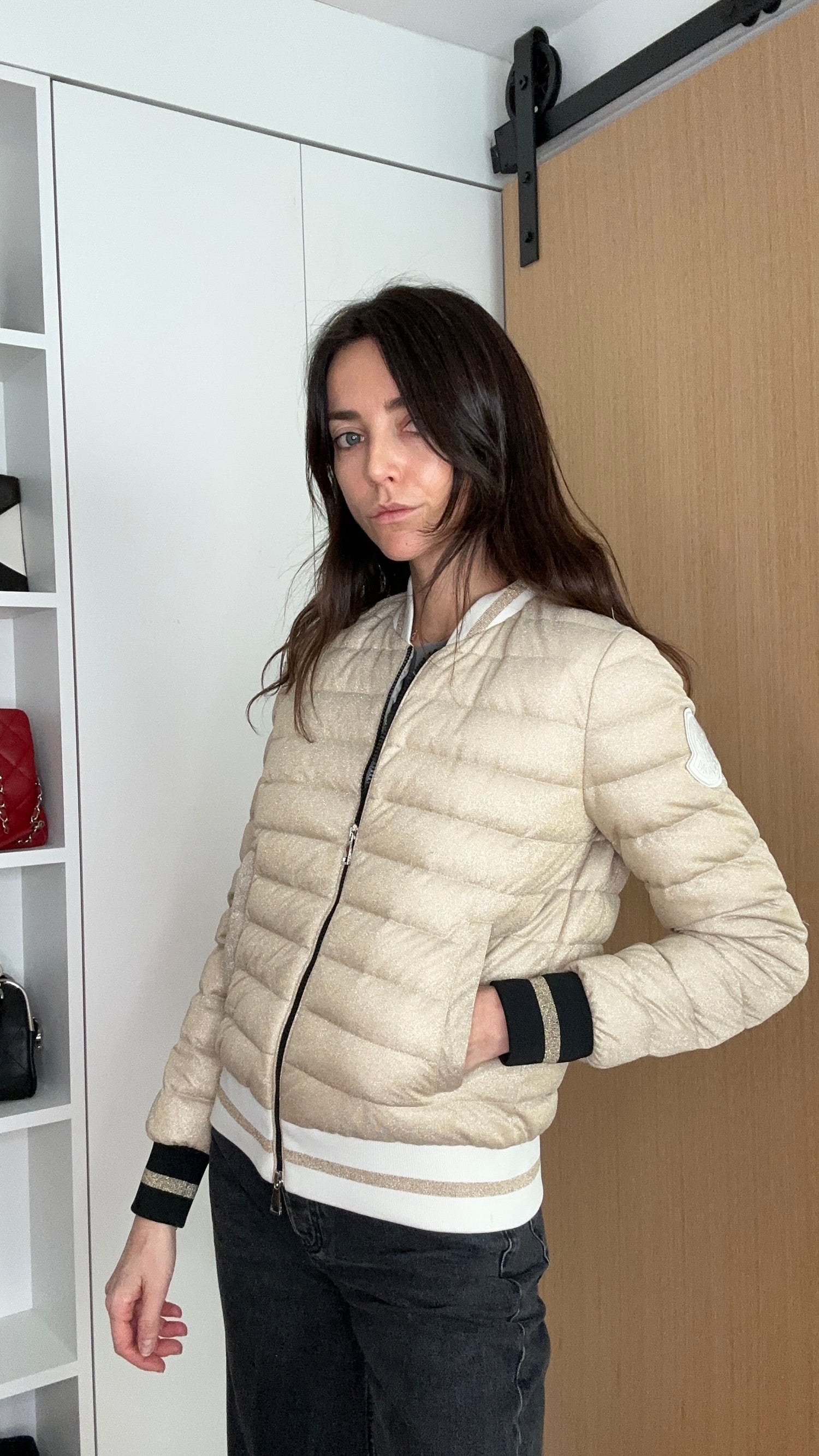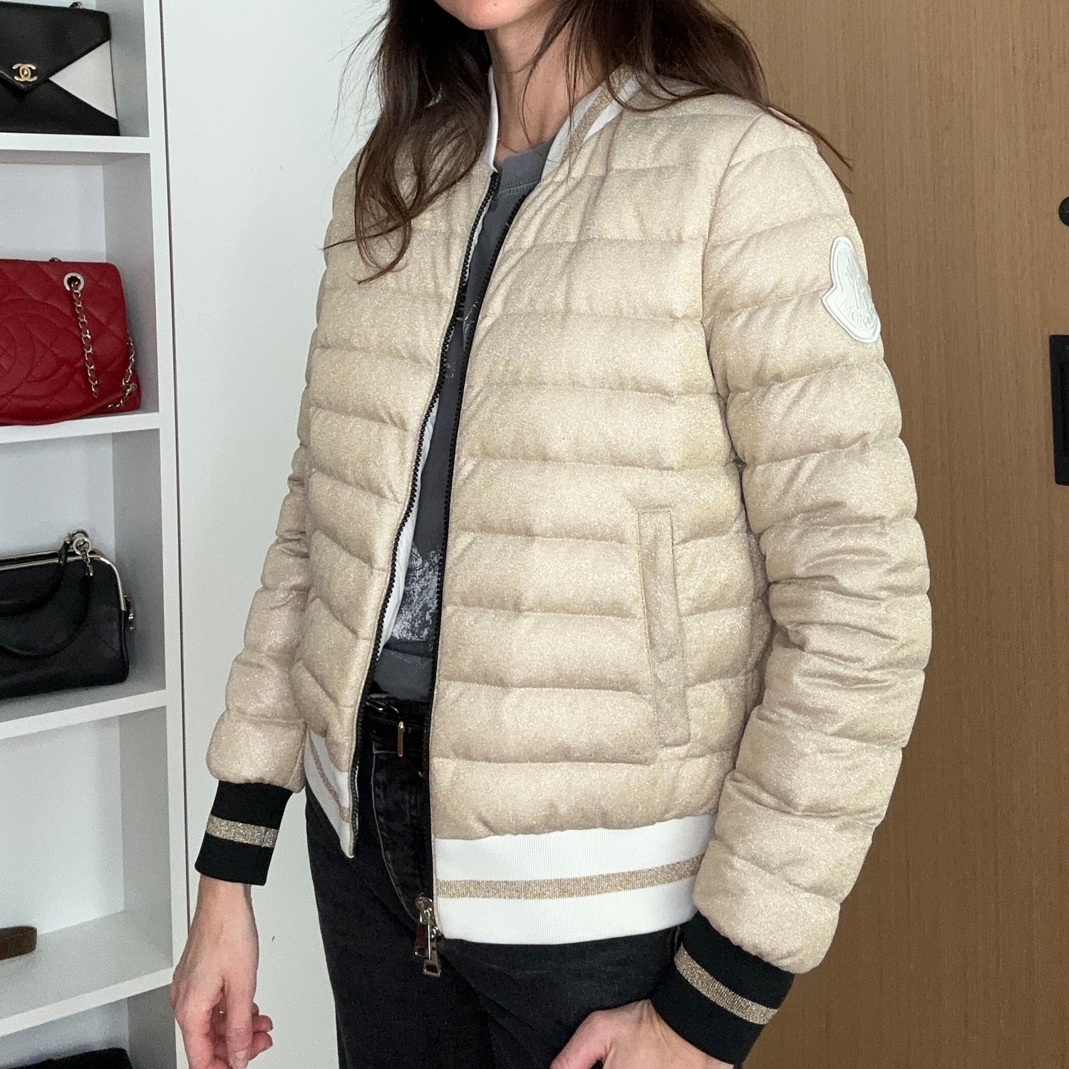 Moncler gold puffer jacket. Mid-weight bomber jacket perfect for mid season and everyday wear. Zipper closure at front in silver hardware. Large logo at sleeve. Button closure pockets. Designer size 0.