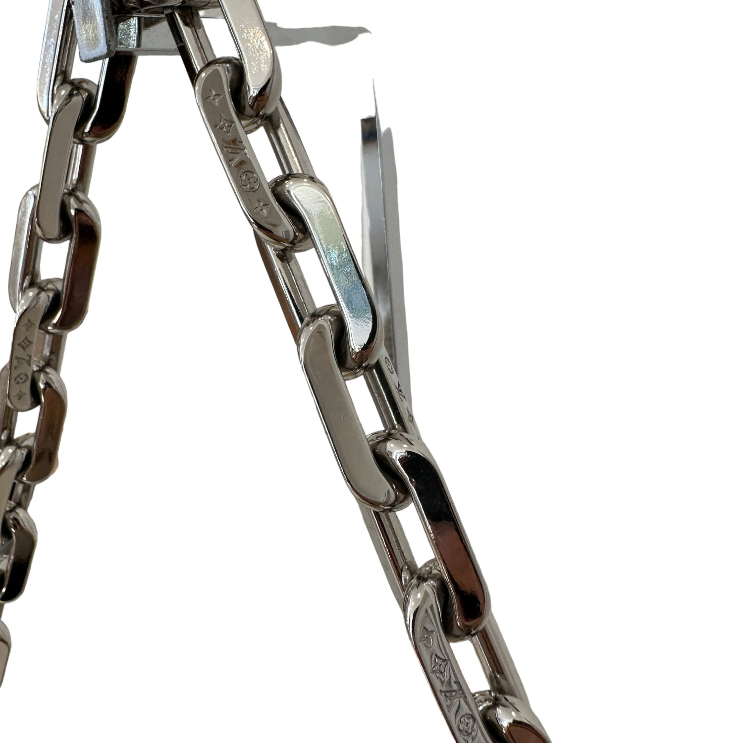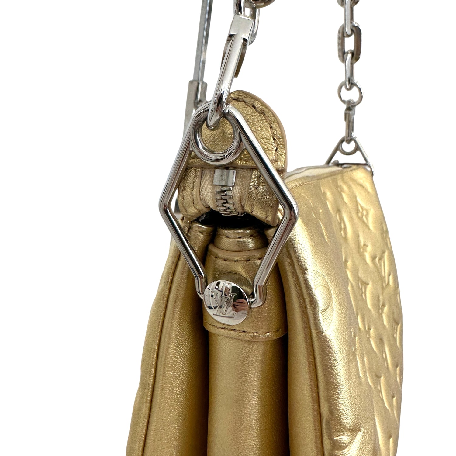 Louis Vuitton gold coussin bag. Monogram throughout on padded leather. Silver-tone hardware. Chain shoulder strap with monogram engraved links. Zipper closure. Grey microfiber lining. Two interior compartment with on interior zipper pocket.