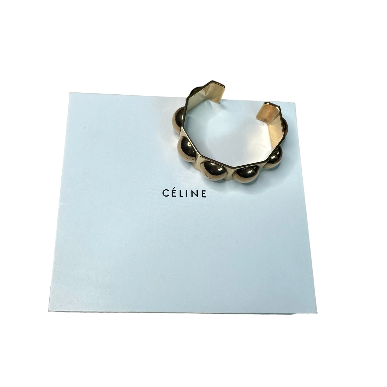 Celine 24K gold plated and brass cuff. Open bracelet. 24K plated brass. Inside marks: Serial Number, Size, Made in Italy. Designer size C2.