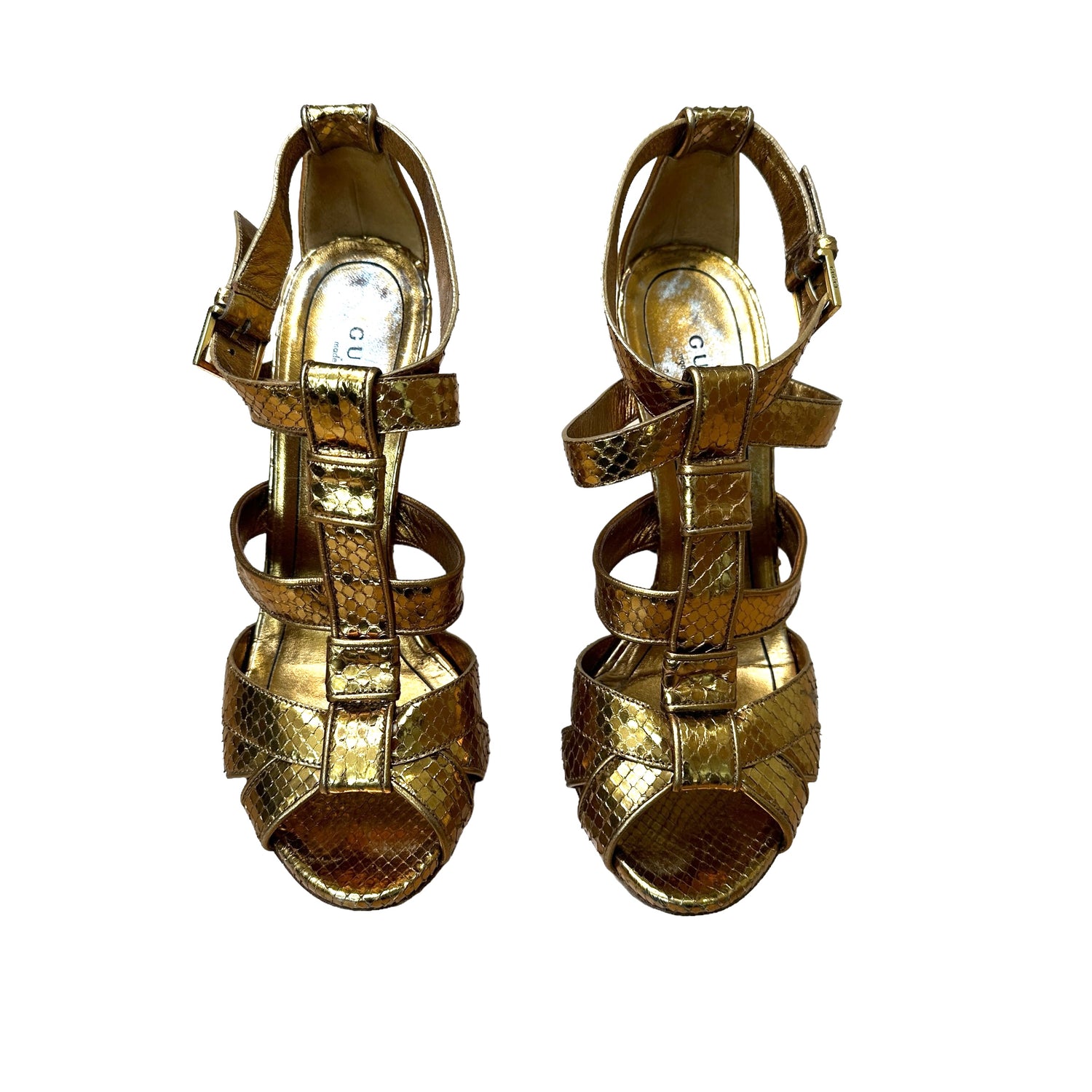 Gucci gold python high heels. Round toe. Buckle at ankle strap. Small platform for more support and comfort. Designer size 37.