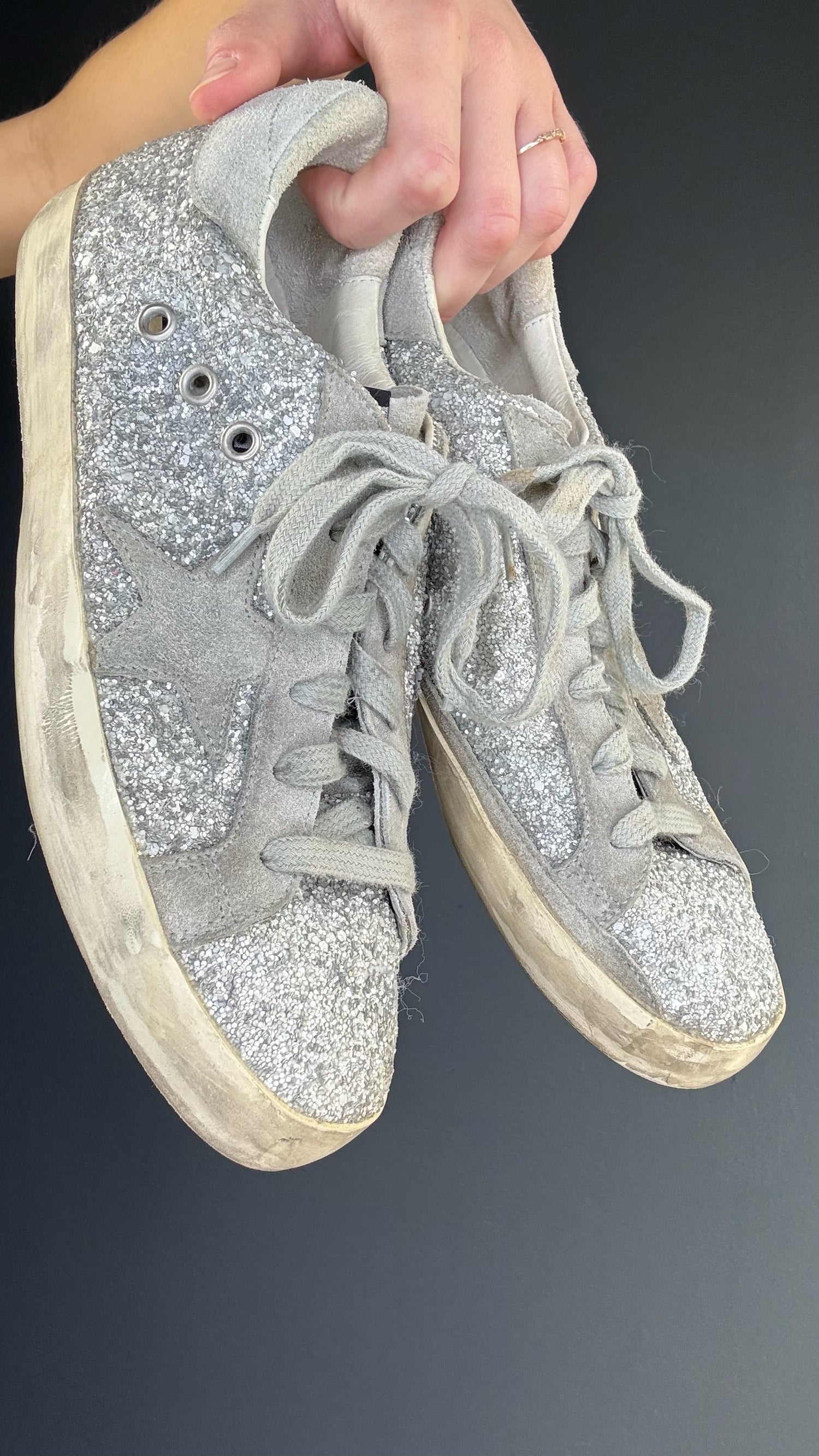 Golden Goose silver glitter sneakers. Meant to look distressed. Designer size 38