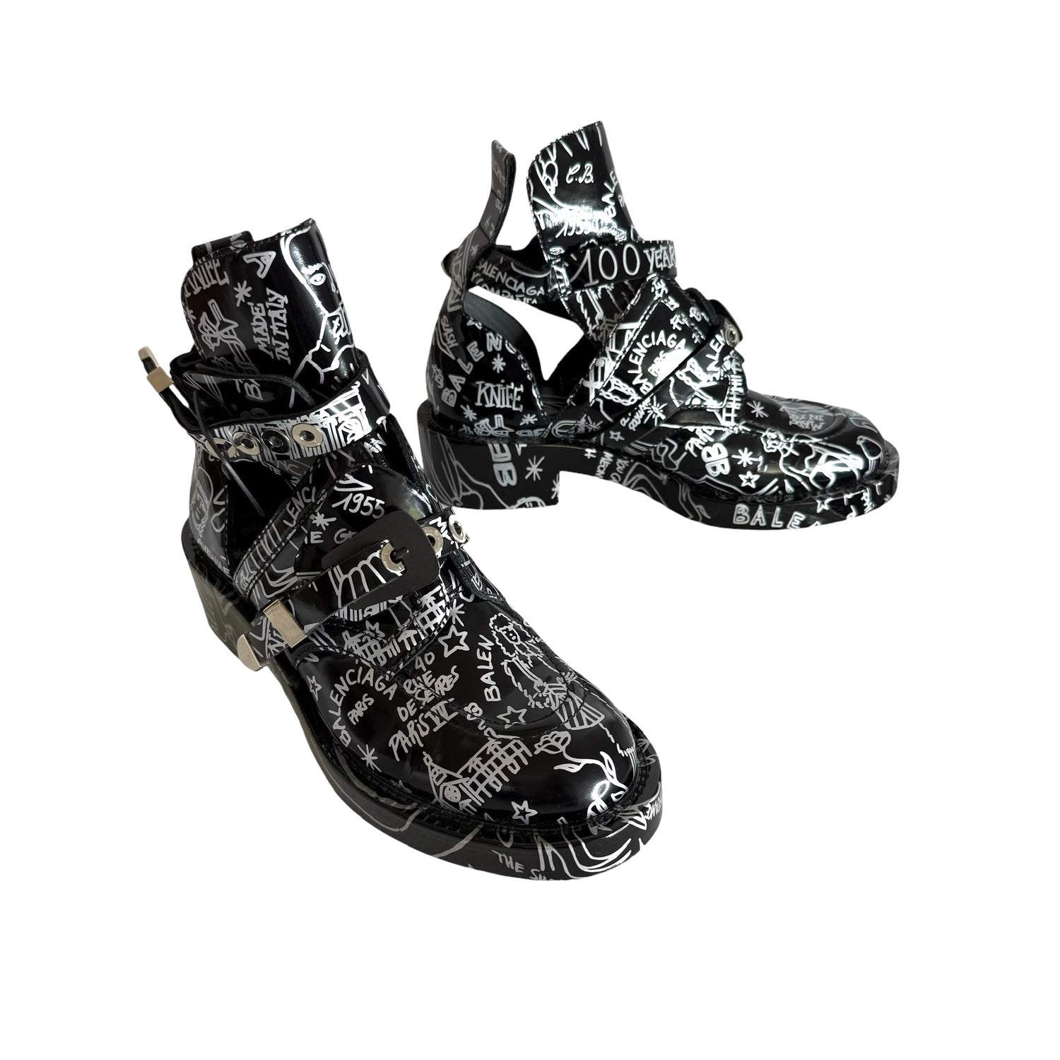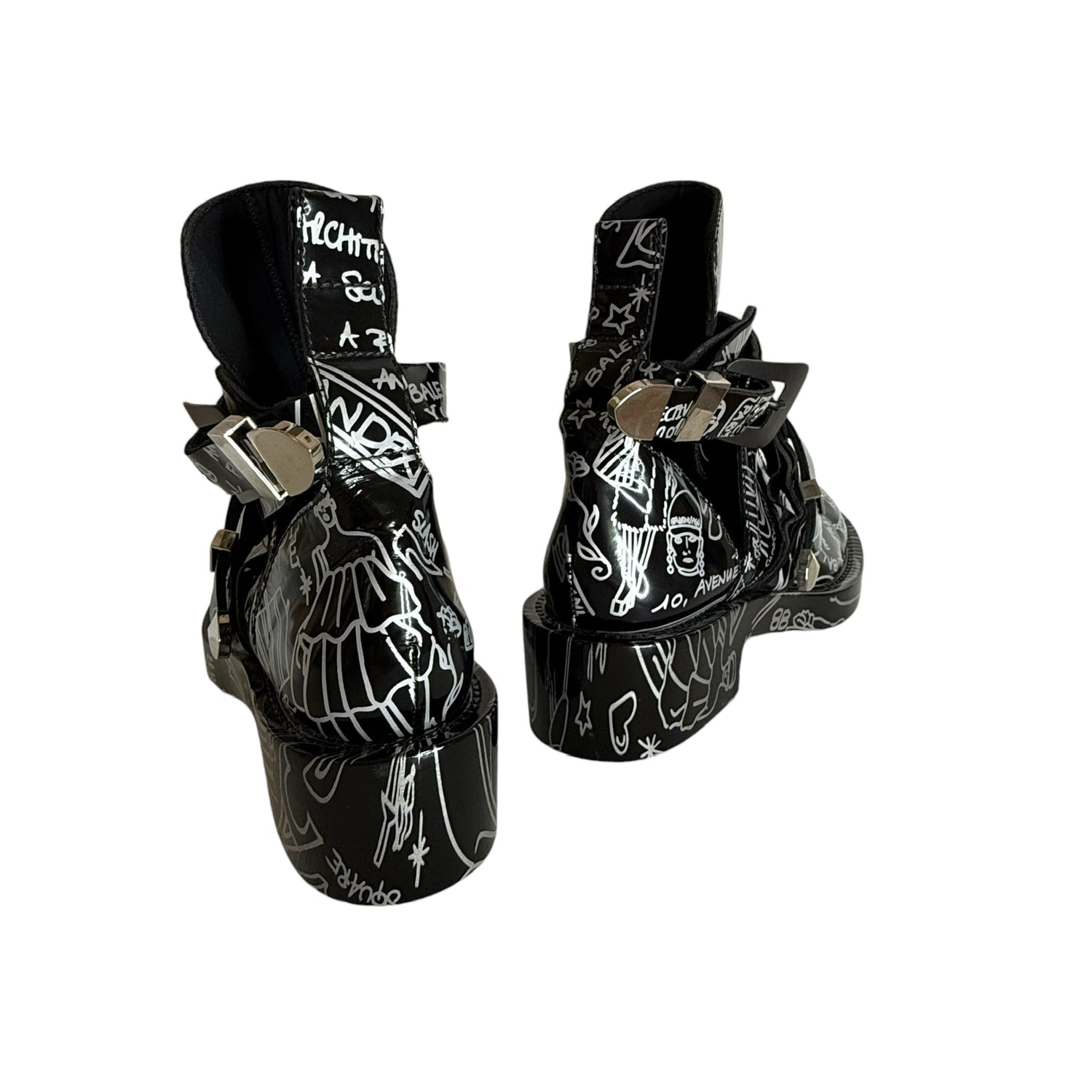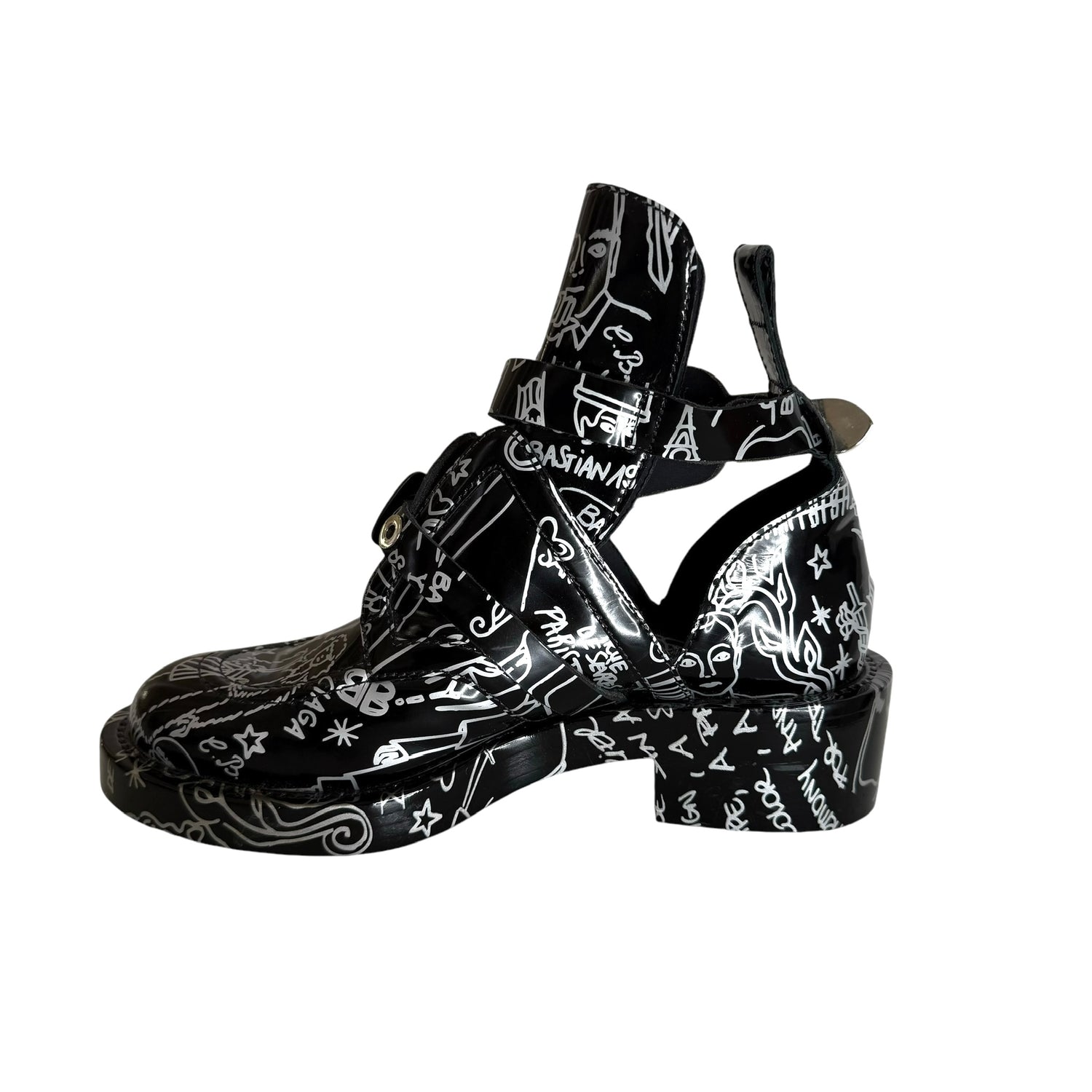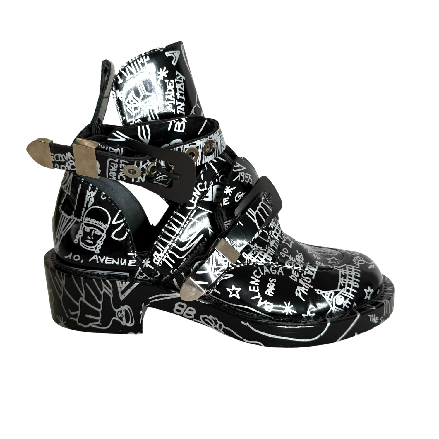 Balenciaga by Nicolas Ghesquieres boots. Black leather with graffiti print throughout. Gunmetal and silver buckles. Open sides. Round toe. Designer size 38.5
