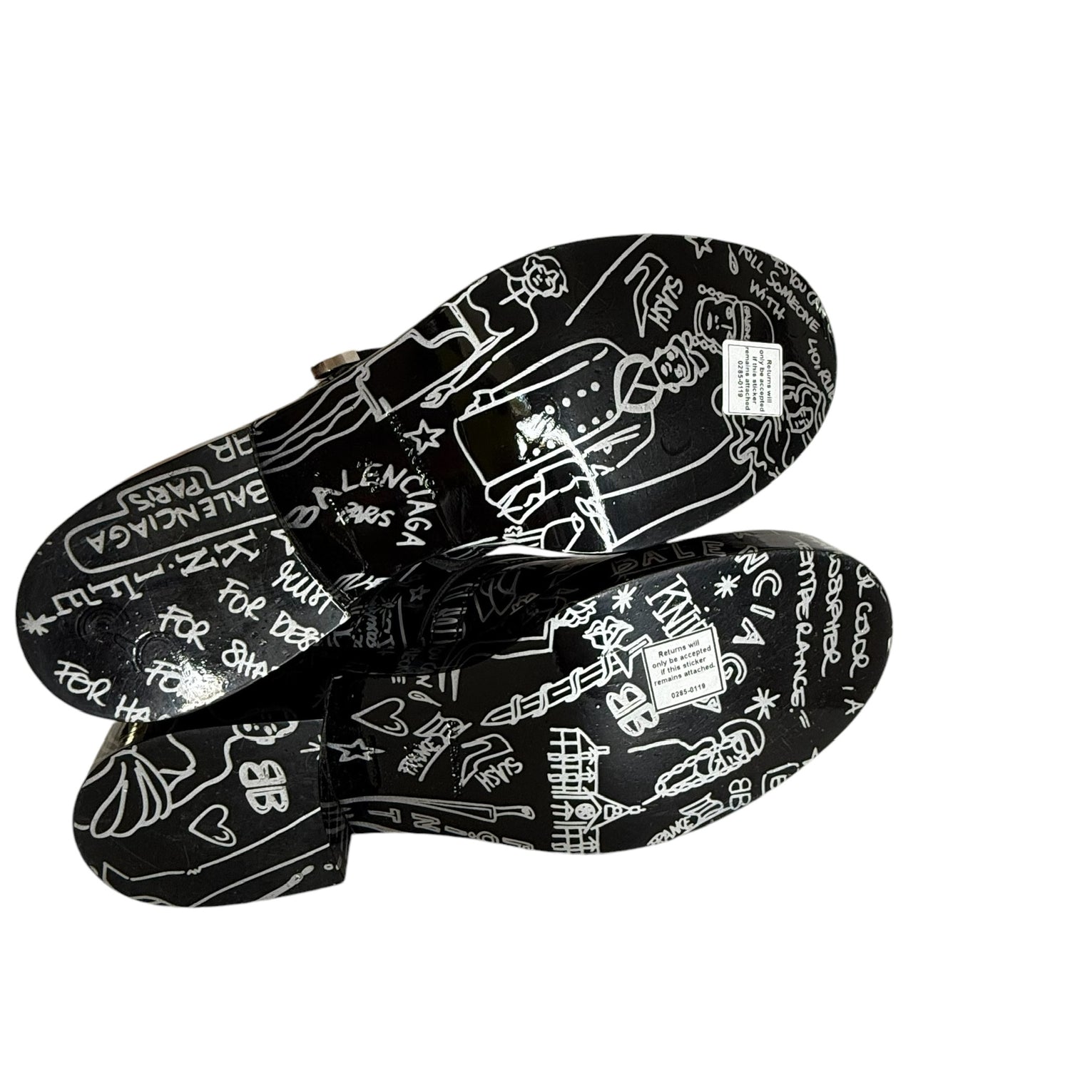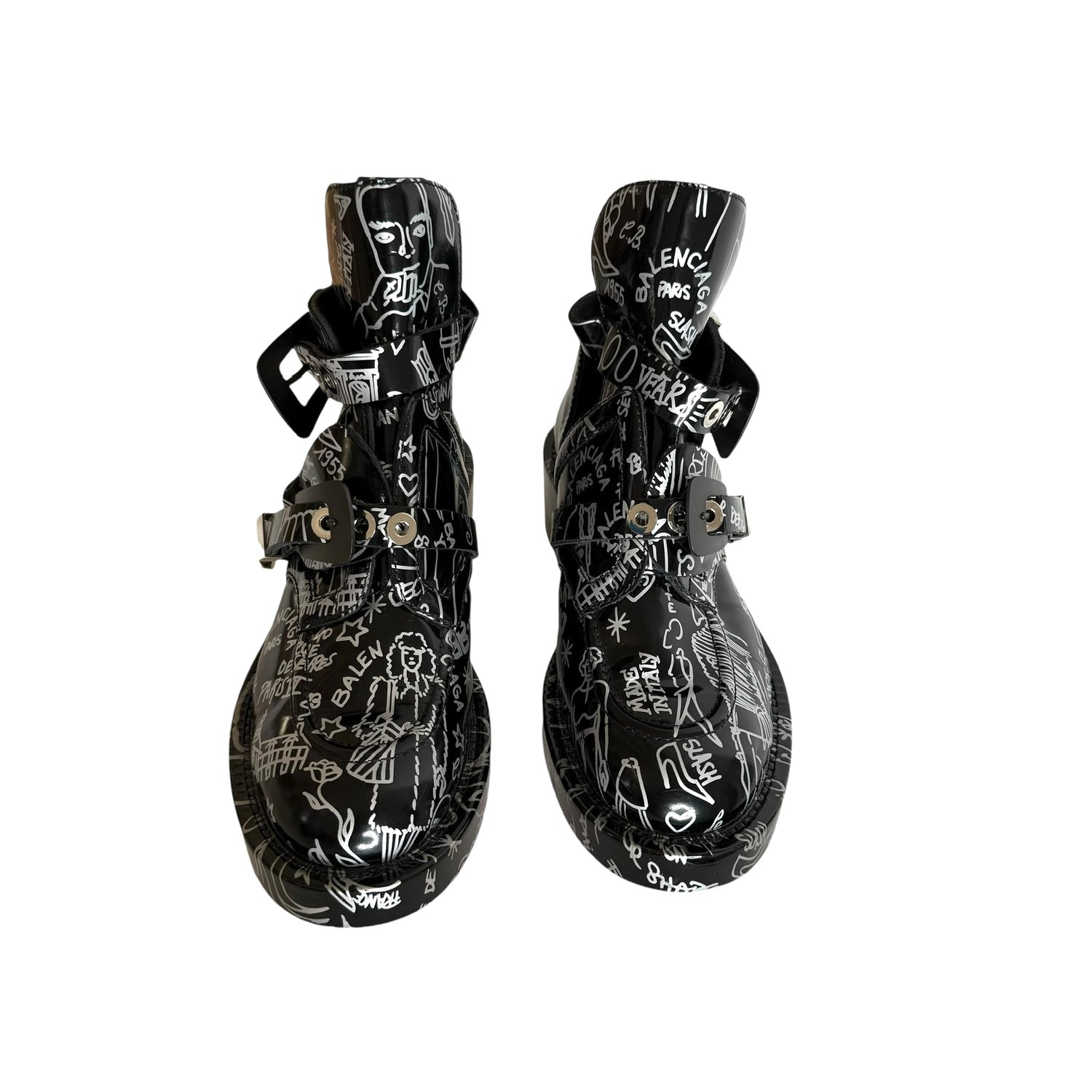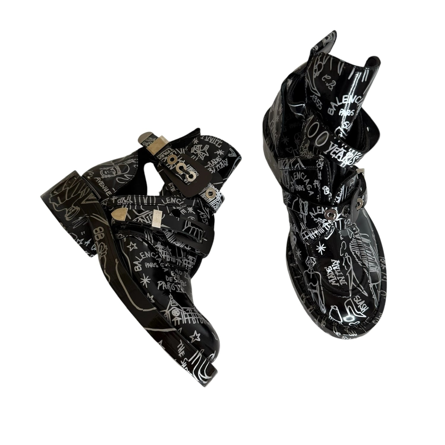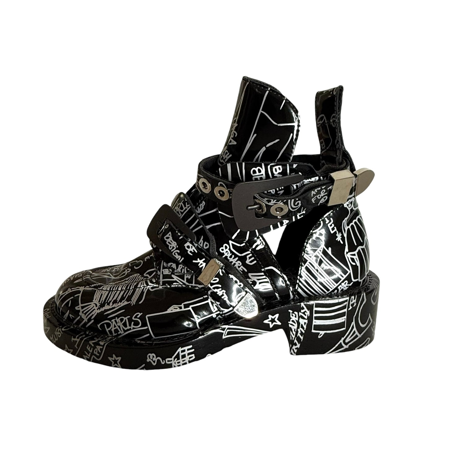 Balenciaga by Nicolas Ghesquieres boots. Black leather with graffiti print throughout. Gunmetal and silver buckles. Open sides. Round toe. Designer size 38.5