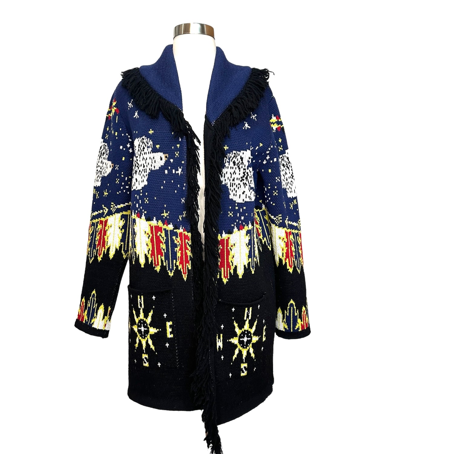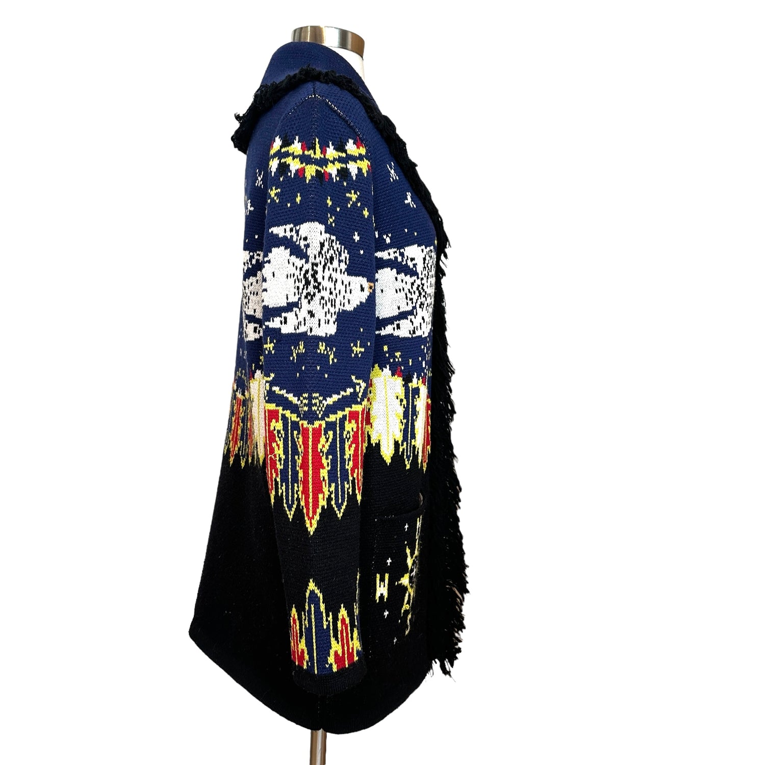 Hayley Menzies blue cardigan jacket. Fringe details. Open front. Patch pockets. Designer size small.