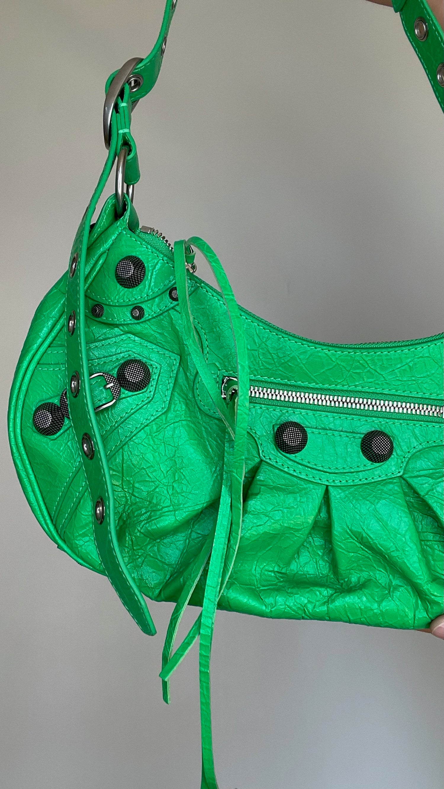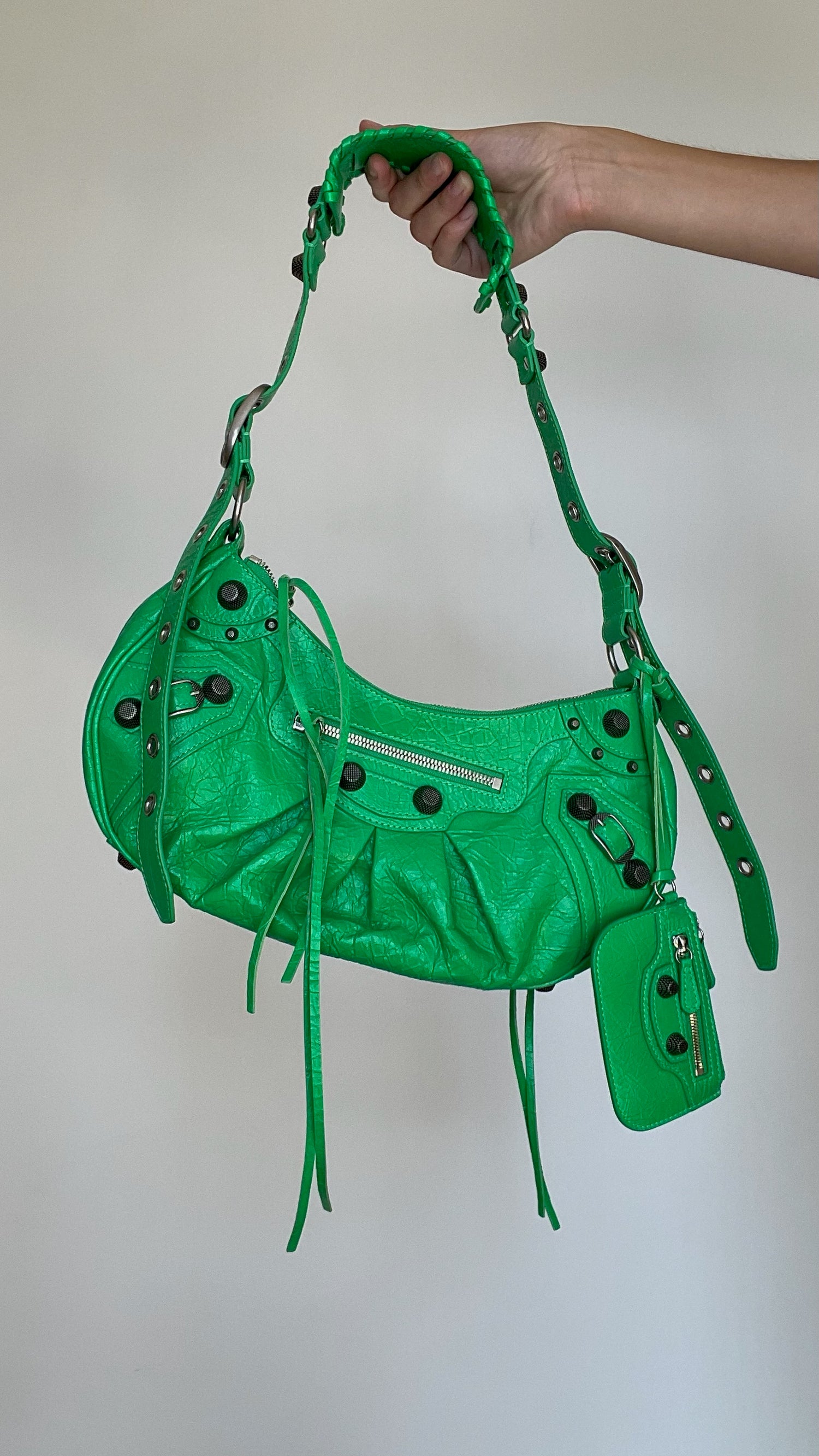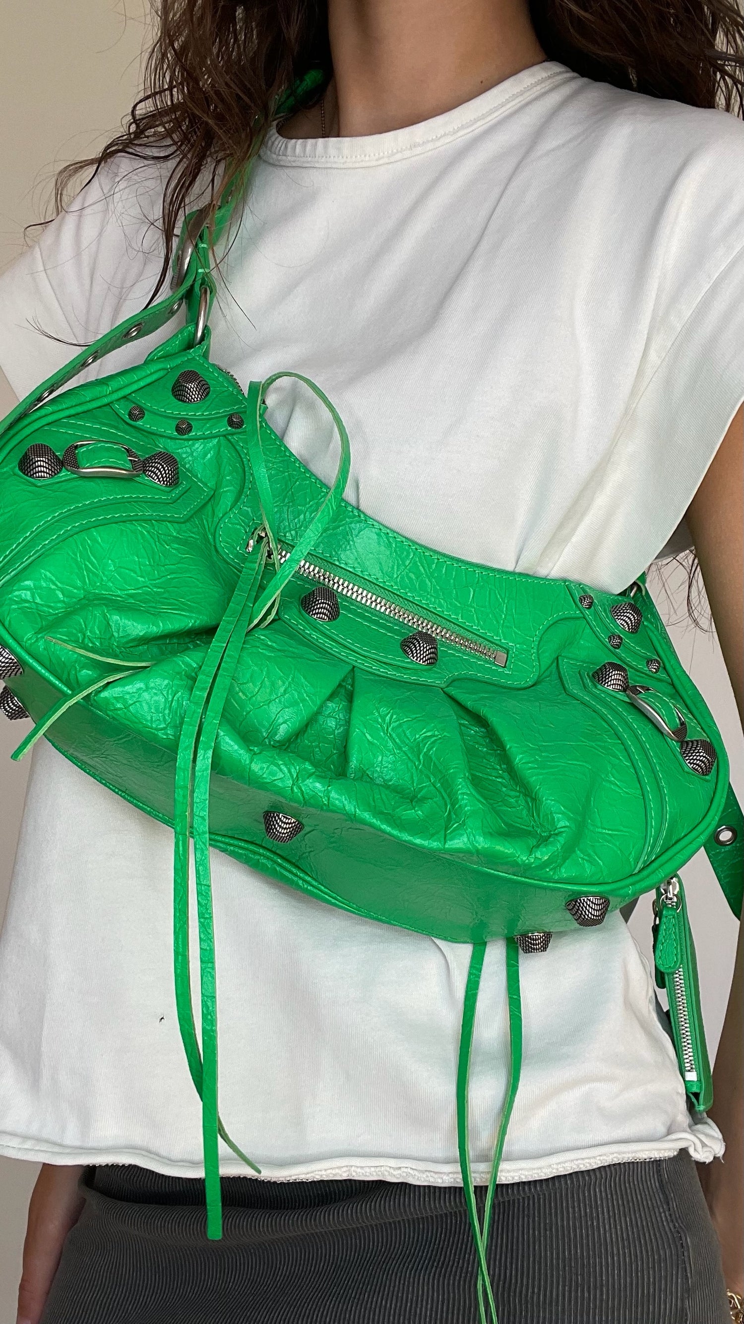 Balenciaga green Cagole bag. Arena lambskin. Can be a shoulder bag as well as a crossbody with the adjustable strap. Leather braided shoulder pad. One heart mirror. One detachable pouch. One exterior zip pocket. One interior zip pocket. Aged-silver hardware. Black canvas lining.