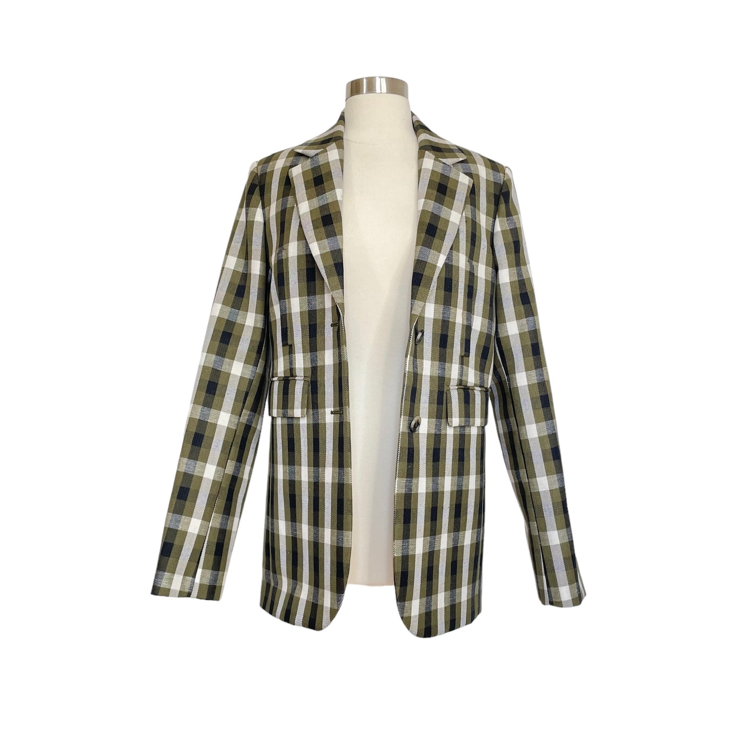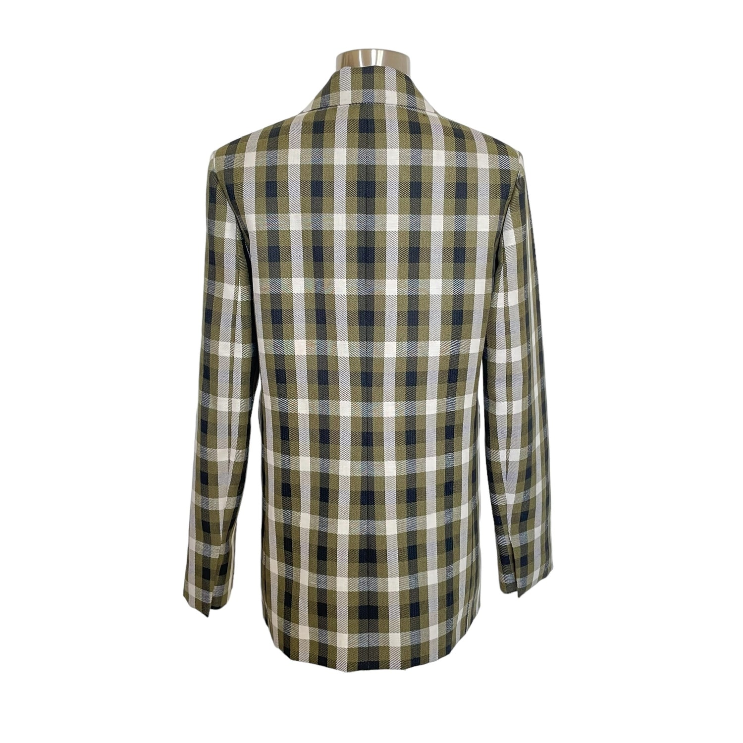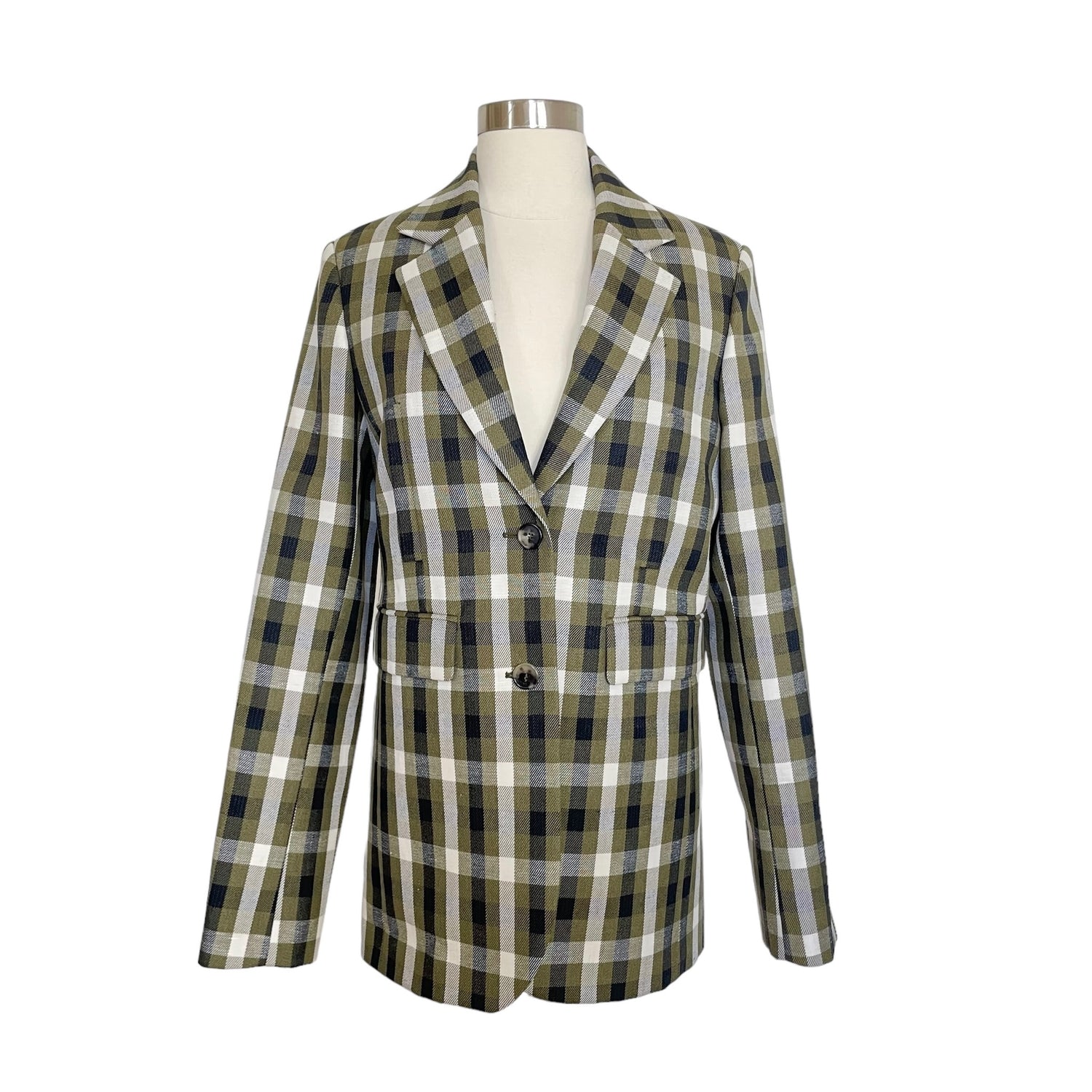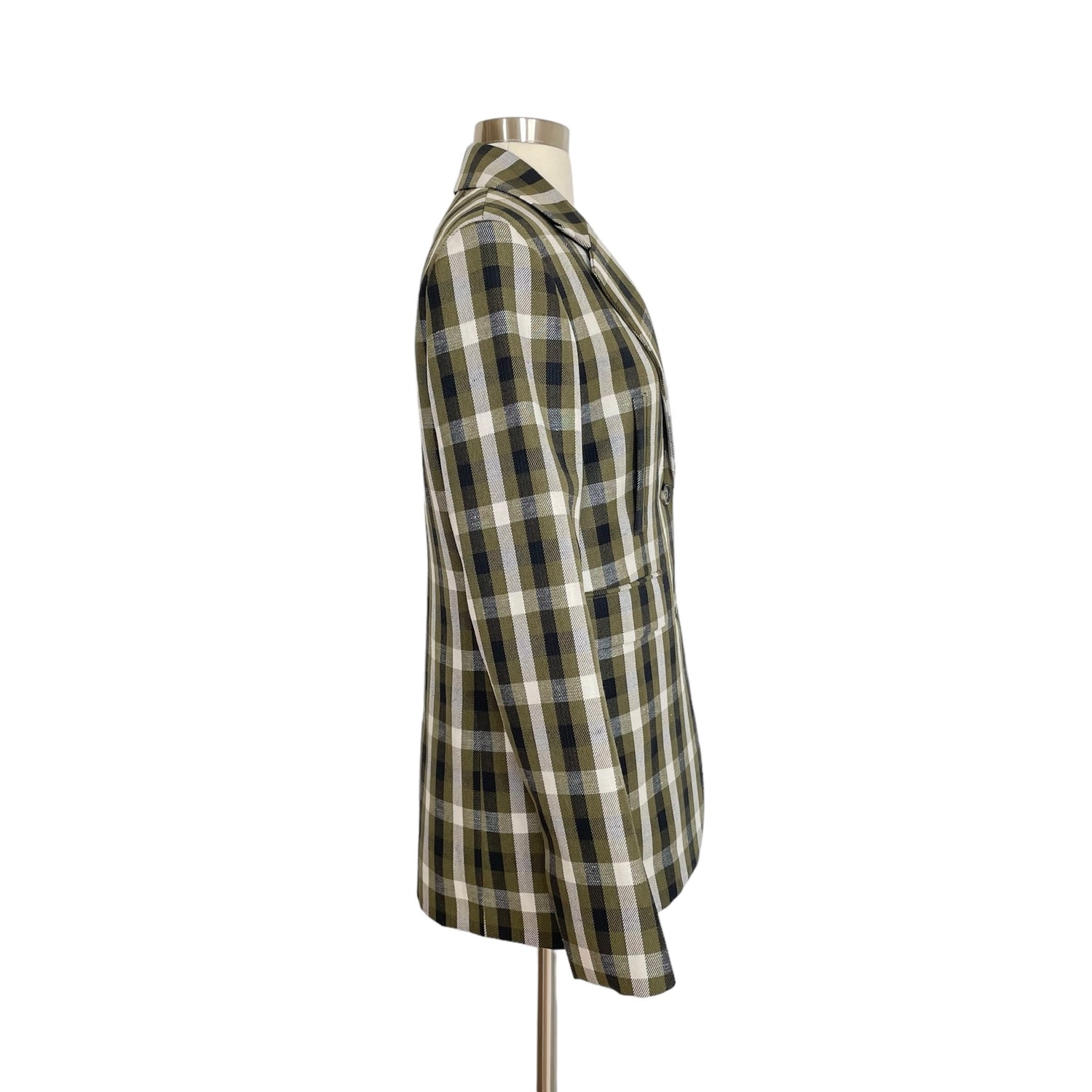 Loewe plaid blazer. Pointed collar. Button closure. Beautiful colorway in kaki, cream and black. Designer size 36.