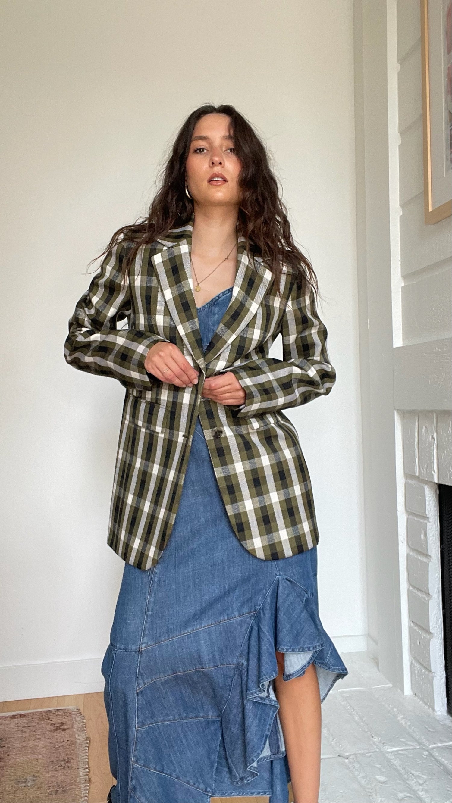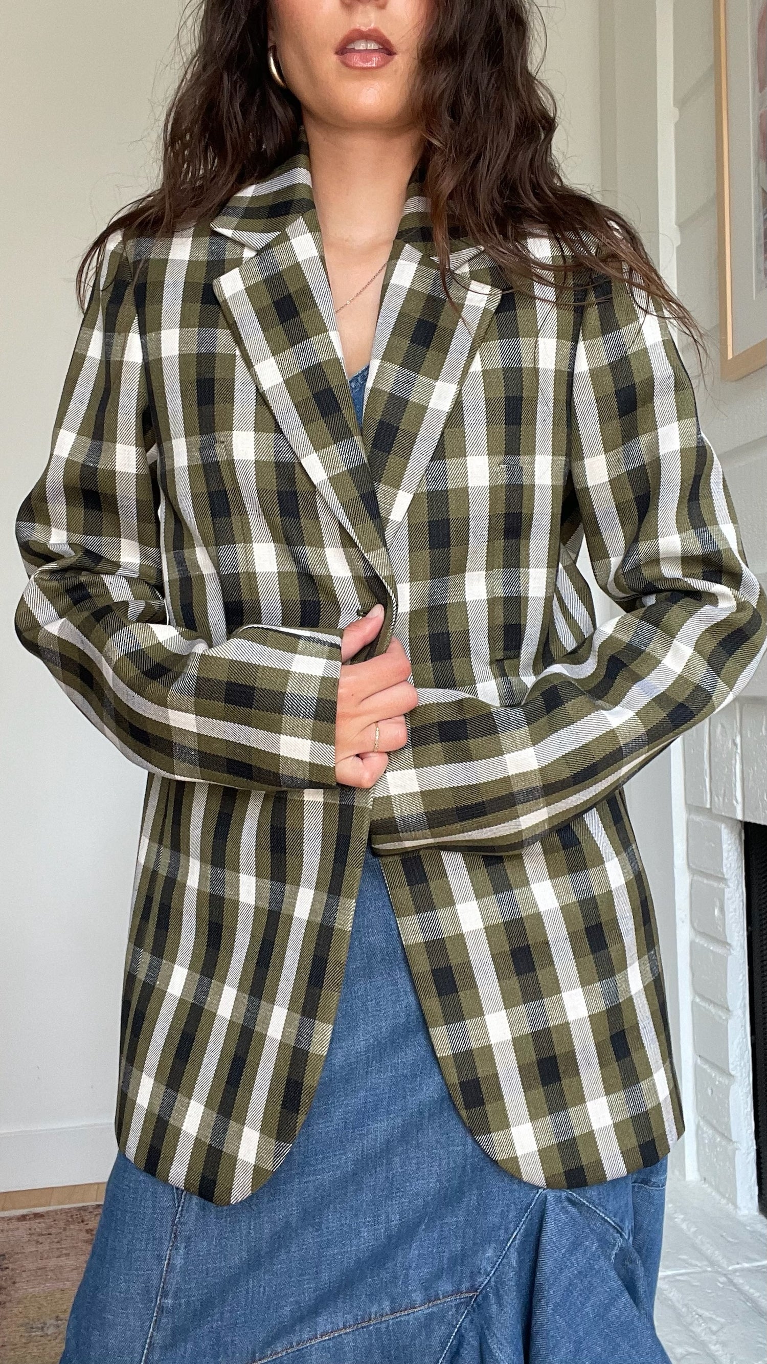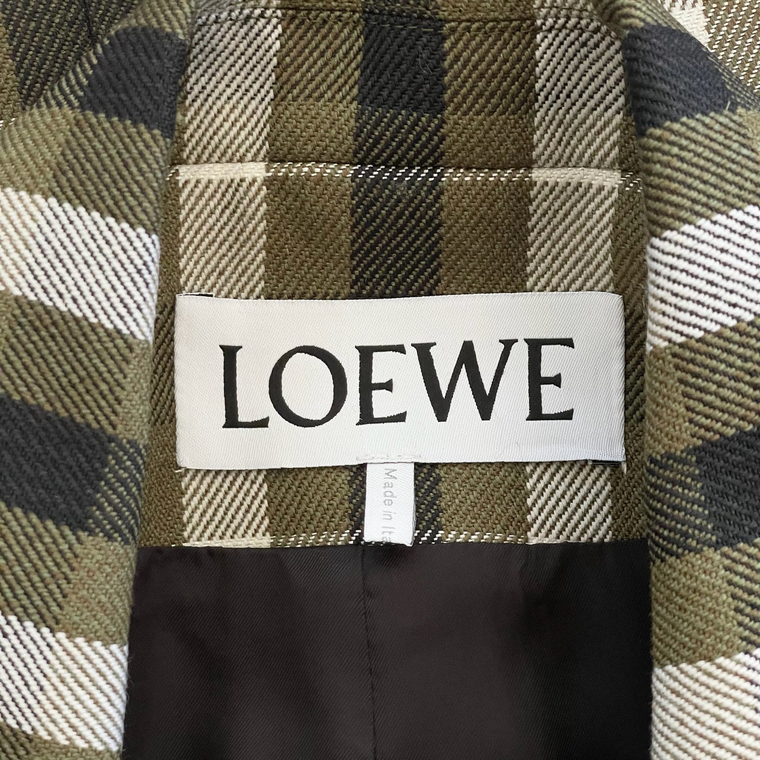 Loewe plaid blazer. Pointed collar. Button closure. Beautiful colorway in kaki, cream and black. Designer size 36.