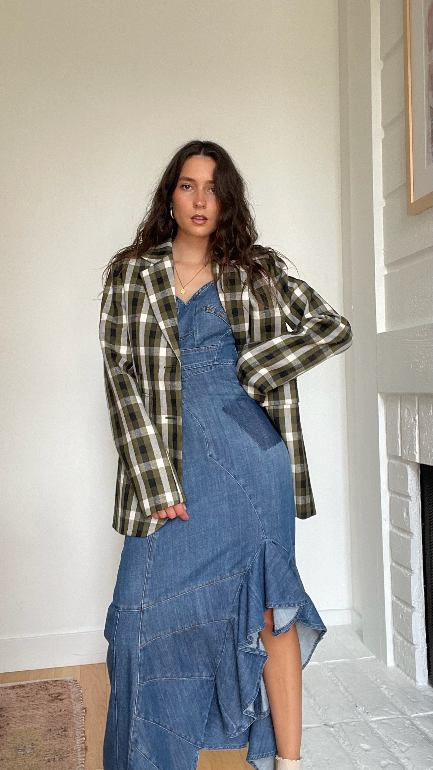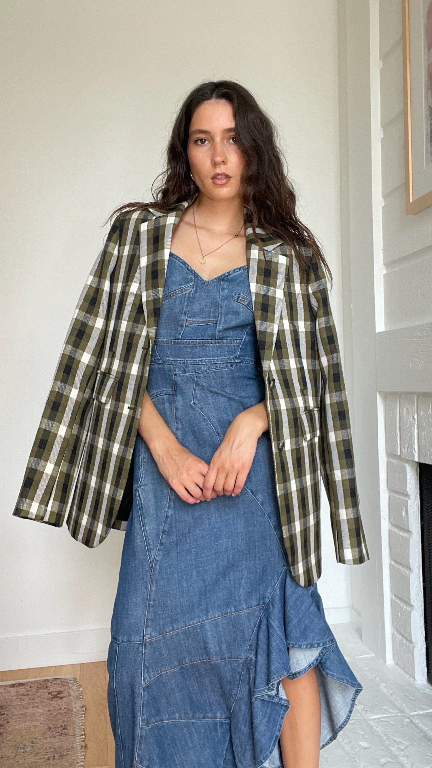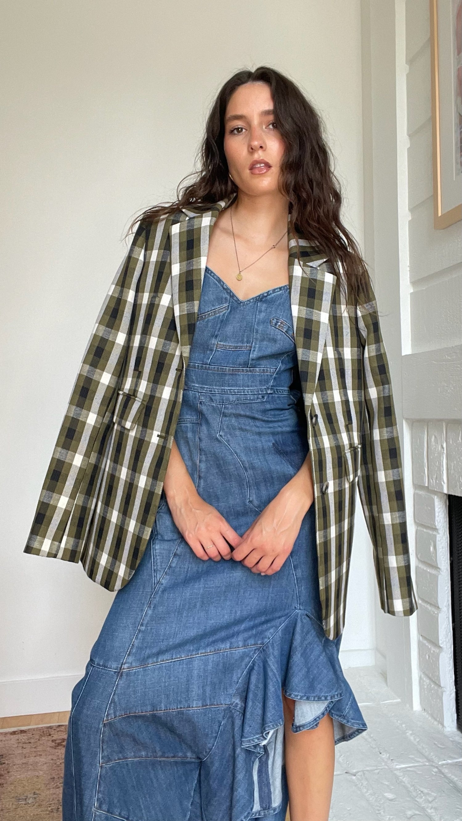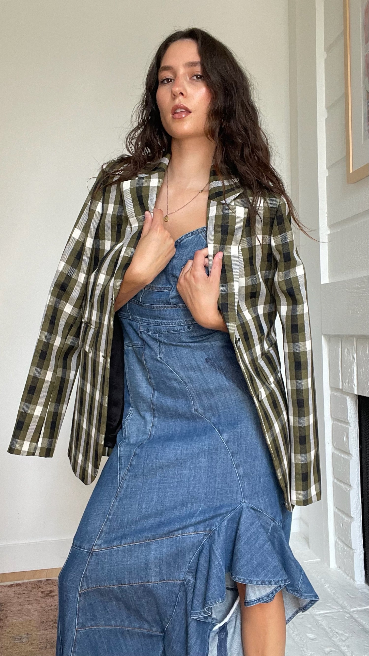 Loewe plaid blazer. Pointed collar. Button closure. Beautiful colorway in kaki, cream and black. Designer size 36.