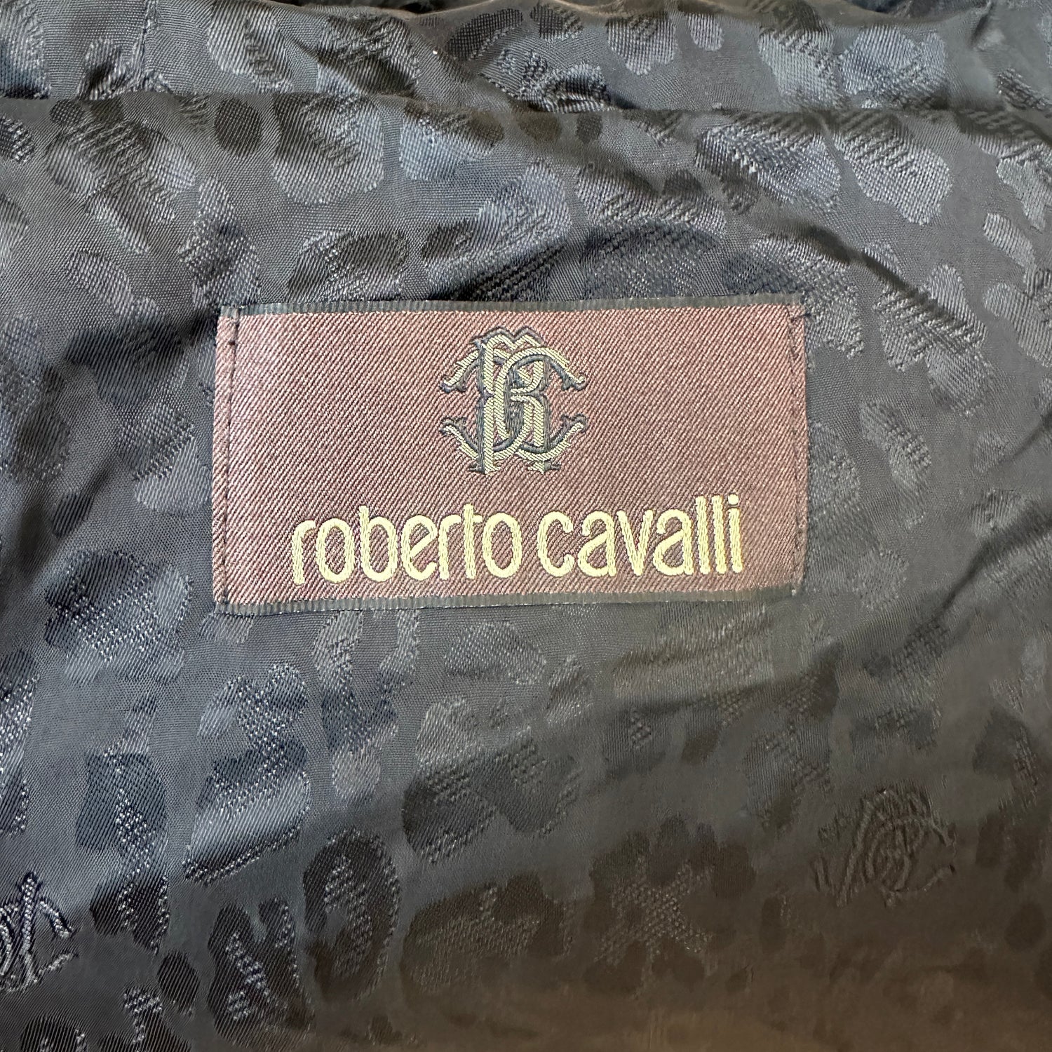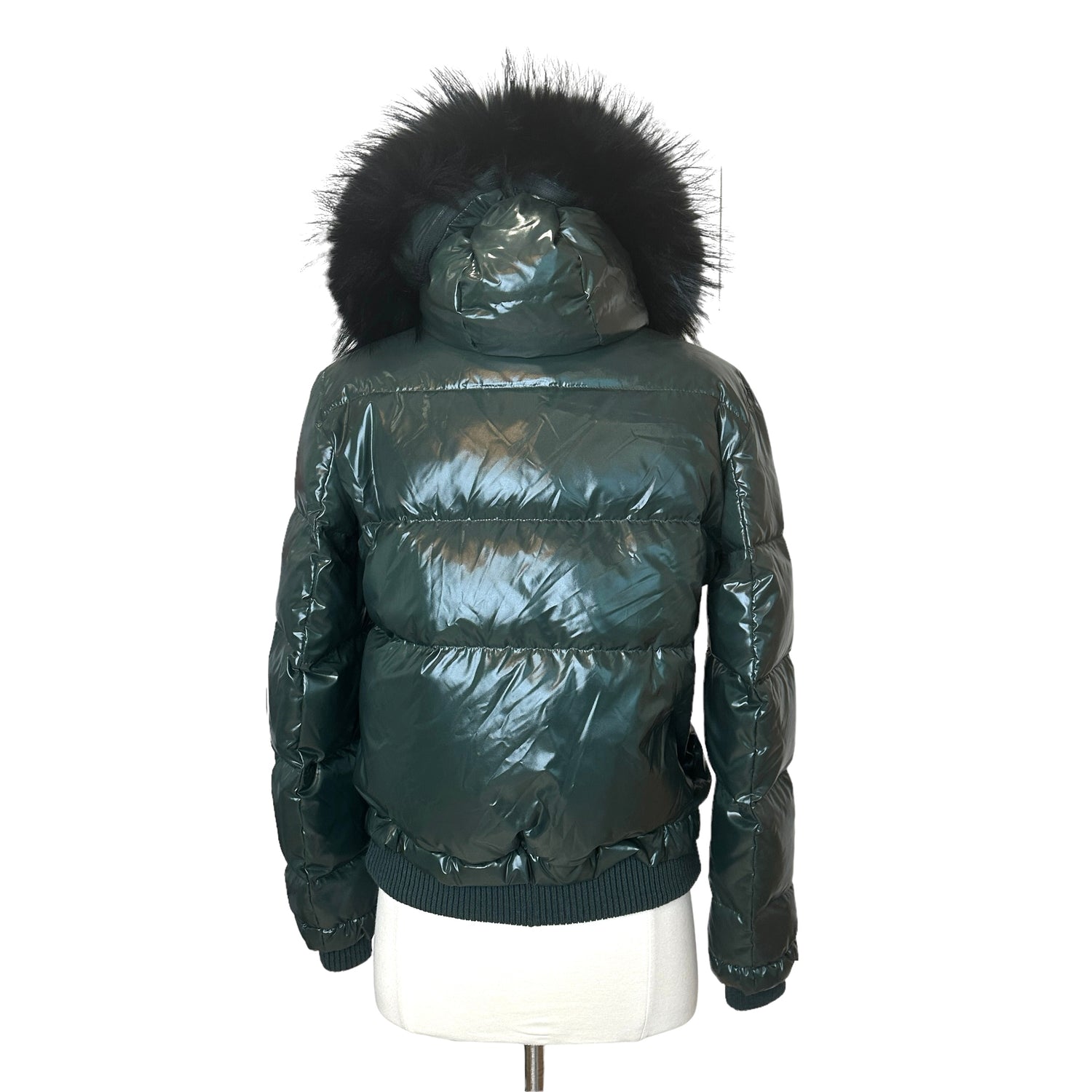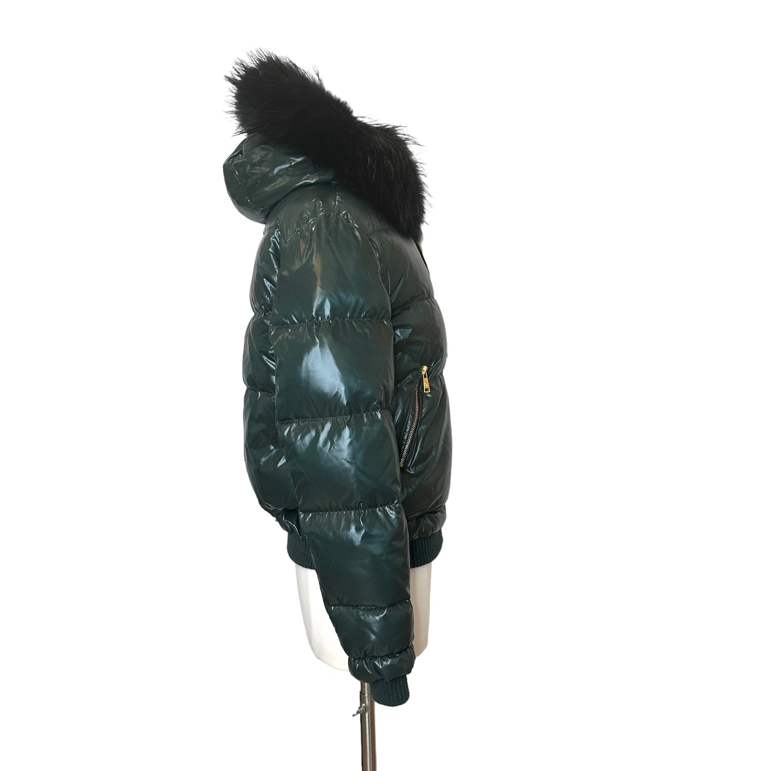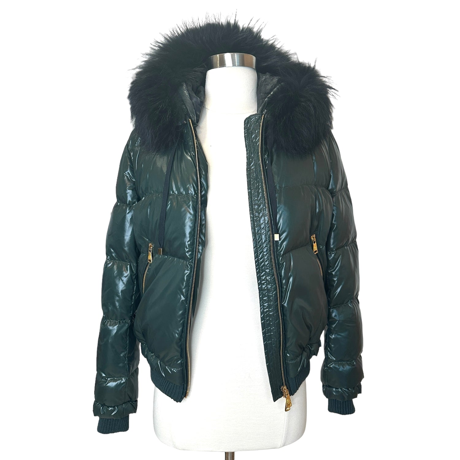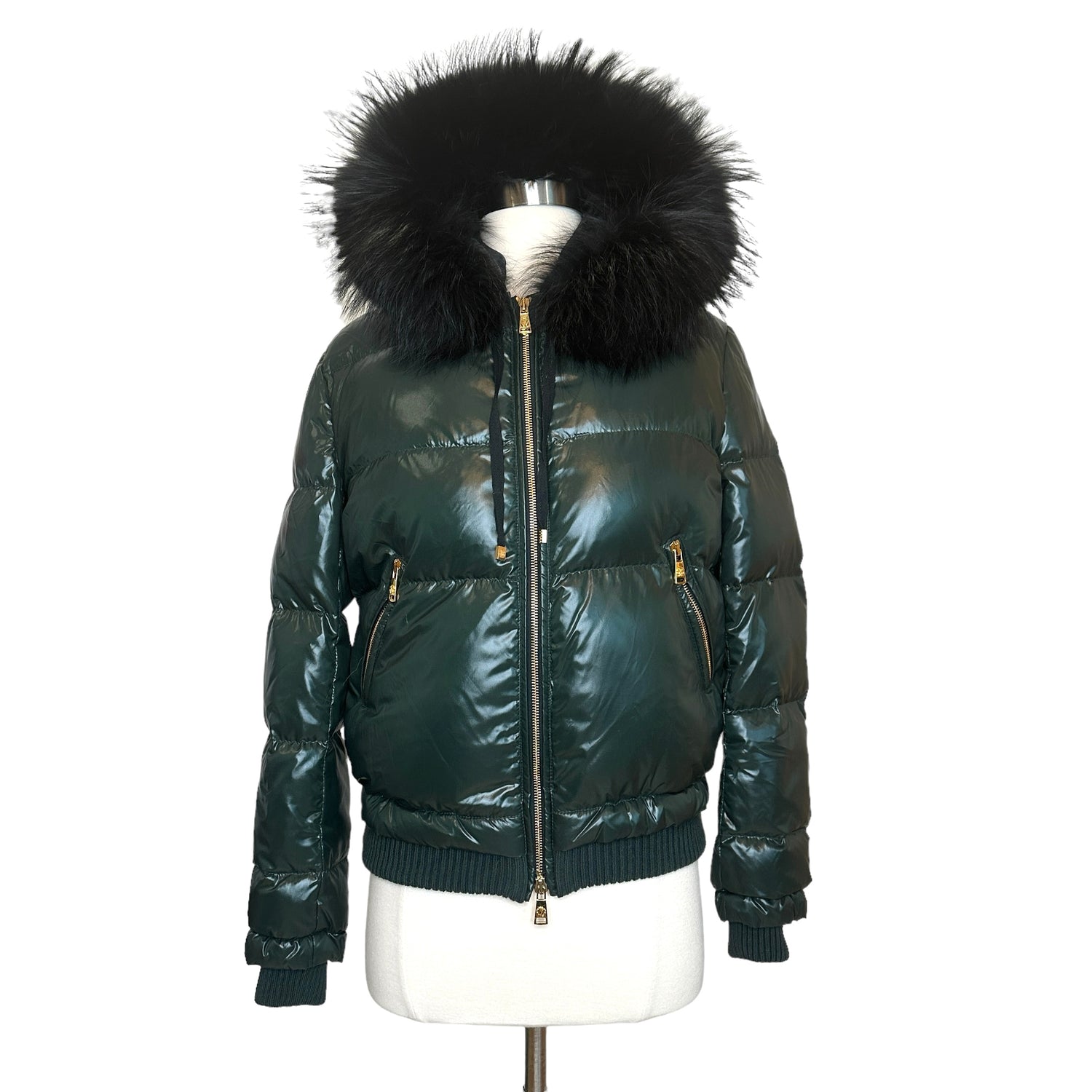 Roberto Cavalli puffer coat. Dark green goose down filled coat. Black fur collar at hood. Removable fur collar. Zipper closure at front. Zipper pocket. Gold-tone hardware. Designer size 38.